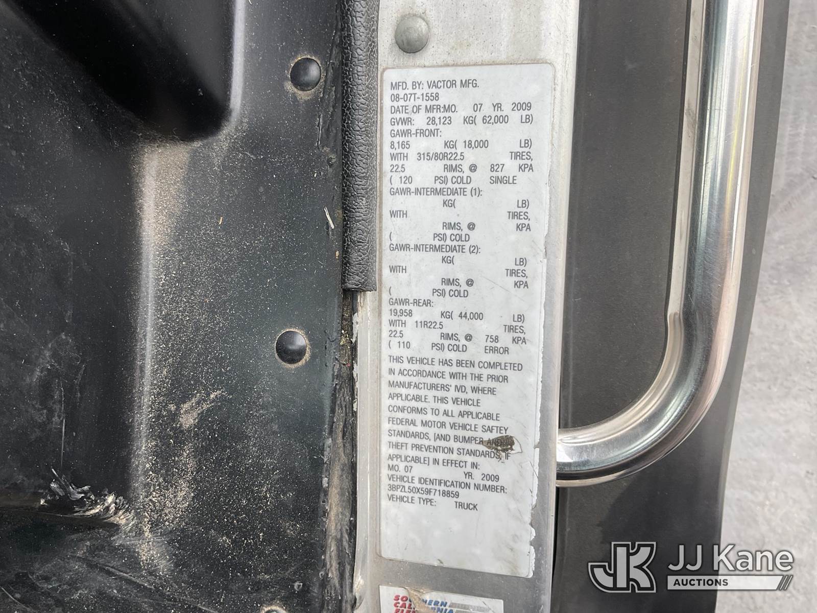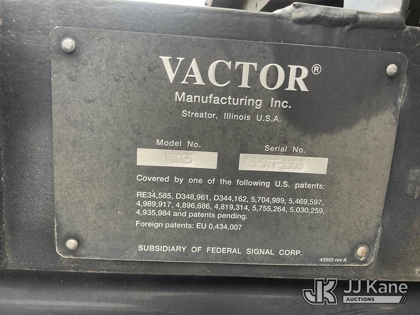 Vactor F8025, Water Jetter s/n 08-07T-1558, with steel water storage tank, high pressure water pump and front mounted hose reel, mounted on 2009 Peterbilt 320 T/A Vactor/Sewer Jet Rodder Truck, 8.9L L6 DIESEL 6X4, Auto, (034,001 miles) (Runs, Moves & Operates) (Reads 6,022 hours) This is a Titled Item NOTE: This unit is being sold AS IS/WHERE IS via Timed Auction and is located in Jurupa Valley, CA. Inspection & preview days for this unit are the 2 business days prior to the first day of items closing for this auction, item is located at 4510 Muth Way Jurupa Valley, CA 92509 and hours of operations are 8a-4p. For pre-sale questions, please contact please contact Office Staff @ (310) 353-7140. Dealer License Number 45696. (Buyer is responsible for removal. Assistance by consignor or JJ Kane Auctions is not assured.)