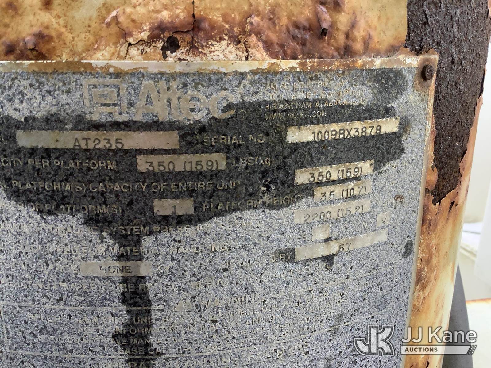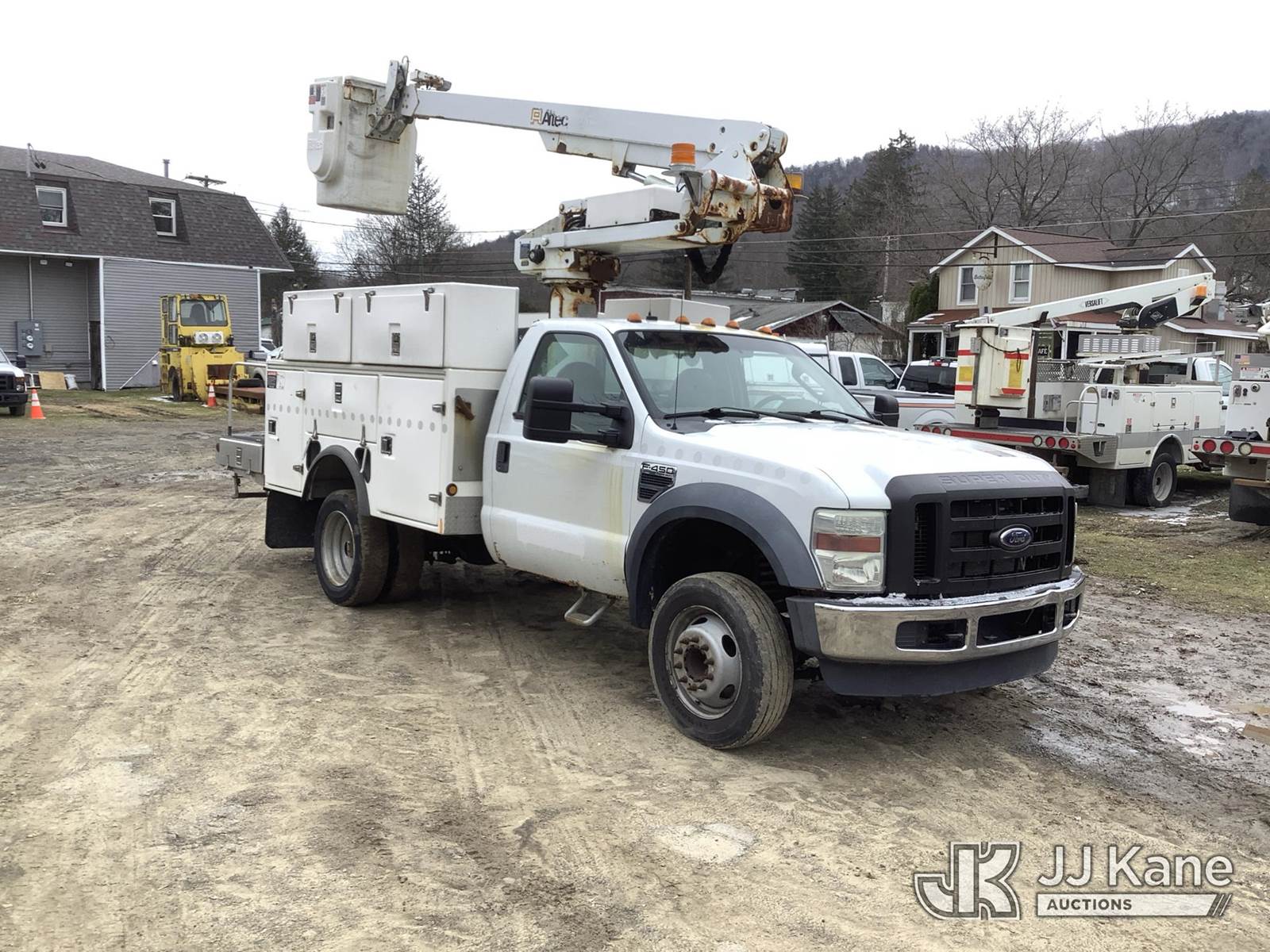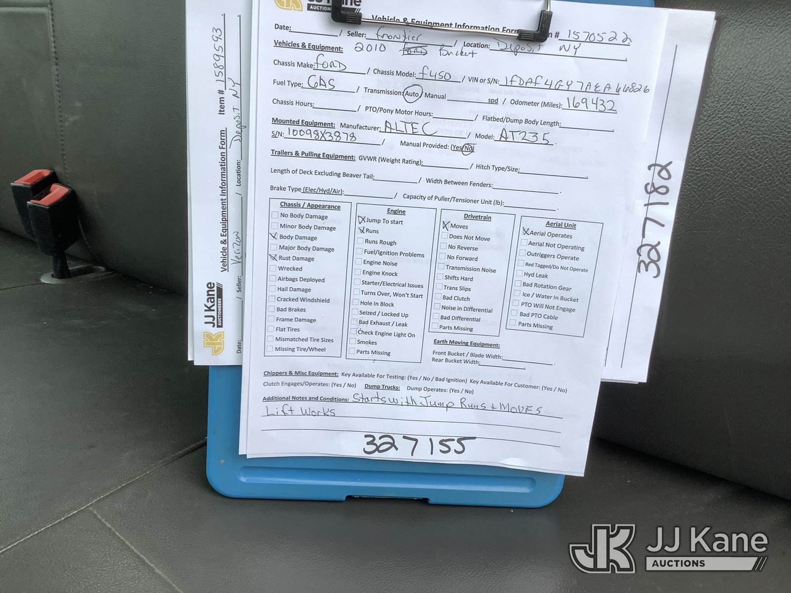 Altec AT235, 40 ft, Articulating & Telescopic Non-Insulated Bucket Truck s/n 1009BX3878, with Single-Man Bucket, mounted behind cab on 2010 Ford F450 2WD Service Truck, 10-cyl gas, Auto, A/C, (169,432 miles) (Runs, Moves & Upper Operates, Jump to Start, Body & Rust Damage) (Removal is by Appointment Only, Buyer MUST make a appointment prior to picking up, Buyer/Transporter Must have PAID IN FULL RELEASE. No onsite assistance available, Please Come prepared.) This is a Titled Item NOTE: This unit is being sold AS IS/WHERE IS via Timed Auction and is located in Deposit, NY. Inspection & preview days for this unit are by appointment only; please contact us at contact@jjkane.com or 84-Go-JJKane for more details. (Missing manuals, See Auction Company for Manufacturers Information to obtain manuals) (Buyer is responsible for removal. Assistance by consignor or JJ Kane Auctions is not assured.)