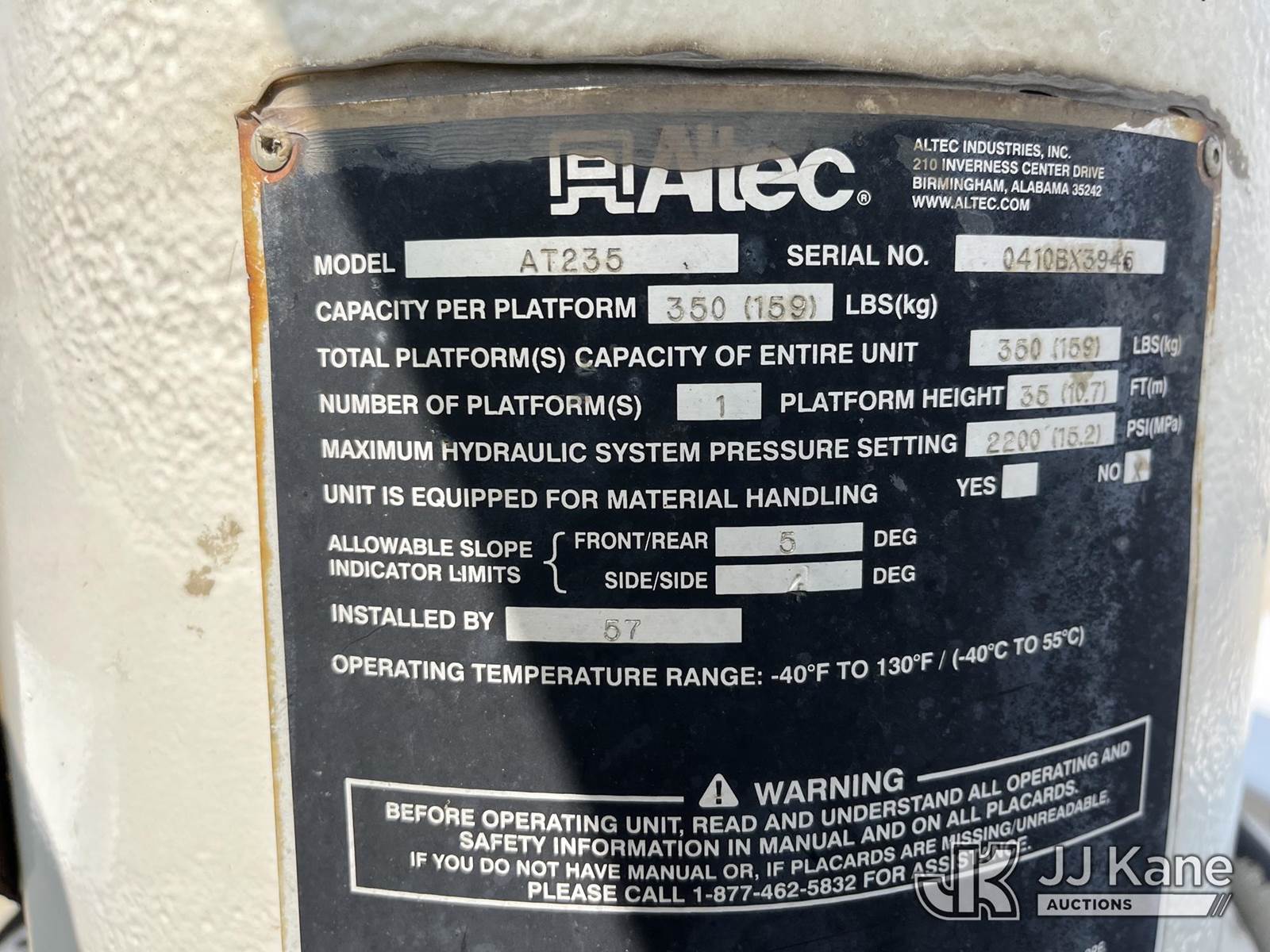 Altec AT235, 40 ft, Articulating & Telescopic Non-Insulated Bucket Truck s/n 0410BX3945, with single-man bucket, mounted behind cab on 2010 Ford F450 Service Truck, 6.4L V8 Turbo Diesel, RWD, Automatic, A/C, (144,760 miles) (Runs Rough & Moves, Jump To Start, Engine Noise, Stalls, Upper Unit Untested, Condition Unknown, Seller States: Needs New Engine & Possibly Turbo) This is a Titled Item NOTE: This unit is being sold AS IS/WHERE IS via Timed Auction and is located in Smock, PA. Inspection & preview days for this unit are the 2 business days prior to the first day of items closing for this auction, item is located at 1000 Franklin Dr Smock, PA 15480 and hours of operations are 7:00 am to 3:30 pm. For pre-sale questions, please contact Alaina White @ (724) 562-2575 or Alaina.White@JJKane.com. (Manuals provided in cab) (Buyer is responsible for removal. Assistance by consignor or JJ Kane Auctions is not assured.)