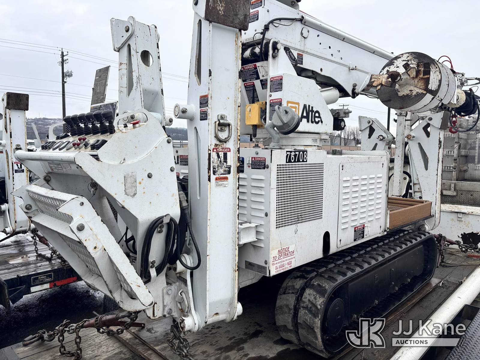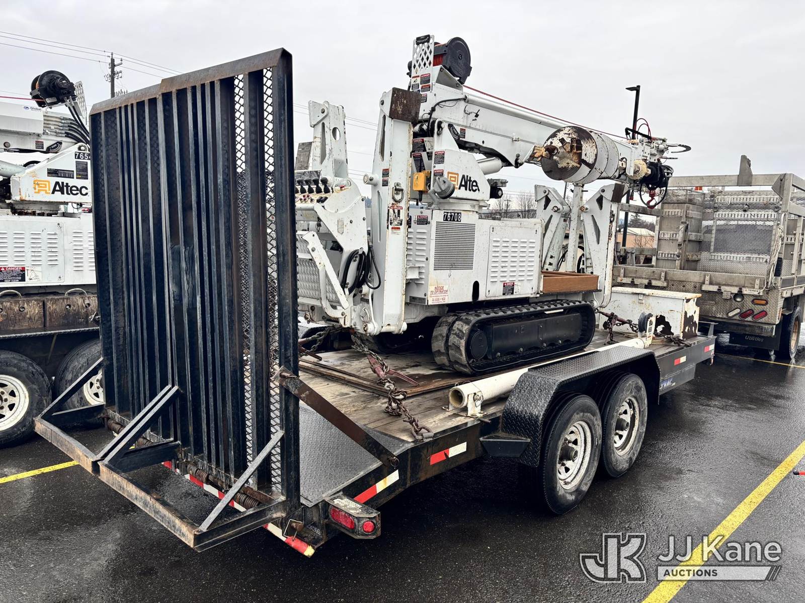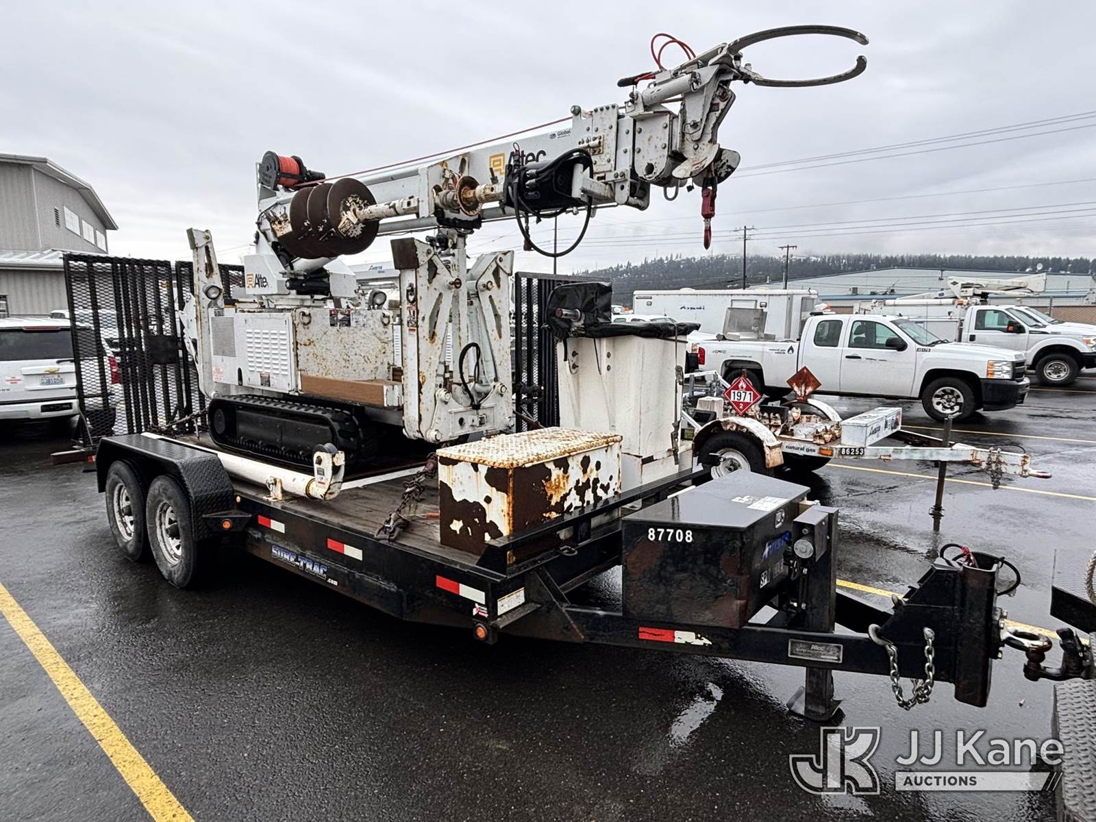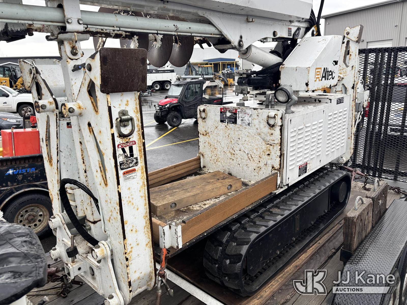 Altec DB37, 3,800 Lb Back Yard Digger Derrick s/n 0510ET0171, with 37ft sheave height, heel winch, pole guides, wireless remote, pin-on bucket, mounted on 2010 Tracked Backyard Carrier, Kubota diesel, Hydrostatic, with rubber tracks, four hydraulic outriggers, hydraulic tool lines, Sells With Support Trailer, ID 1595557.(Equipment & Trailer Price Will Be Split Out On Invoice To Reflect 80/20, Equipment To Trailer Price Ratio For Tax Purposes.) (Runs, Moves & Operates) (Reads 923 hours) NOTE: This unit is being sold AS IS/WHERE IS via Timed Auction and is located in Post Falls, ID. Inspection & preview days for this unit are by appointment only; please contact us at contact@jjkane.com or 84-Go-JJKane for more details. (Missing manuals, See Auction Company for Manufacturers Information to obtain manuals) (Buyer is responsible for removal. Assistance by consignor or JJ Kane Auctions is not assured.)