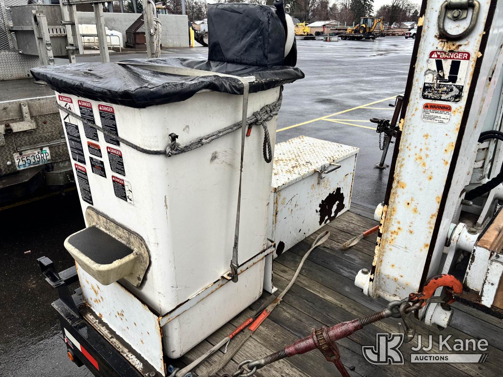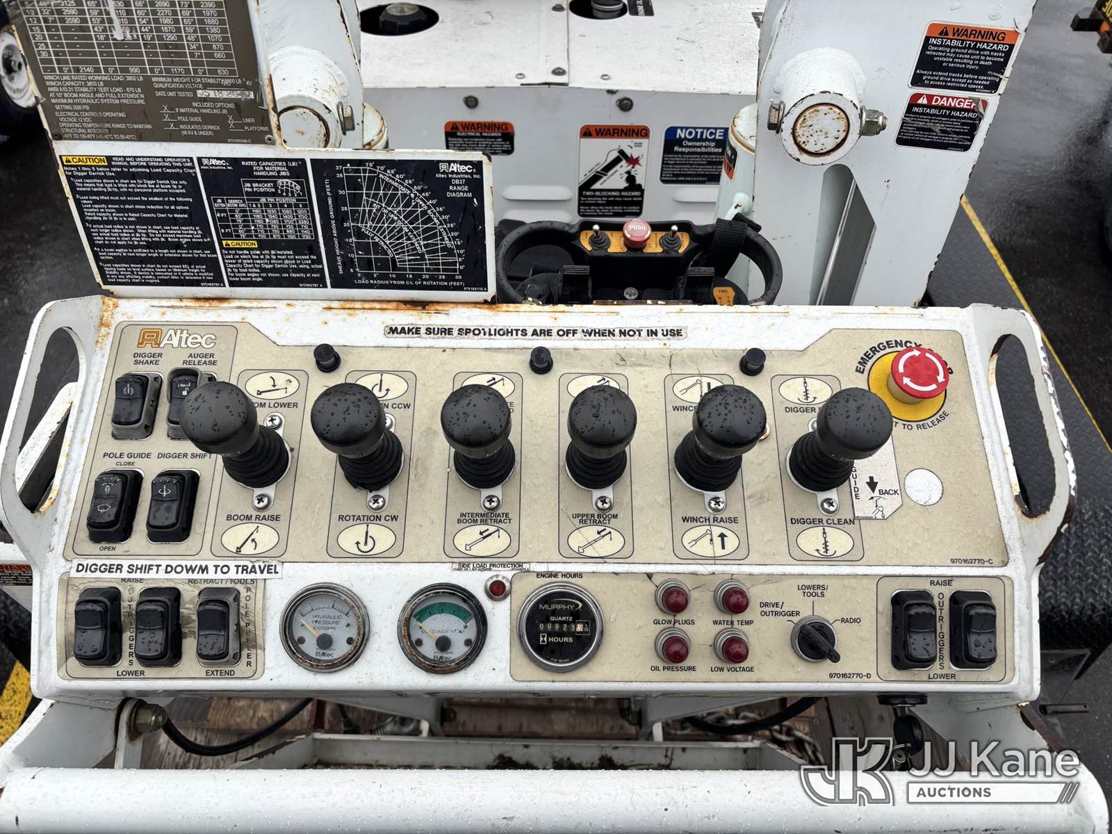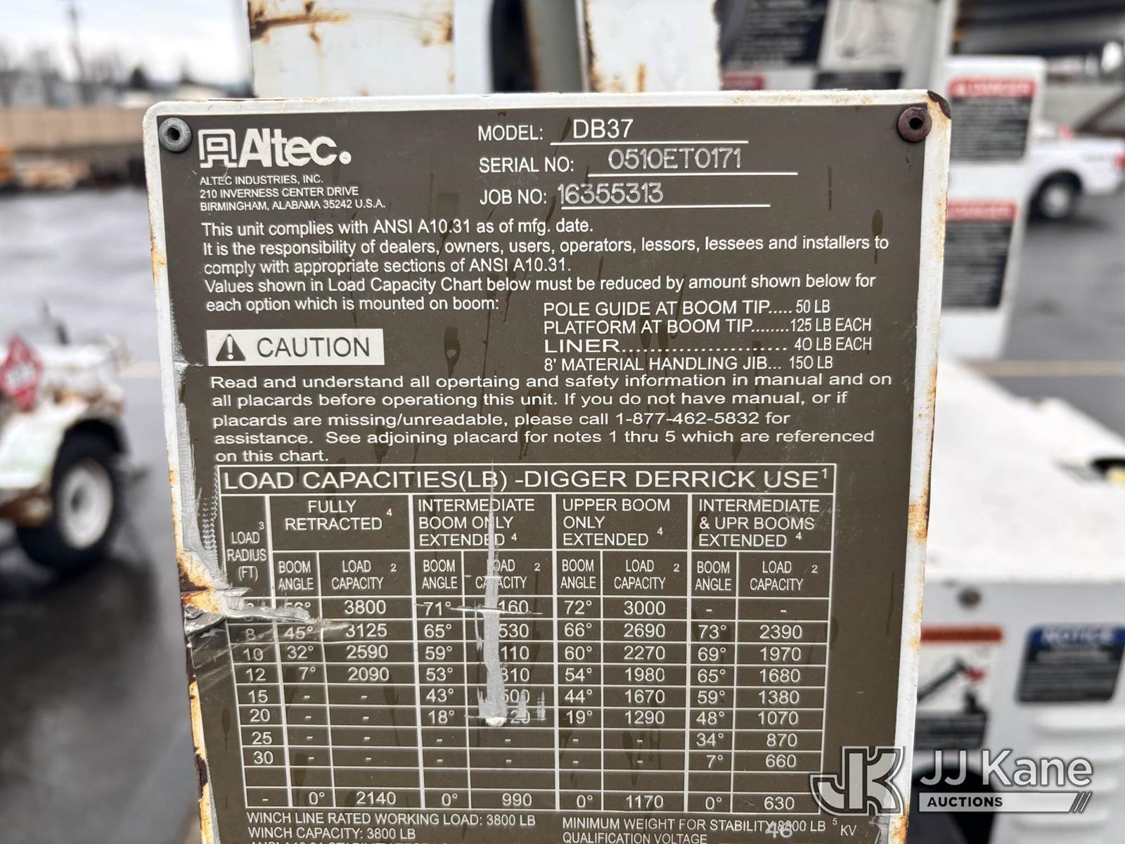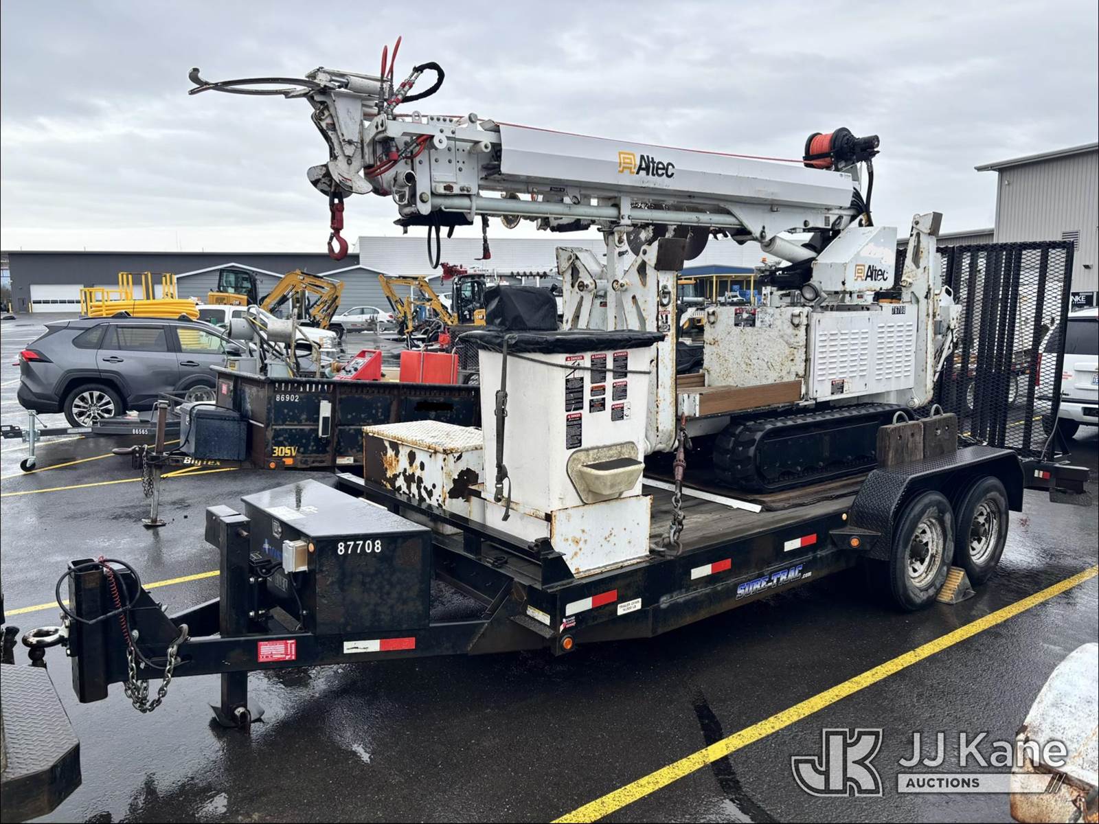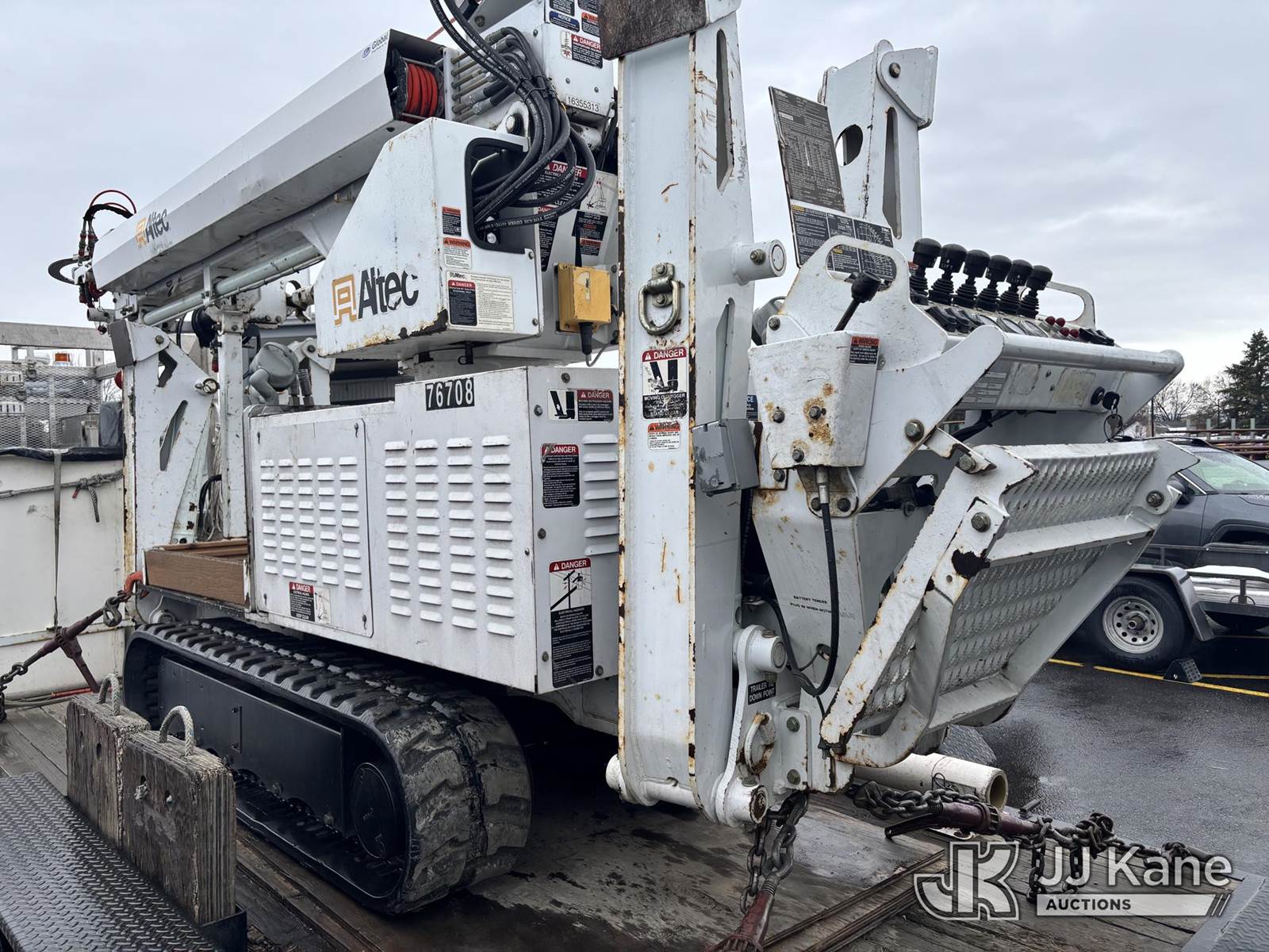 Altec DB37, 3,800 Lb Back Yard Digger Derrick s/n 0510ET0171, with 37ft sheave height, heel winch, pole guides, wireless remote, pin-on bucket, mounted on 2010 Tracked Backyard Carrier, Kubota diesel, Hydrostatic, with rubber tracks, four hydraulic outriggers, hydraulic tool lines, Sells With Support Trailer, ID 1595557.(Equipment & Trailer Price Will Be Split Out On Invoice To Reflect 80/20, Equipment To Trailer Price Ratio For Tax Purposes.) (Runs, Moves & Operates) (Reads 923 hours) NOTE: This unit is being sold AS IS/WHERE IS via Timed Auction and is located in Post Falls, ID. Inspection & preview days for this unit are by appointment only; please contact us at contact@jjkane.com or 84-Go-JJKane for more details. (Missing manuals, See Auction Company for Manufacturers Information to obtain manuals) (Buyer is responsible for removal. Assistance by consignor or JJ Kane Auctions is not assured.)