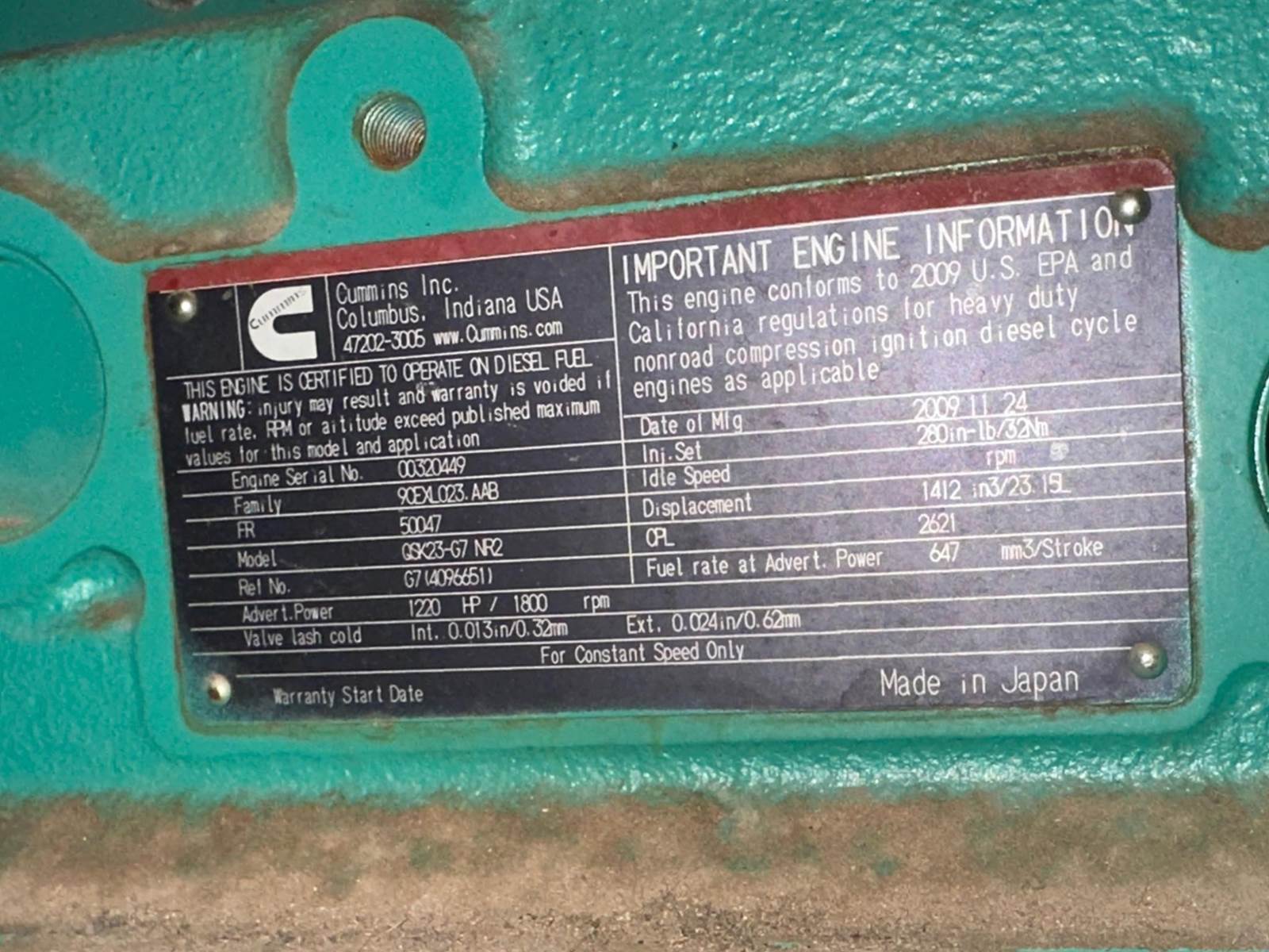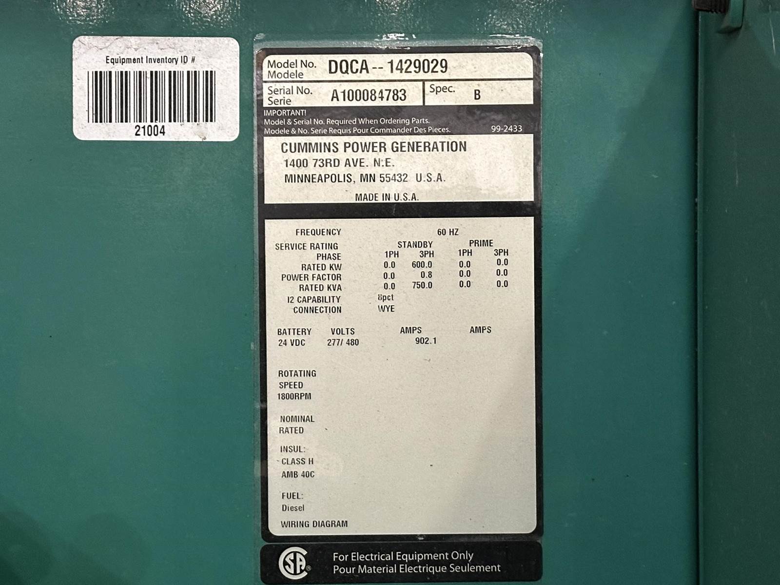 Cummins 600 kW standby (545 kW prime) diesel generator set, model DQCA, SN-A100084783. Cummins QSK23-G7 NR2 engine rated 1220 HP at 1800 RPM, SN-00320449, EPA Tier 2 emissions. 3/60/277/480V, 12 lead reconnectable to other voltages. No Breaker. PMG permanent magnet generator. Oversized generator end rated 900 kW. UL 2200 listed package. PowerCommand 2.3 digital control panel. Coolant heater. No batteries. Open power unit with engine driven radiator. TBD Hours. Year 2010. Load test pending. Overall dimensions 65W x 174L x 87H on 6H blocks, 16,500 lbs. FOB Waukesha, WI
