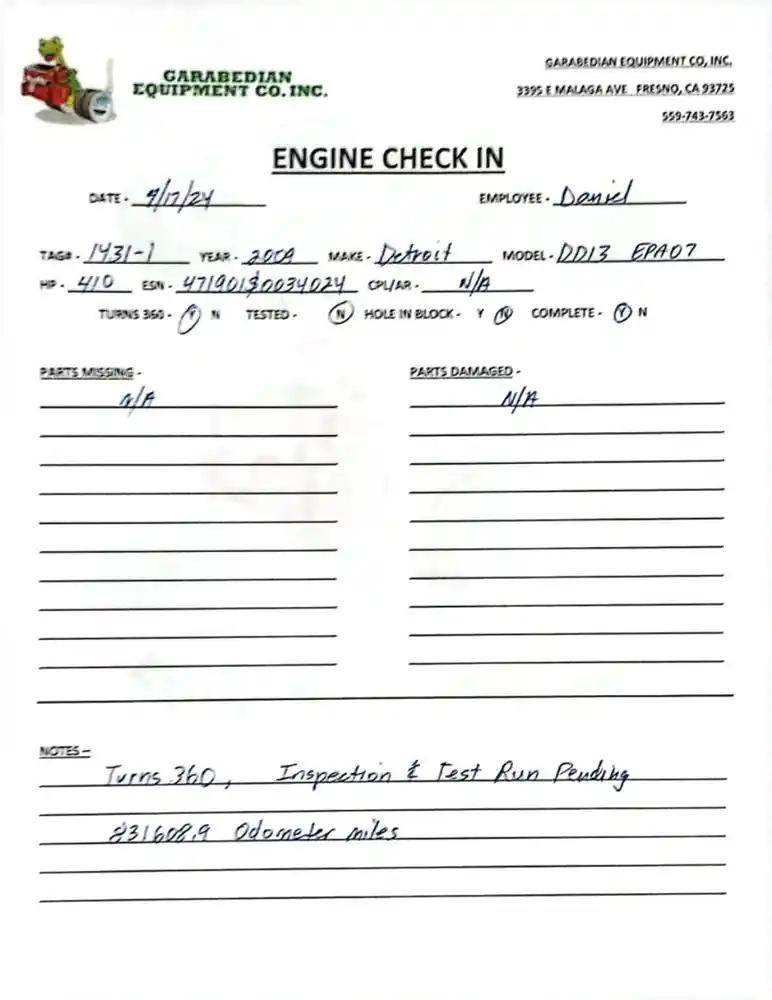 DD13, 410 HP, S/N 471901S0034024, 831,608.9 Odometer Miles, Complete, Engine runs.