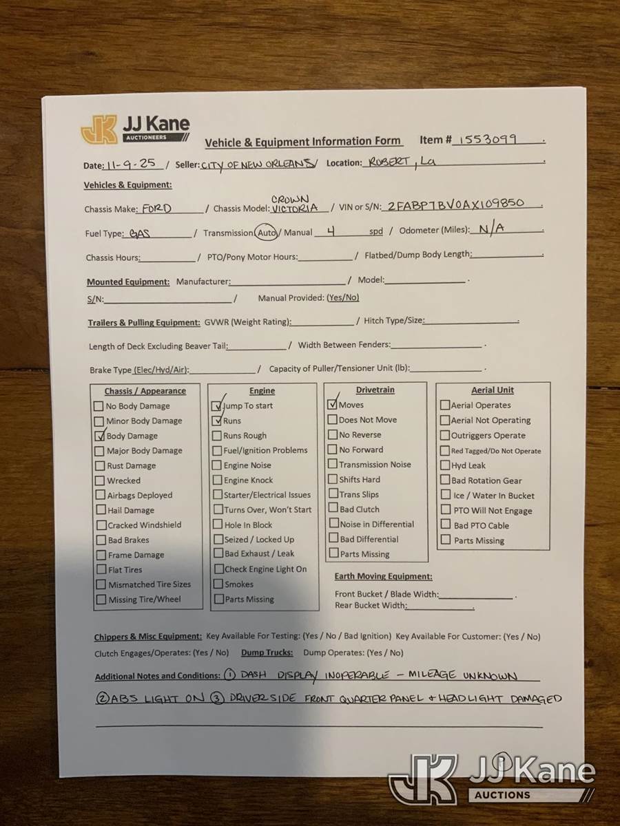 2010 Ford Crown Victoria Police Interceptor 4-Door Sedan, 4.6L V8 SOHC 16V FFV gas, 4-Speed Automatic, RWD, A/C, True Mileage Unknown (Runs & Moves) (Jump To Start, Dash Display Inoperable, ABS Light On, Driver Side Headlight Broken, Body Damage) This is a Titled Item NOTE: This unit is being sold AS IS/WHERE IS via Timed Auction and is located in Robert, LA. For more information & removal arrangements please contact Jordan Bane @ jordan.bane@altec.com. License # LA AB-154 (Buyer is responsible for removal. Assistance by consignor or JJ Kane Auctions is not assured.)