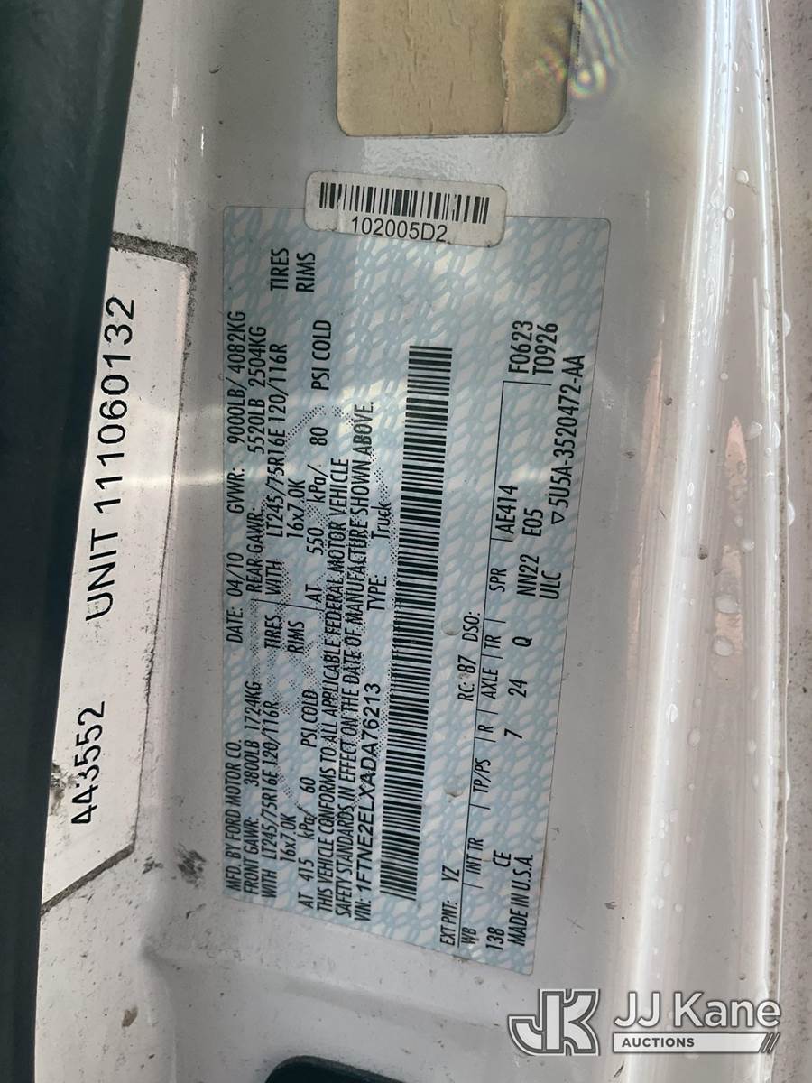 2010 Ford Econoline E-250 Cargo Van, 5.4L V8 SOHC 16V 4-Speed Automatic, RWD, CNG Only, A/C, with ladder rack, (49,714 miles) (Runs & Moves) (Engine Light On, Traction Control Light On, Brake System Issue, Low On Fuel, CNG Tanks Expired 04-2025) (Bidding Restricted to Licensed Vehicle Dealers Only), This is a Titled Item NOTE: This unit is being sold AS IS/WHERE IS via Timed Auction and is located in Jurupa Valley, CA. Inspection & preview days for this unit are the 2 business days prior to the first day of items closing for this auction, item is located at 4510 Muth Way Jurupa Valley, CA 92509 and hours of operations are 8a-4p. For pre-sale questions, please contact please contact Office Staff @ (310) 353-7140. Dealer License Number 45696. (Buyer is responsible for removal. Assistance by consignor or JJ Kane Auctioneers is not assured.)