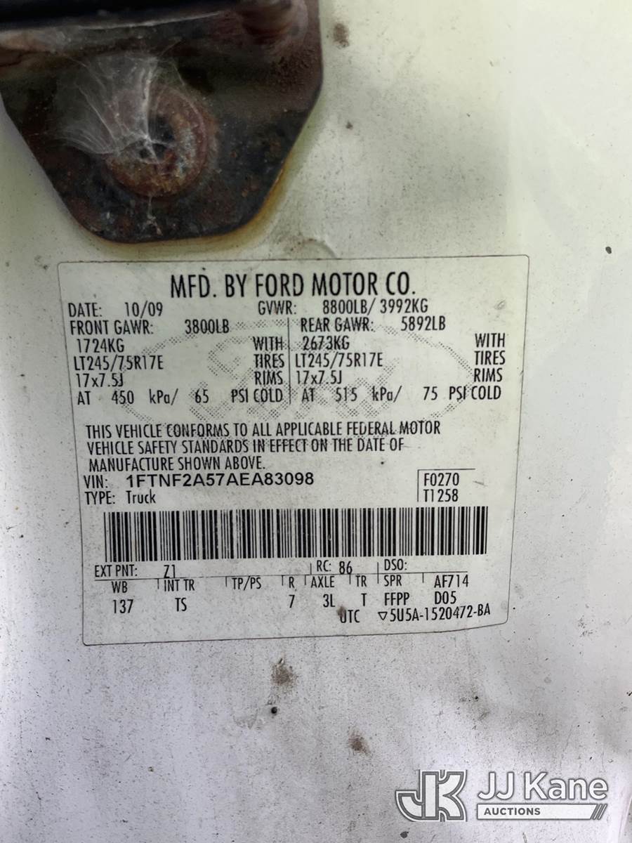 2010 Ford F250 Enclosed Service Truck, 5.4L V8 SOHC 16V gas, Auto, RWD, A/C, (189,628 miles) (Runs & Moves) (Body/Rust Damage, Ignition Tumbler Difficult) (Reads 20,041 hours) This is a Titled Item NOTE: This unit is being sold AS IS/WHERE IS via Timed Auction and is located in South Beloit, IL. For specific technical information or questions about this item, contact Derek Eklund at (815) 570-1766 or (derek.eklund@jjkane.com). For load-out and pick information, reference the hauler sheet sent out after purchase. These items are used and may contain defects that are not immediately detectable. Text descriptions and photos given are meant to be used as a guide only. The conditions are provided by the consignor. The Buyer is responsible for inspecting the item before bidding. All information provided is believed to be correct but no warranty as such is either intended or implied. All items are sold AS IS - WHERE IS AND WITH ALL FAULTS AND DEFECTS THEREIN. (Buyer is responsible for removal. Assistance by consignor or JJ Kane Auctions is not assured.)