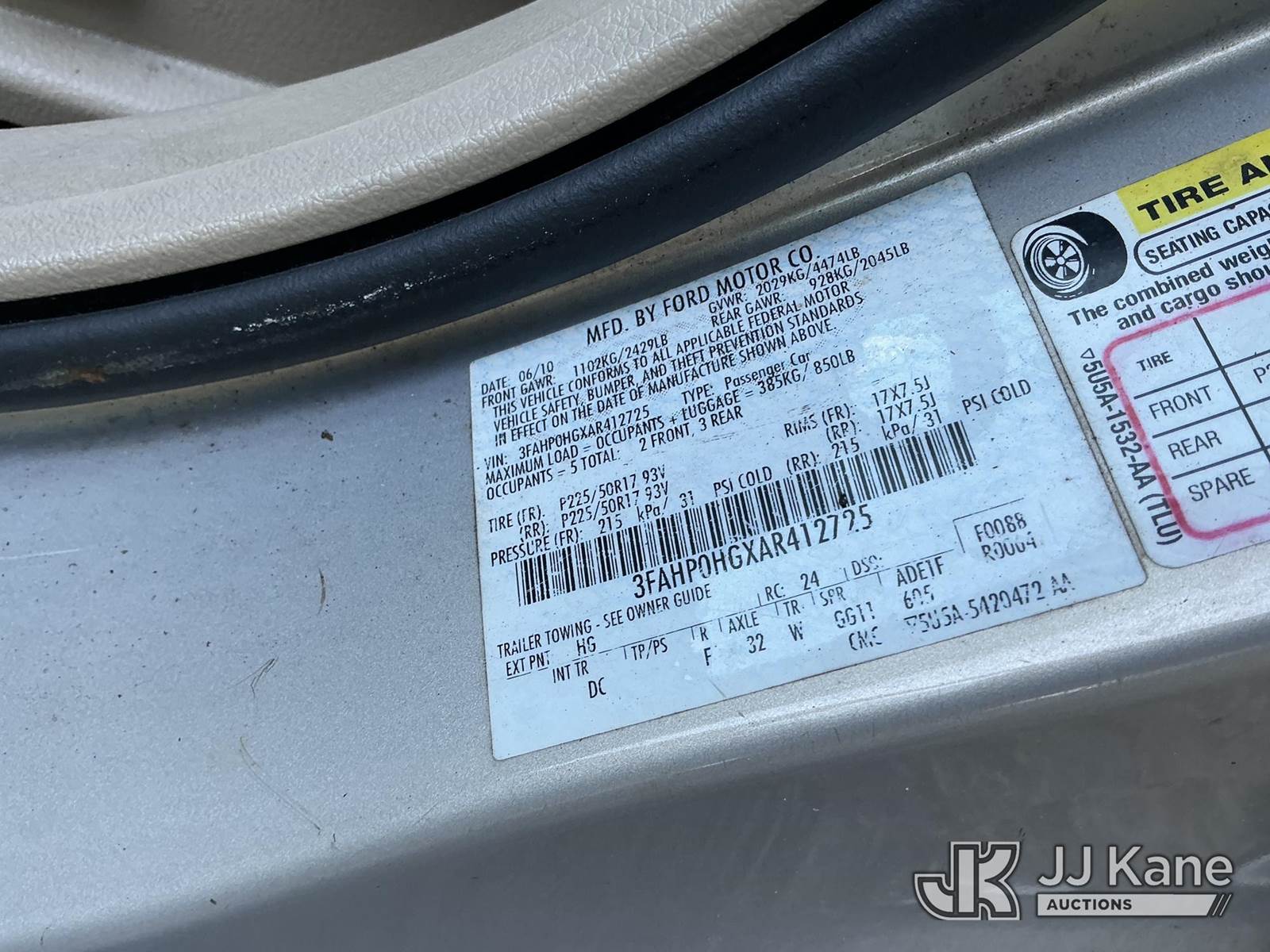 2010 Ford Fusion 4-Door Sedan, 6-cyl gas, Auto, A/C, (83,458 miles) State of FL Unit (Not Running, Condition Unknown) (Missing Battery, Paint Damage) (FL Residents Purchasing Titled Items - tax, title & registration fees will be collected at the maximum rate of $400.00 under 25,999 and $800.00 for Over 26,000 and $250.00 trailers - Proof of insurance is mandatory; Out of State Residents Purchasing Title Items - tax will be collected based upon your state rate.) This is a Titled Item NOTE: This unit is being sold AS IS/WHERE IS via Timed Auction and is located in Thonotosassa, FL. Inspection & preview days for this unit are the 2 business days prior to the first day of items closing for this auction, item is located at 11720 N US 301 Thonotosassa, Fl 33592 and hours of operations are 8a-4p. For pre-sale questions, please contact Office Staff @ (813) 986-2485. (Buyer is responsible for removal. Assistance by consignor or JJ Kane Auctions is not assured.)