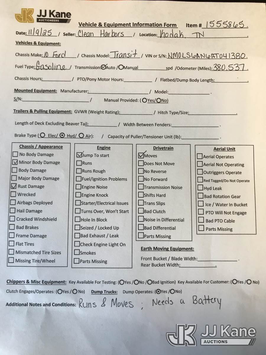 2010 Ford Transit Connect Cargo Van, 4-cyl gas, 4-Speed Automatic, A/C, (380,537 miles) (Runs & Moves) (Jump To Start, Rust Damage, Minor Body Damage) This is a Titled Item NOTE: This unit is being sold AS IS/WHERE IS via Timed Auction and is located in Kodak, TN. Inspection & preview days for this unit are by appointment only; please contact us at contact@jjkane.com or 84-Go-JJKane for more details. (Buyer is responsible for removal. Assistance by consignor or JJ Kane Auctioneers is not assured.)