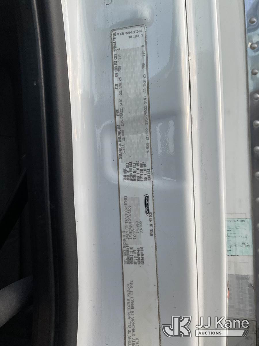 2010 Freightliner Cascadia 113 T/A Van Body Truck, 12.8L L6 DIESEL 10-spd, 4X2, A/C, with lift gate, (348,067 miles) This is a Titled Item NOTE: This unit is being sold AS IS/WHERE IS via Timed Auction and is located in Jurupa Valley, CA. Inspection & preview days for this unit are the 2 business days prior to the first day of items closing for this auction, item is located at 4510 Muth Way Jurupa Valley, CA 92509 and hours of operations are 8a-4p. For pre-sale questions, please contact please contact Office Staff @ (310) 353-7140. Dealer License Number 45696. (Buyer is responsible for removal. Assistance by consignor or JJ Kane Auctioneers is not assured.)