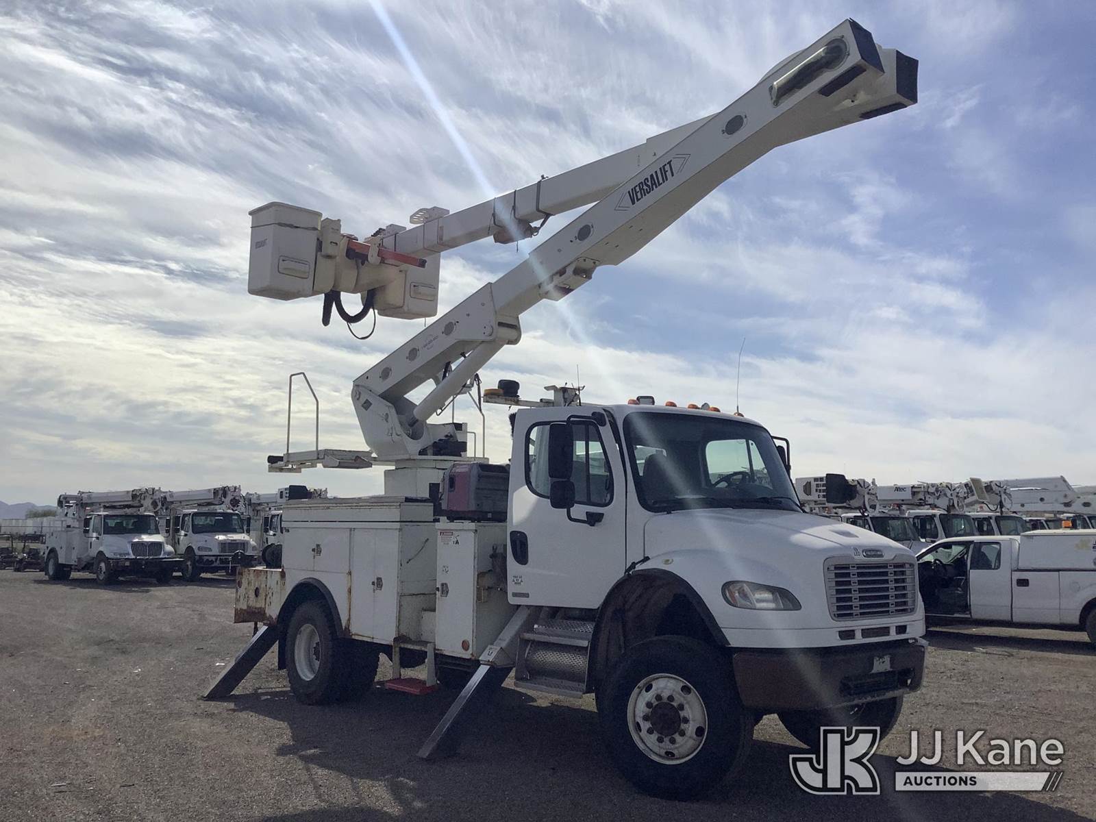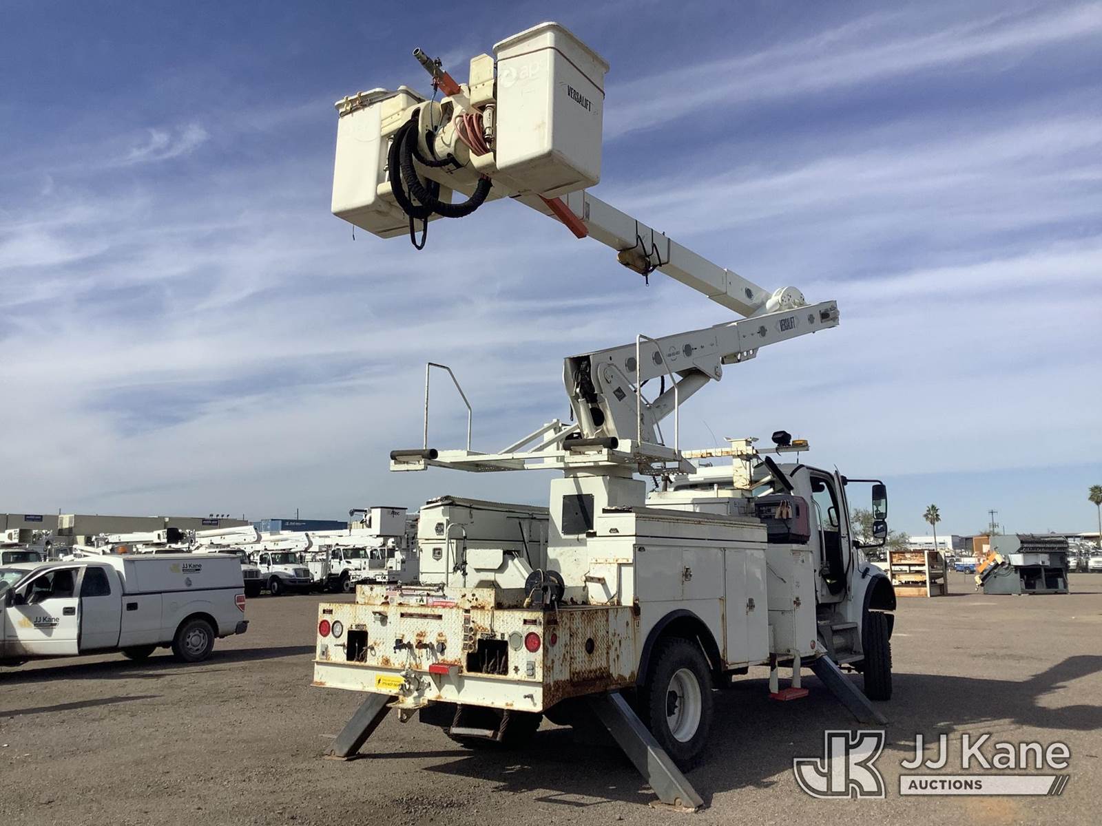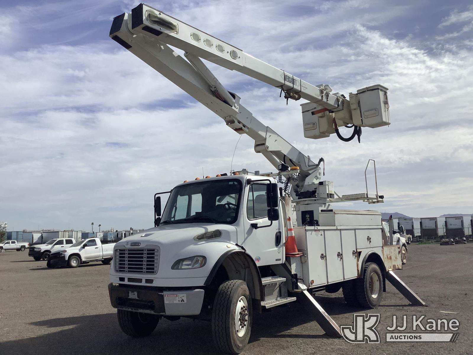 Versalift VO, Over-Center Material Handling Bucket with double single man buckets, rear mounted on 2010 Freightliner M2 106 Utility Truck, 8.3L diesel, 4X4, Auto, A/C, (145,548 miles) (Runs, Moves & Upper Operates) (Tractor ABS Light On, Upper Unit Serial Placard Torn & Stamp Could Not Be Found, Operator Manual in Cab) This is a Titled Item NOTE: This unit is being sold AS IS/WHERE IS via Timed Auction and is located in Phoenix, AZ. Inspection & preview days for this unit are the 2 business days prior to the first day of items closing for this auction, item is located at 2505 W Durango St Phoenix, AZ 85009 and hours of operations are 8a-4p. For pre-sale questions, please contact Andrew Espinoza @ (602) 393-8107. (Manuals provided in cab) (Buyer is responsible for removal. Assistance by consignor or JJ Kane Auctions is not assured.)