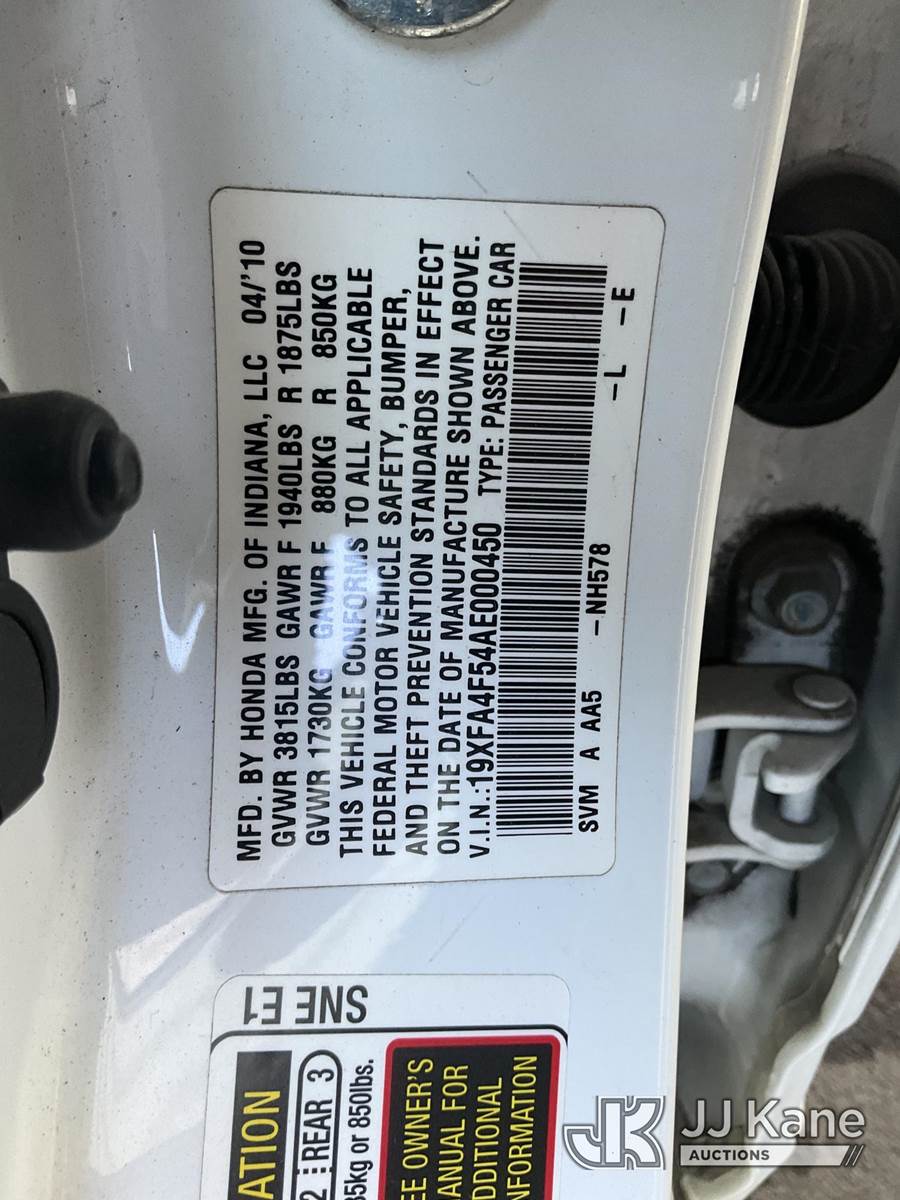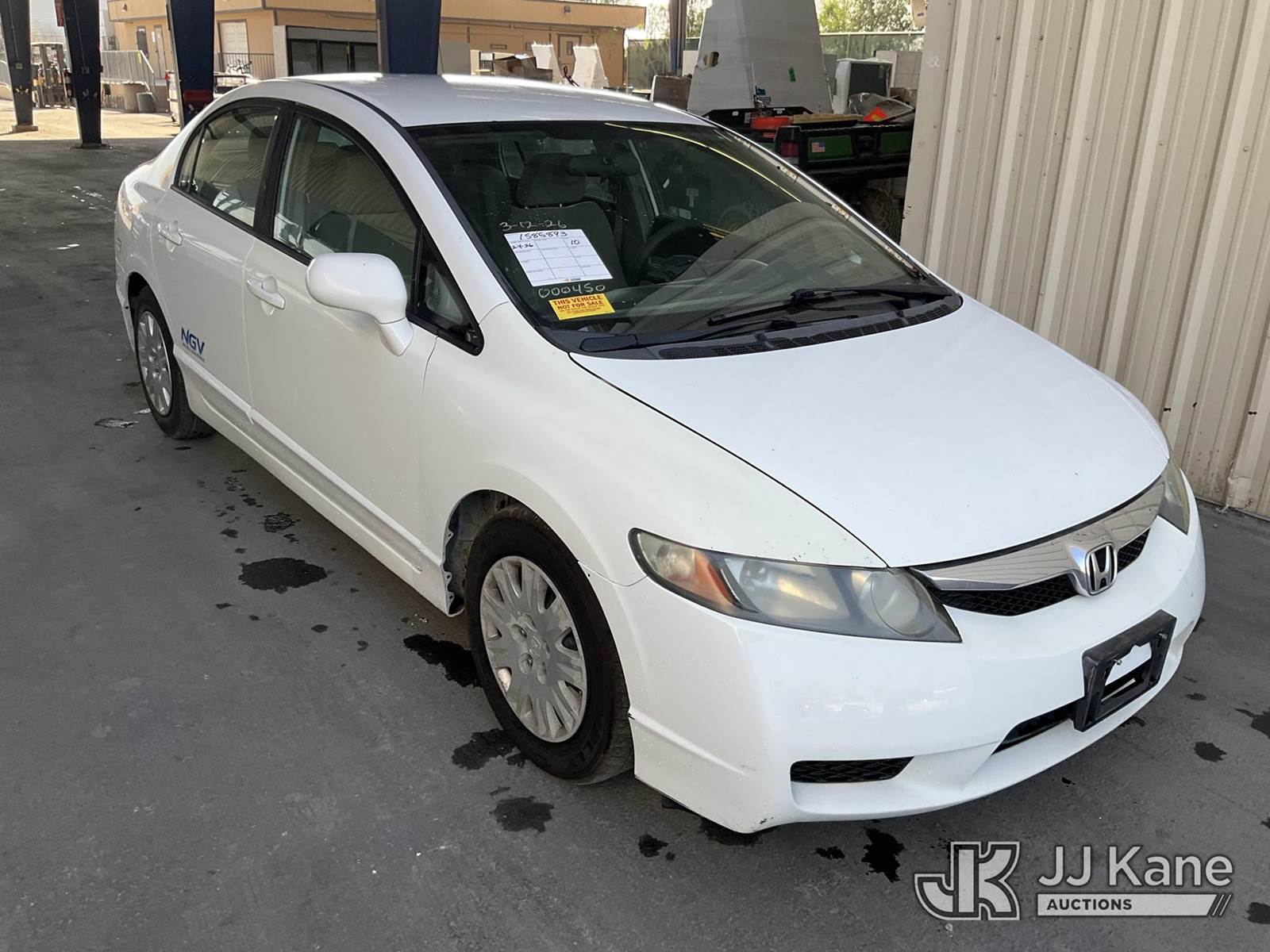 2010 Honda Civic 4-Door Sedan, s/n 19XFA4F54AE000450, 1.8L L4 SOHC 16V CNG FWD, 5-Speed Automatic, A/C, (162,783 miles) (Runs & Moves) (CNG Tanks Expired 01-2025) (Bidding Restricted to Licensed Vehicle Dealers Only), This is a Titled Item NOTE: This unit is being sold AS IS/WHERE IS via Timed Auction and is located in Jurupa Valley, CA. Inspection & preview days for this unit are the 2 business days prior to the first day of items closing for this auction, item is located at 4510 Muth Way Jurupa Valley, CA 92509 and hours of operations are 8a-4p. For pre-sale questions, please contact please contact Office Staff @ (310) 353-7140. Dealer License Number 45696. (Buyer is responsible for removal. Assistance by consignor or JJ Kane Auctions is not assured.)