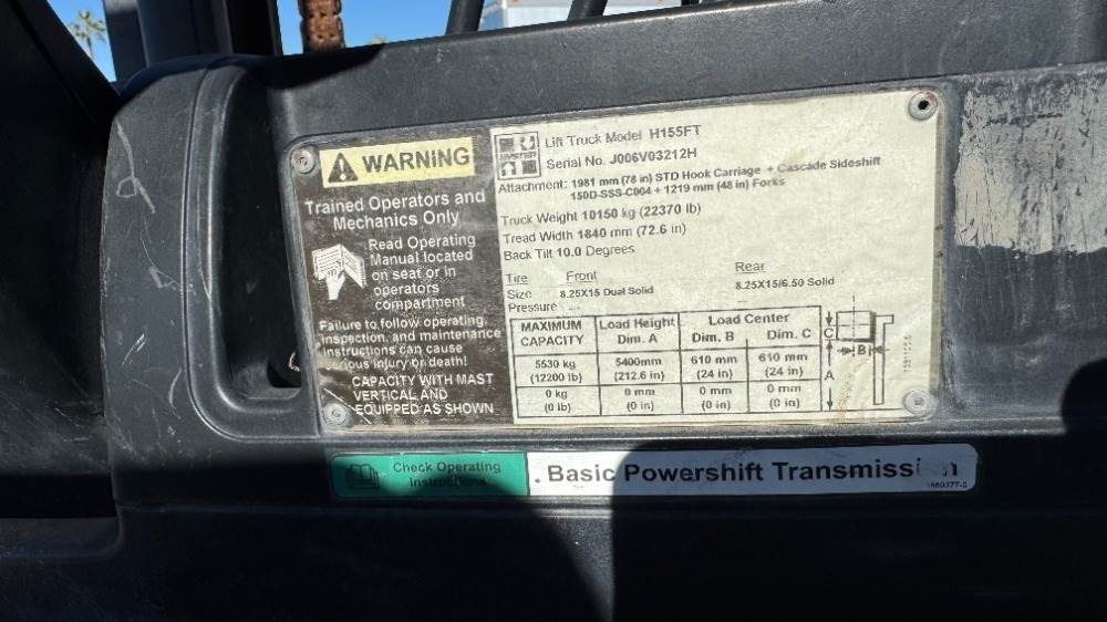 2010 HYSTER H155FT FORKLIFT, 15,500#, 142" mast, 2-stage, 212" lift, sideshift, diesel, canopy, solid tires. s/n:J006V03212H