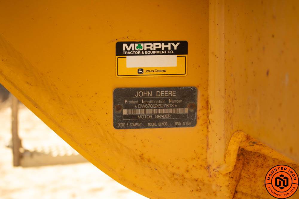2010 DEERE 670G MOTOR GRADER WITH 9700HRS. UNIT IS EQUIPPED WITH A TIER 3 DEERE ENGINE, PUSH BLOCK, DEERE LINK, CAB HEAT/AC, REVERSING FAN, 12FT MOLDBOARD, AND 1400X24 TIRES. UNIT IS TIGHT AND IN GREAT SHAPE FOR THE HOURS. MOSTLY IDLE HOURS ON THIS UNIT.