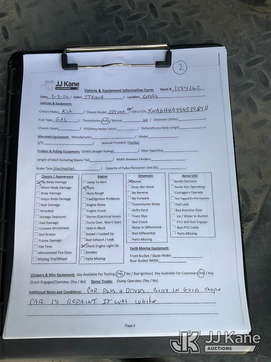 2010 Kia Optima 4-Door Sedan, 6-cyl gas, FWD, 4-Speed Automatic, A/C, (78,012 miles) (Branded Title - Rebuilt From Salvage) (Runs & Moves) (Check Engine Light On) (Branded Title - Rebuilt Vehicle) This is a Titled Item NOTE: This unit is being sold AS IS/WHERE IS via Timed Auction and is located in Grand Junction, CO. For more information & removal arrangements please contact John Larkin @ 720-390-9897. (Buyer is responsible for removal. Assistance by consignor or JJ Kane Auctions is not assured.)