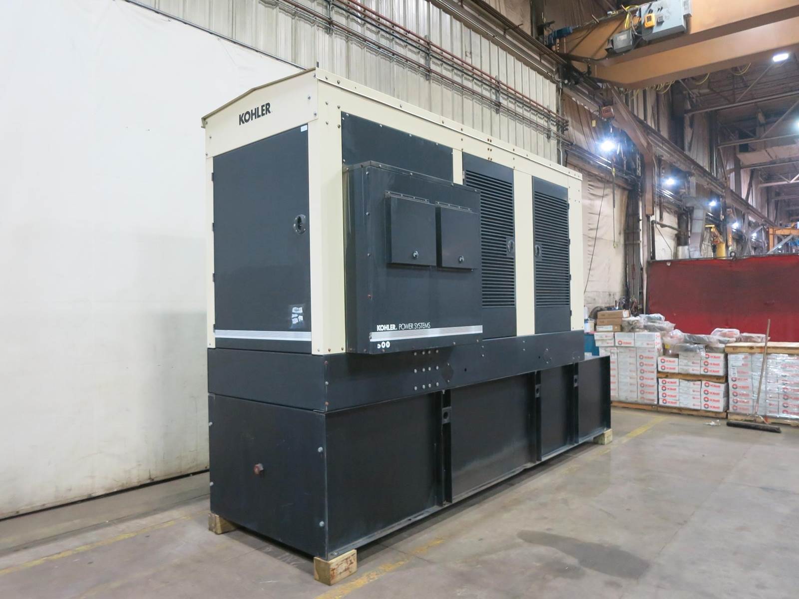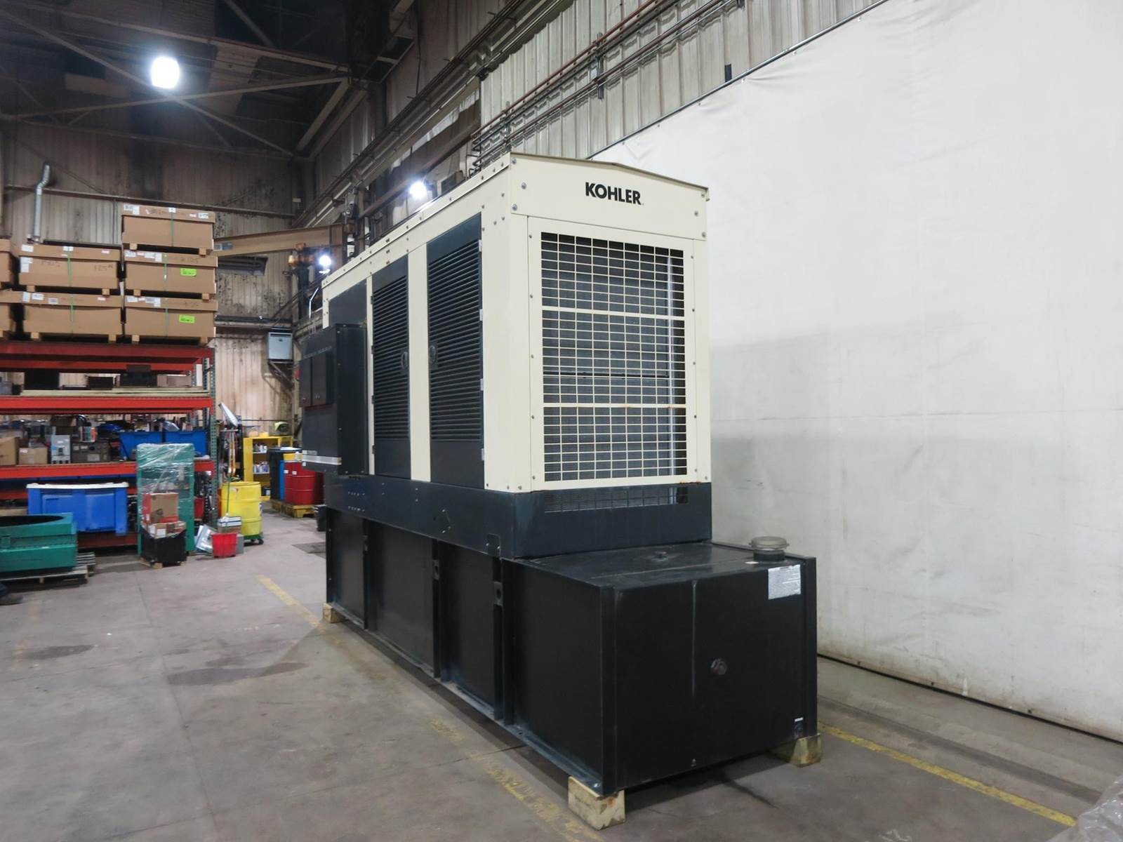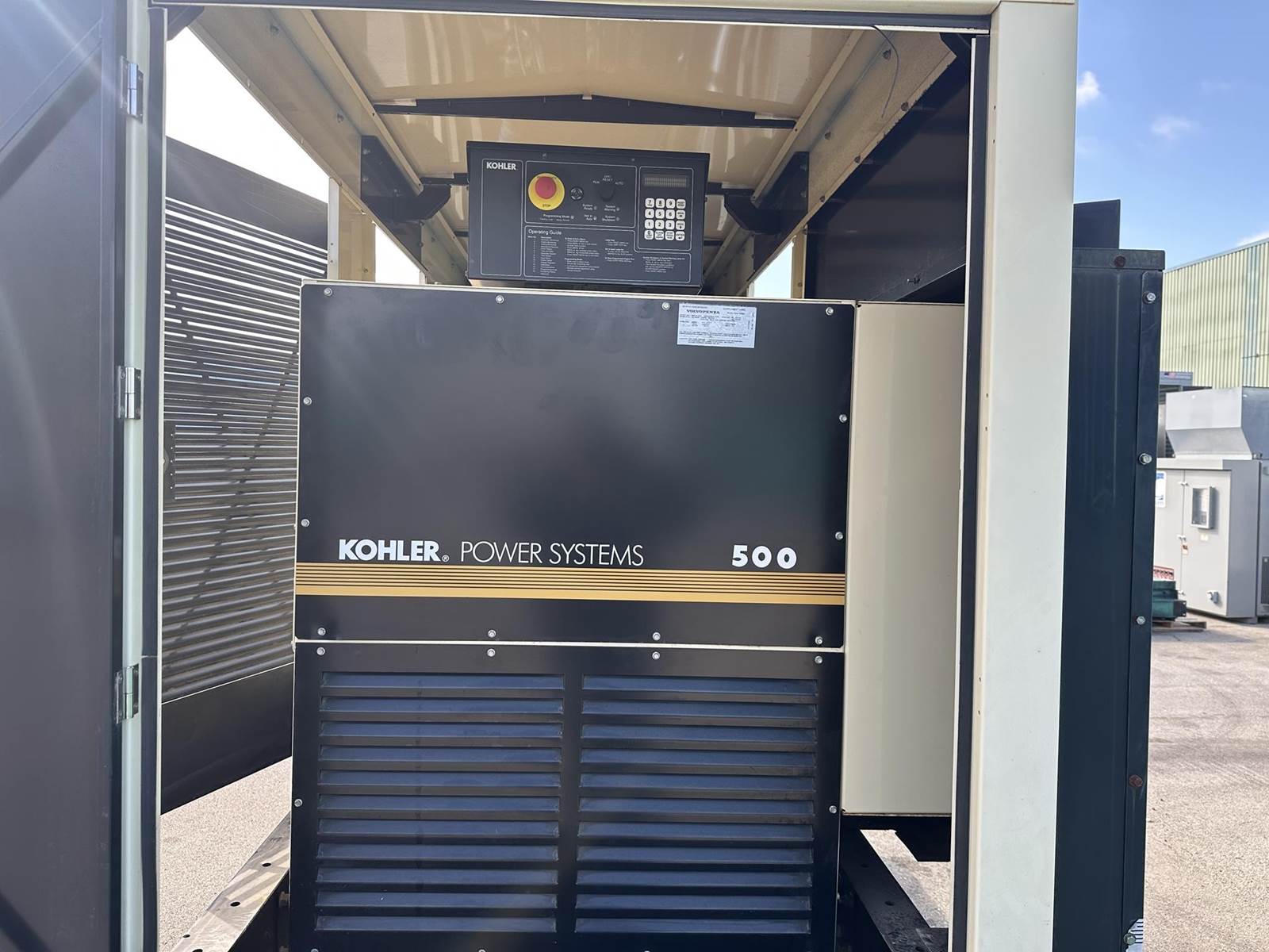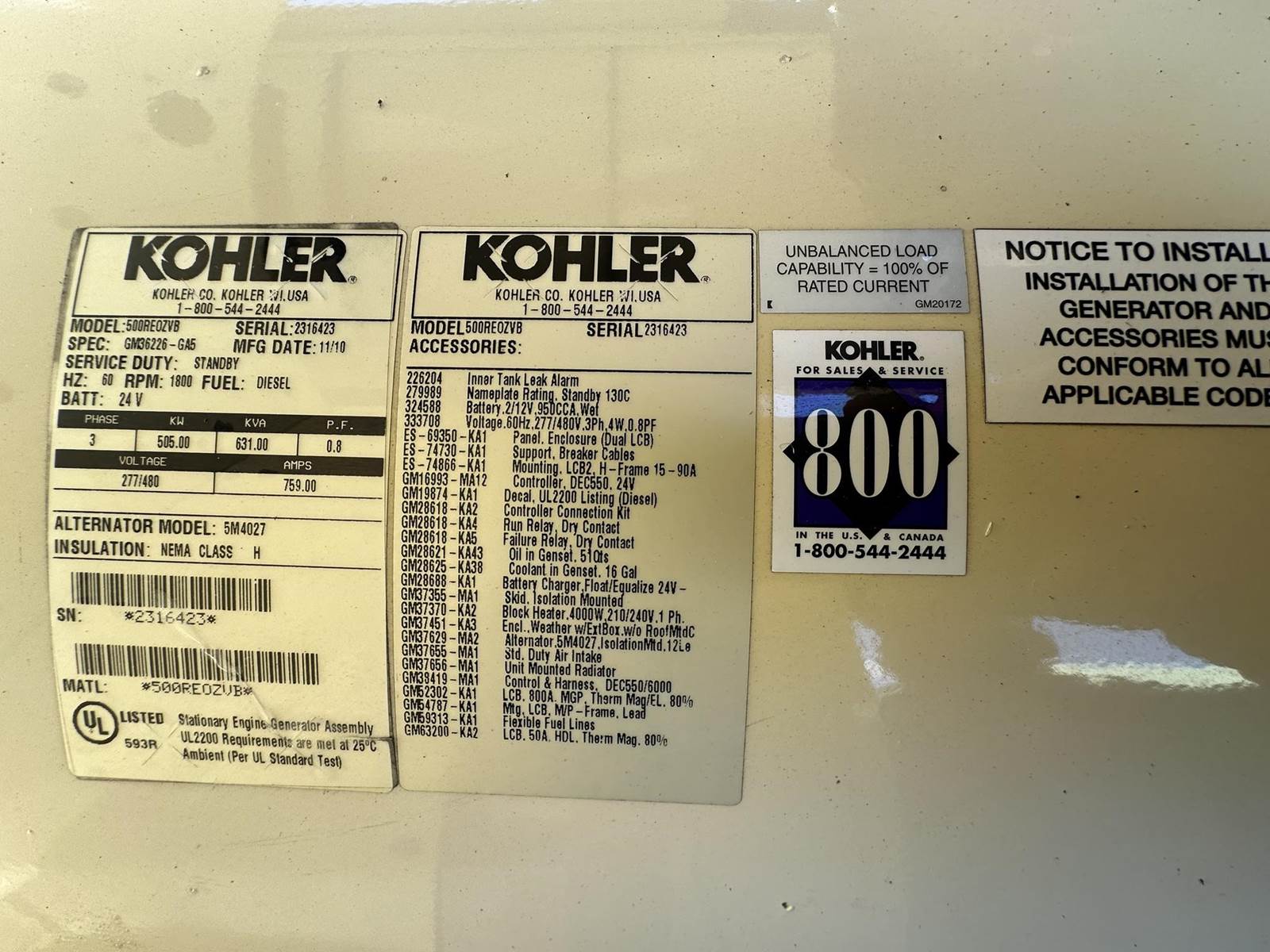 Kohler 505 kW standby (450 kW prime) diesel generator set, model 500REOZVB, SN-2316423. Volvo Penta TAD1641GE engine rated 768 HP at 1800 RPM, SN-, EPA Tier 2 emissions. 3/60/277/480V, 12 lead reconnectable to other voltages. 800 and 150 Amp main-line circuit breaker. PMG -permanent magnet generator. UL2200 listed stationary generator assembly. Decision-Maker 550 digital control panel. Battery charger. 4000W coolant heater. Weather enclosure. 876 gallon UL listed sub-base fuel tank with secondary containment. 198 Hrs. Year 2010. Overall dimensions 65W x 186L x 127H, 12,000 lbs. Passed load test 10/23/2025. FOB Waukesha, WI