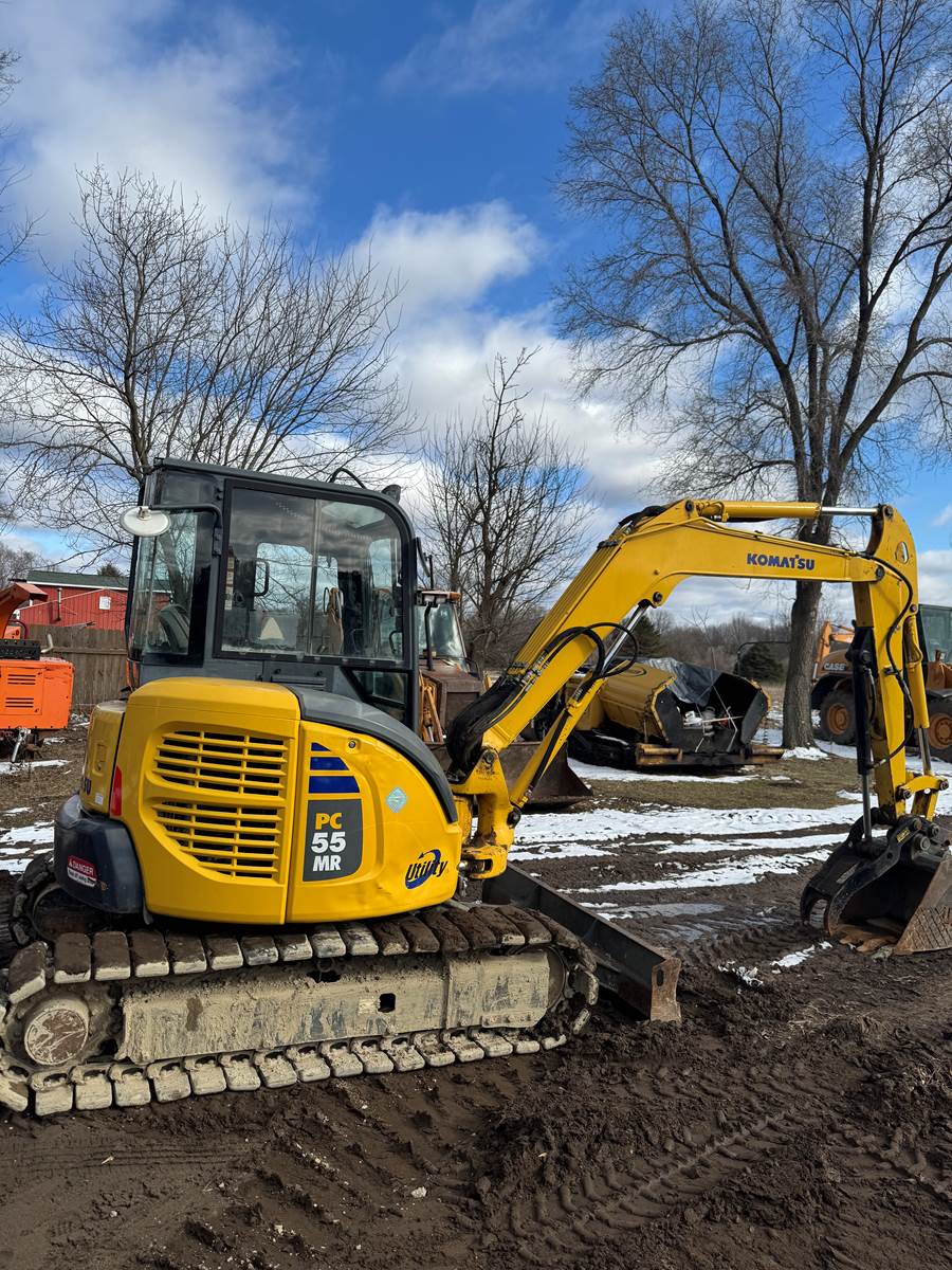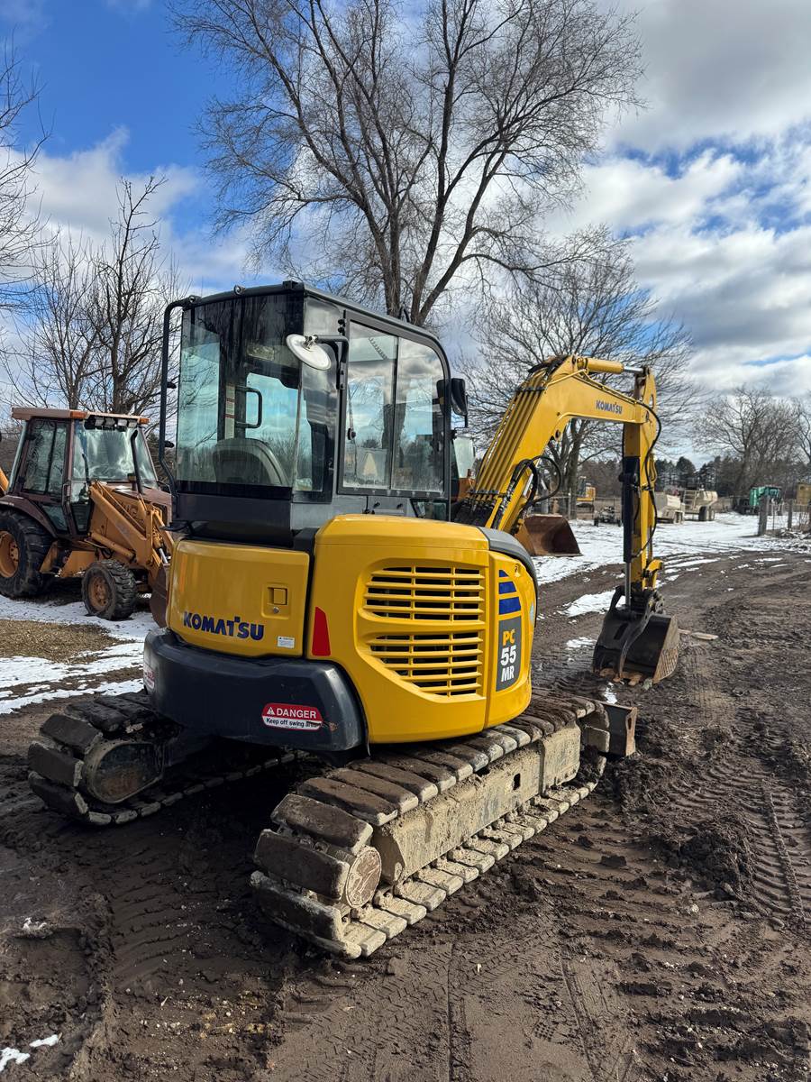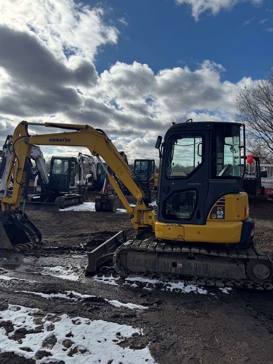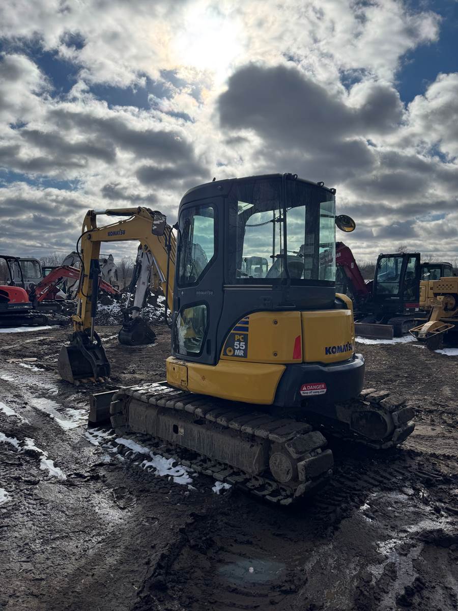 2010 Komatsu PC55MR-3 Mini Excavator, Cab, 351 Displayed Hours, Heat & Air, 2 Speed, Thumb, AUX Hydraulics, 74” Backfill Blade, 38 HP Komatsu Diesel, 24” Bucket, Mechanical Coupler, 16” Rubber Tracks, 12' 5" Max Digging Depth, 11375 L