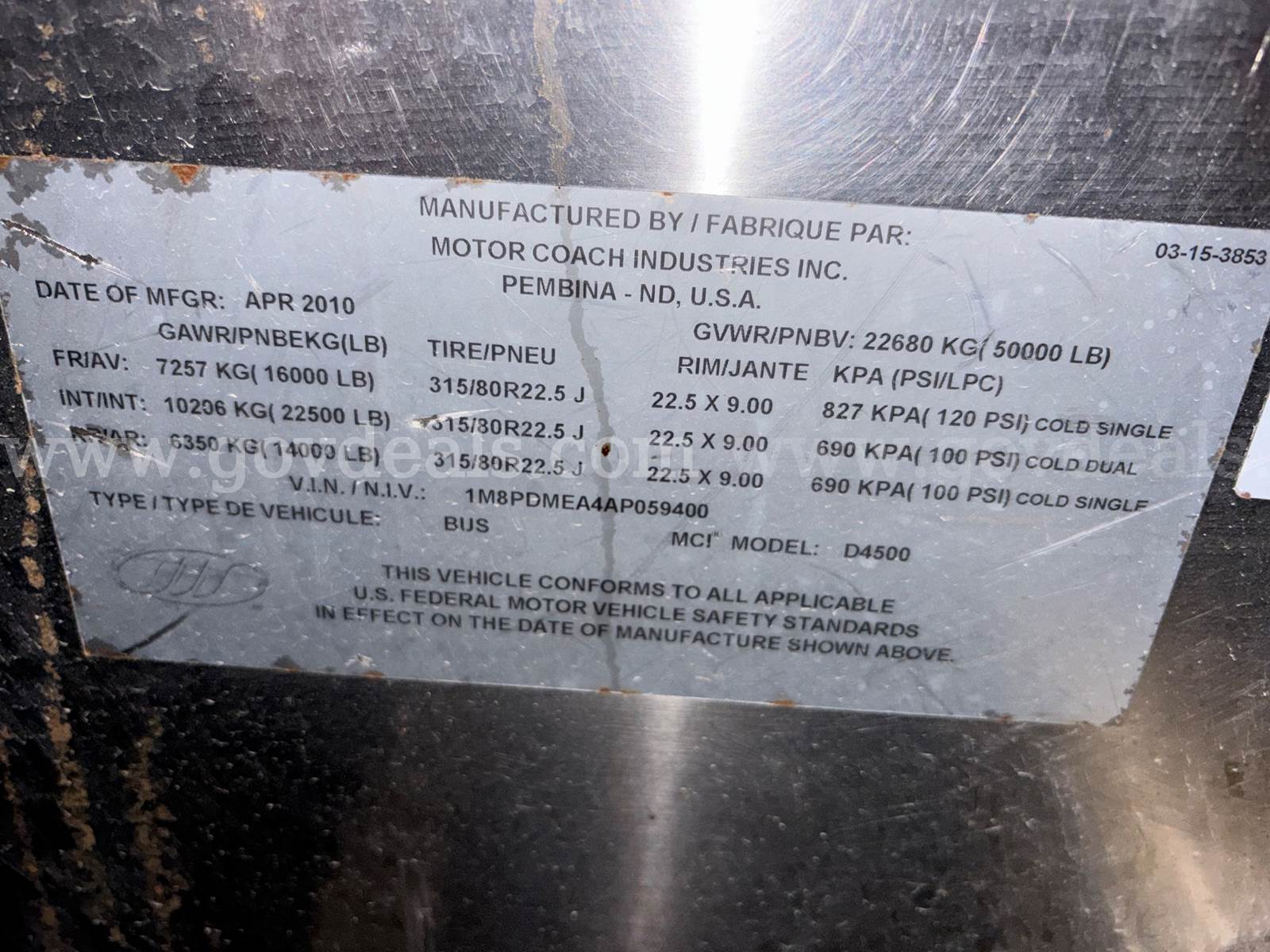 2010 MCI Transit Bus. Bus Runs and Drives. Sold as-is. Bus is subject to the California Air Resources Board Regulations and may not be compliant for commercial use in the state of California. ***GovDeals.com – Online auction service for Federal, State, Local, Educational and Commercial Agencies where you can bid on and buy surplus assets.***