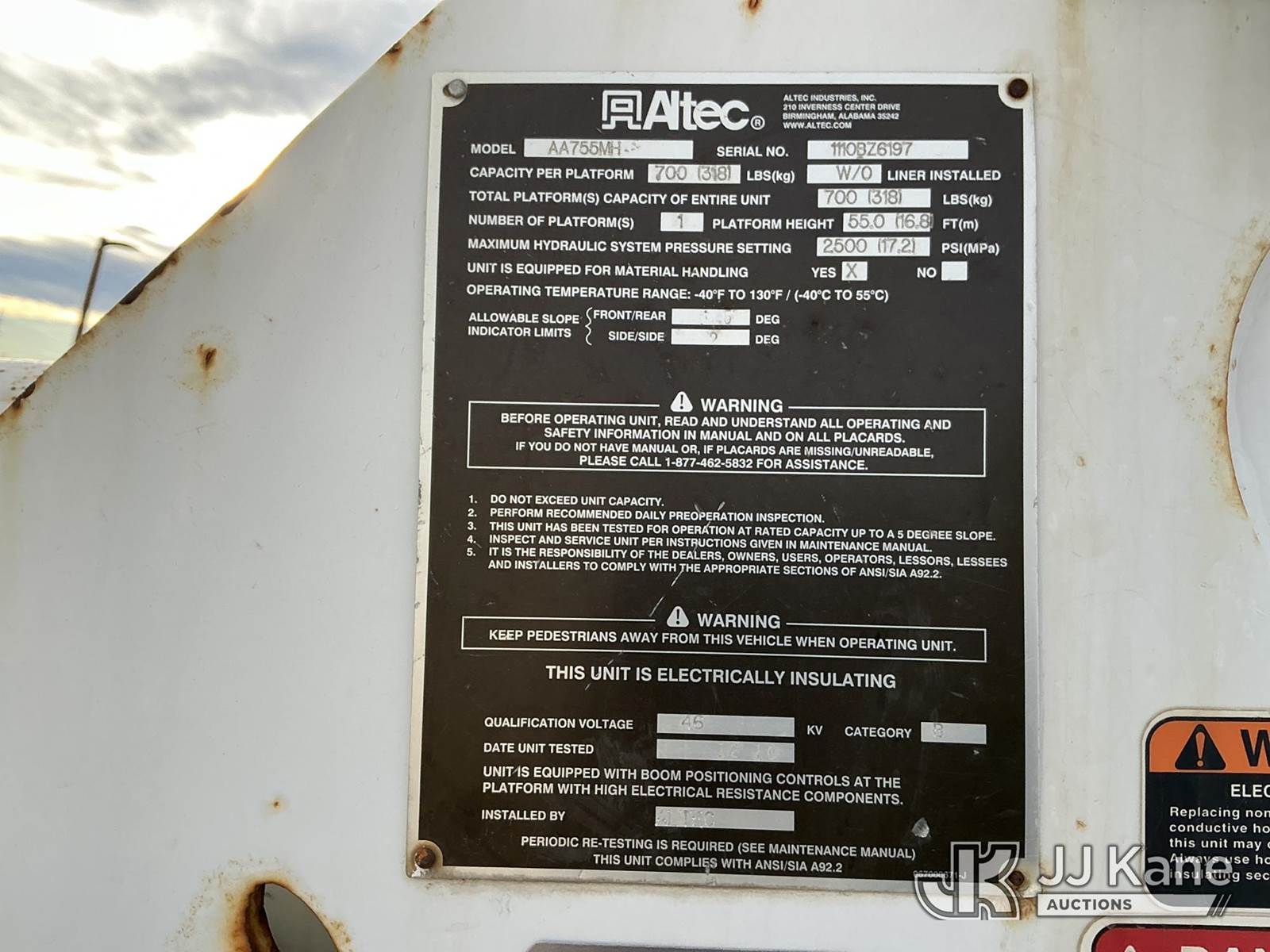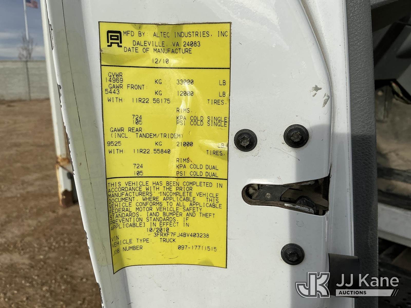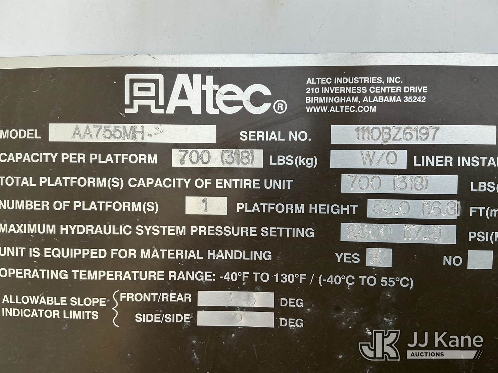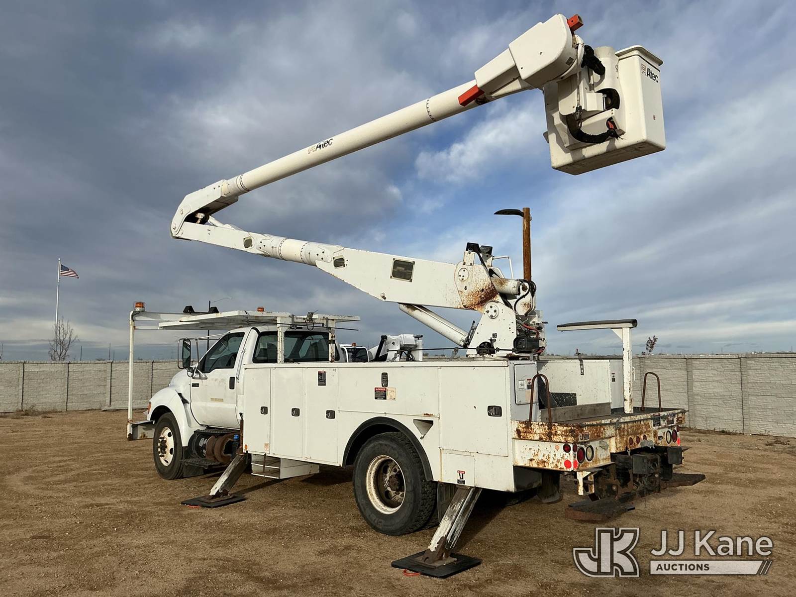 Altec AA755-MH, 60 ft, Material Handling Bucket Truck s/n 1110BZ6197, with two man bucket, rear mounted on 2011 Ford F-750 Utility Truck, 6.7L diesel, 6-spd, A/C, with 6383 PTO hours, (97,696 miles) (Runs, Moves & Upper Operates) (Engine Lights On) ( No Emissions Test Provided) This is a Titled Item NOTE: This unit is being sold AS IS/WHERE IS via Timed Auction and is located in Fort Lupton, CO. Inspection & preview days for this unit are the 2 business days prior to the first day of items closing for this auction, item is located at 2105 Northland Dr Fort Lupton, CO 80621 and hours of operations are 8a-4p. For pre-sale questions, please contact Dakota Hoffman @ (720) 621-0786. Dealer License Number 47109. (Manuals provided in cab) (Buyer is responsible for removal. Assistance by consignor or JJ Kane Auctions is not assured.)