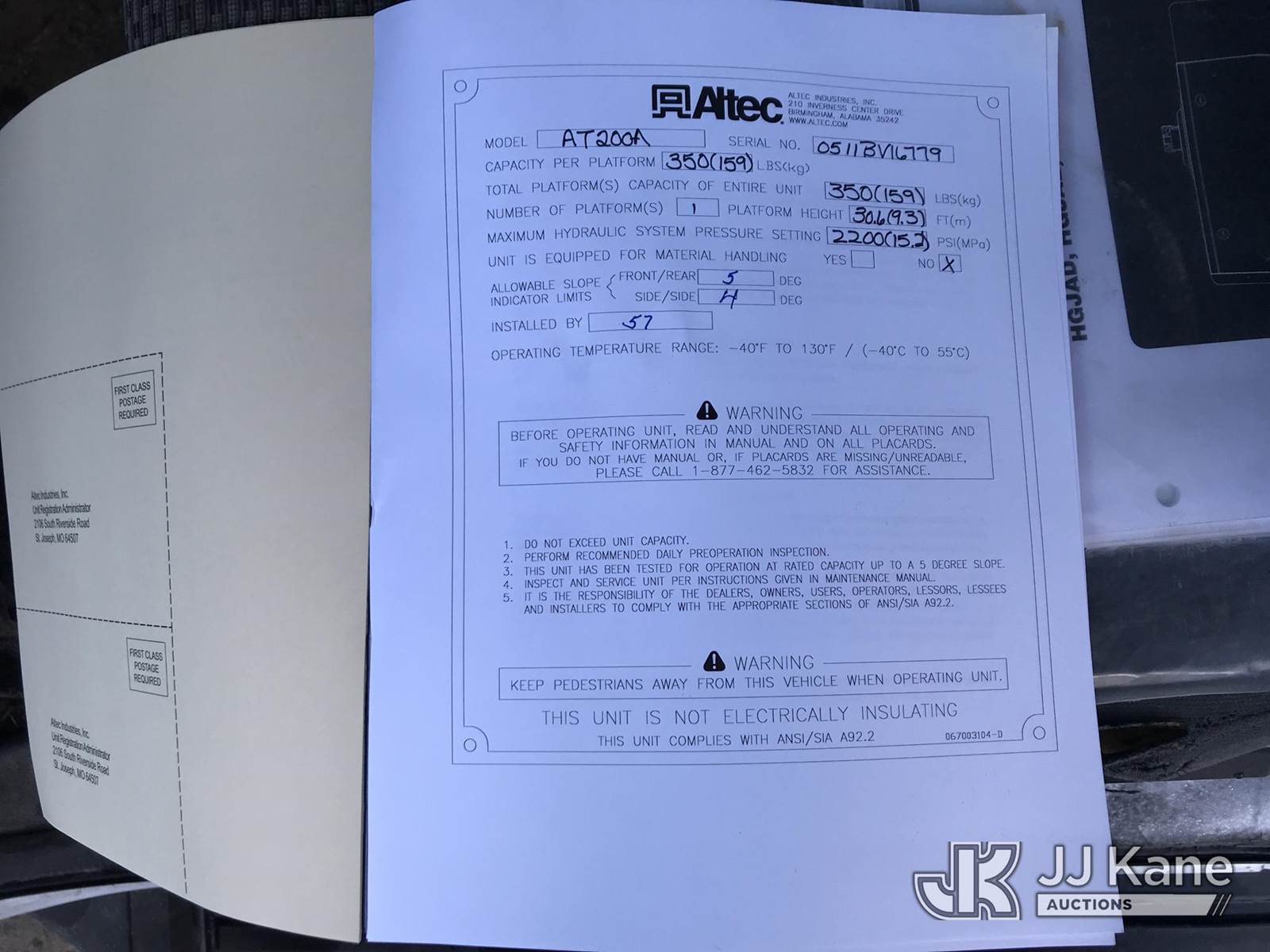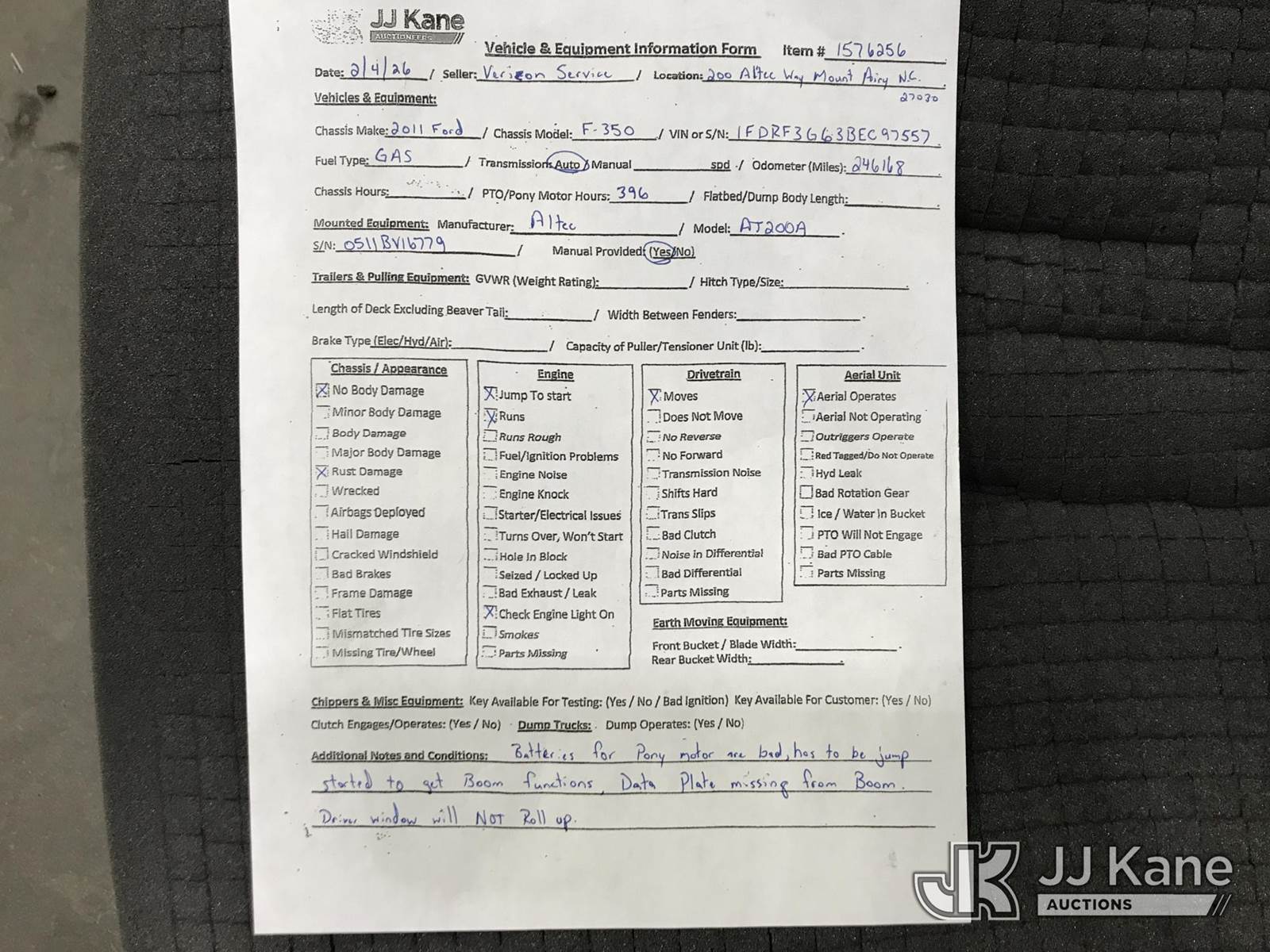 Altec AT200-A, 35 ft, Telescopic Non-Insulated Bucket Truck s/n 0511BV16779, with single-man bucket, mounted behind cab on 2011 Ford F350 Service Truck, 8-cyl gas, Auto, A/C, with Onan generator, (246,168 miles) (Jump To Start, Runs, Moves & Upper Operates) (Check Engine Light On, Battery For Pony Motor Bad, Jump Start, Driver Window Will Not Roll up) This is a Titled Item NOTE: This unit is being sold AS IS/WHERE IS via Timed Auction and is located in Mount Airy, NC. Inspection & preview days for this unit are by appointment only; please contact us at contact@jjkane.com or 84-Go-JJKane for more details. (Missing manuals, See Auction Company for Manufacturers Information to obtain manuals) (Buyer is responsible for removal. Assistance by consignor or JJ Kane Auctions is not assured.)