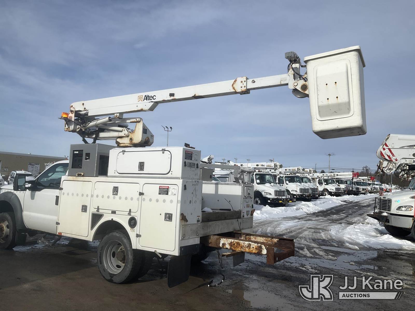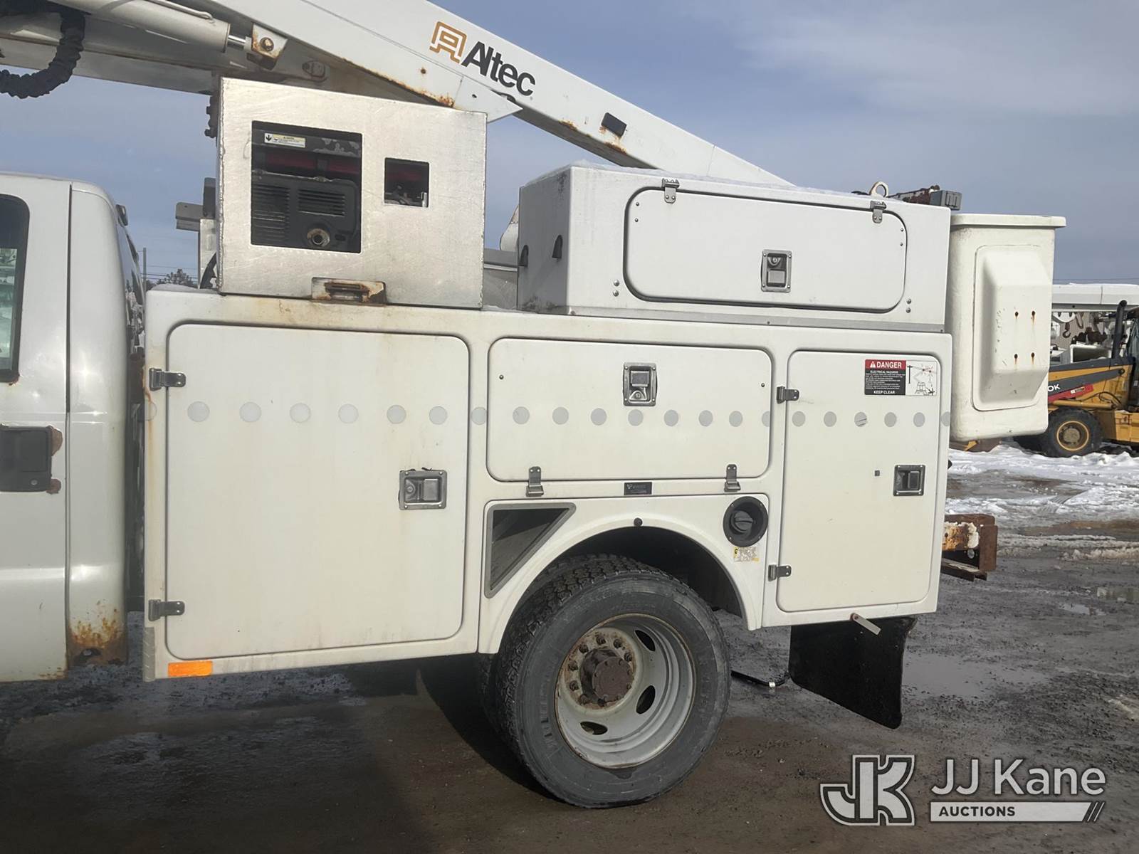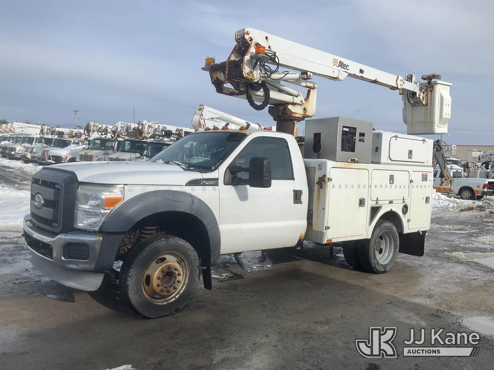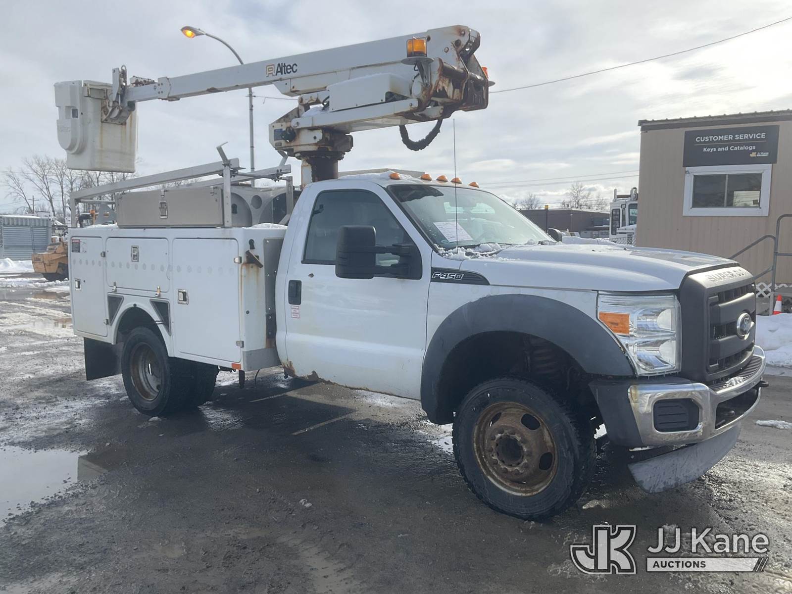 Altec AT235, 40 ft, Articulating & Telescopic Non-Insulated Bucket Truck s/n 1010BX4259, with Single-Man Bucket, mounted behind cab on 2011 Ford F450 2WD Service Truck, 10-cyl gas, Auto, A/C, (196,591 miles (unverified)) (Jump to Start, Runs, Moves & Upper Operates, No Brakes, ABS & Brake Lights On, Must Tow) This is a Titled Item NOTE: This unit is being sold AS IS/WHERE IS via Timed Auction and is located in Rome, NY. Inspection & preview days for this unit are the 2 business days prior to the first day of items closing for this auction, item is located at 5835 Success Dr Rome, NY 13440 and hours of operations are 8a-4p. For pre-sale questions, please contact Ryan Jackson @ (315) 749-3790 or Ryan.Jackson@jjkane.com. (Missing manuals, See Auction Company for Manufacturers Information to obtain manuals) (Buyer is responsible for removal. Assistance by consignor or JJ Kane Auctions is not assured.)