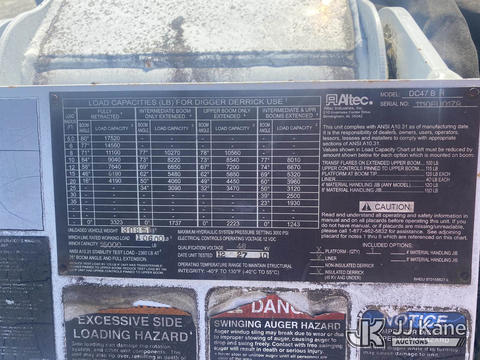 Altec DC47-BR, 17,520 Lb Digger Derrick s/n 1110EU0179, with 47ft sheave height, 2spd digger, pole guides, tip winch, riding console, rear mounted on 2011 International 7300 Utility Truck, 7.6L 4X4, diesel, 6-spd, A/C, with front winch, (52,803 miles) (Not Running, Condition Unknown, Rust Damage ) (Reads 4,984 hours) This is a Titled Item NOTE: This unit is being sold AS IS/WHERE IS via Timed Auction and is located in Villa Rica, GA. Inspection & preview days for this unit are the 2 business days prior to the first day of items closing for this auction, item is located at 100 Liberty Rd Villa Rica, GA 30180 and hours of operations are 8a-4p. For pre-sale questions, please contact Office Staff @ (470) 590-8453. (Manuals provided in cab) (Buyer is responsible for removal. Assistance by consignor or JJ Kane Auctions is not assured.)