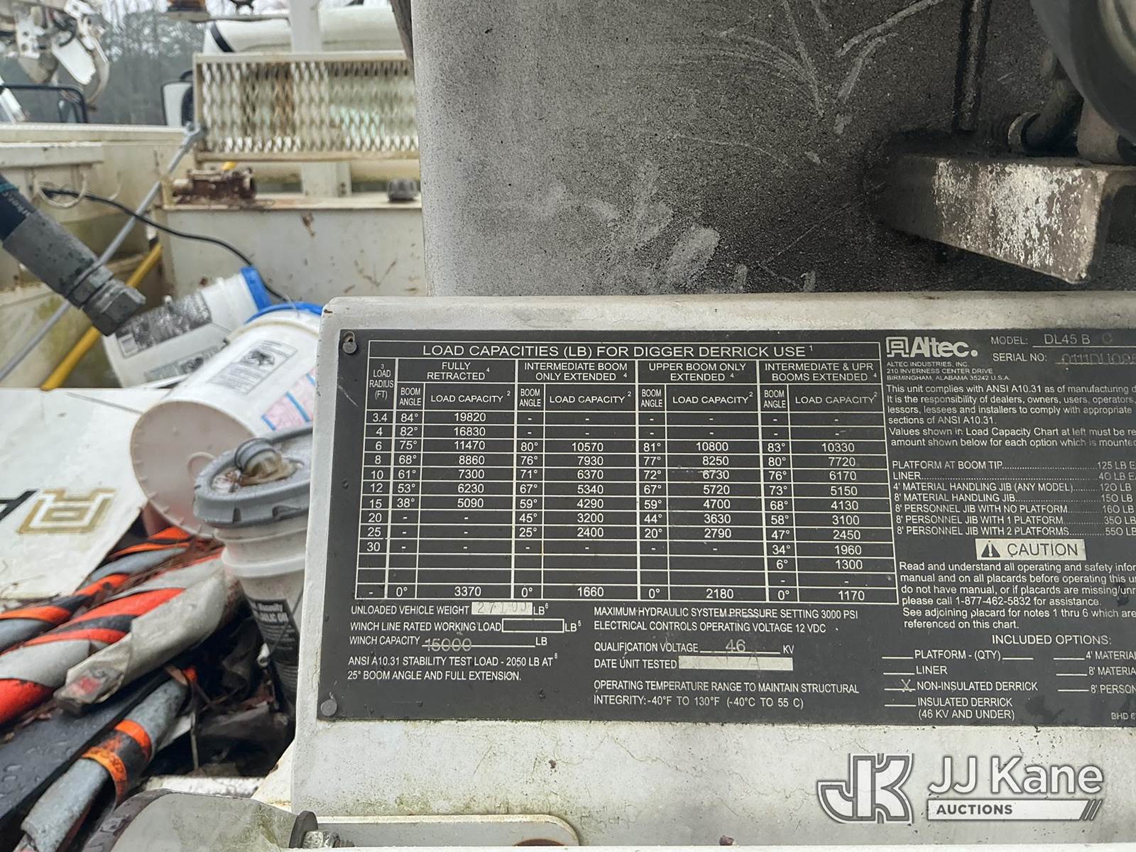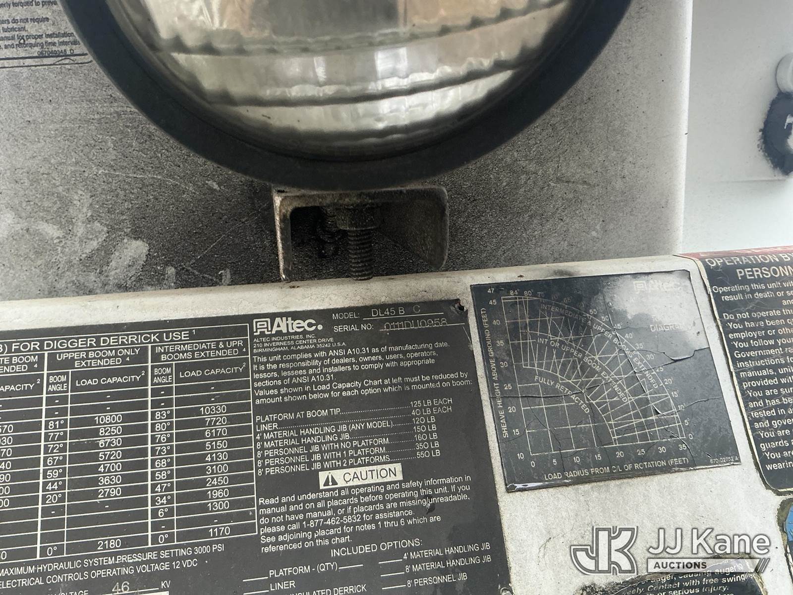 Altec DL45-BC, 19,820 Lb Digger Derrick s/n 0111DU0958, with 45ft sheave height, three stage hydraulic boom, tip winch, pole grabs, standing console, and four hydraulic outriggers, corner mounted on 2011 Freightliner M2 106 Utility Truck, Cummins 8.3L diesel, Auto, A/C, with winch, True Mileage Unknown (Not Running, Condition Unknown The manufacturer has notified JJ Kane that this equipment is subject to an open recall. CSN 571 Chassis Air Brake Hose Replacement The equipment should not be operated until this is addressed. Buyer is responsible for reviewing the recall notice and contacting the manufacturer to schedule the recommended corrective actions. Associated costs may be covered by the manufacturer in some cases.) This is a Titled Item NOTE: This unit is being sold AS IS/WHERE IS via Timed Auction and is located in Washington, NC. Inspection & preview days for this unit are by appointment only; please contact us at contact@jjkane.com or 84-Go-JJKane for more details. (Missing manuals, See Auction Company for Manufacturers Information to obtain manuals) (Buyer is responsible for removal. Assistance by consignor or JJ Kane Auctions is not assured.)