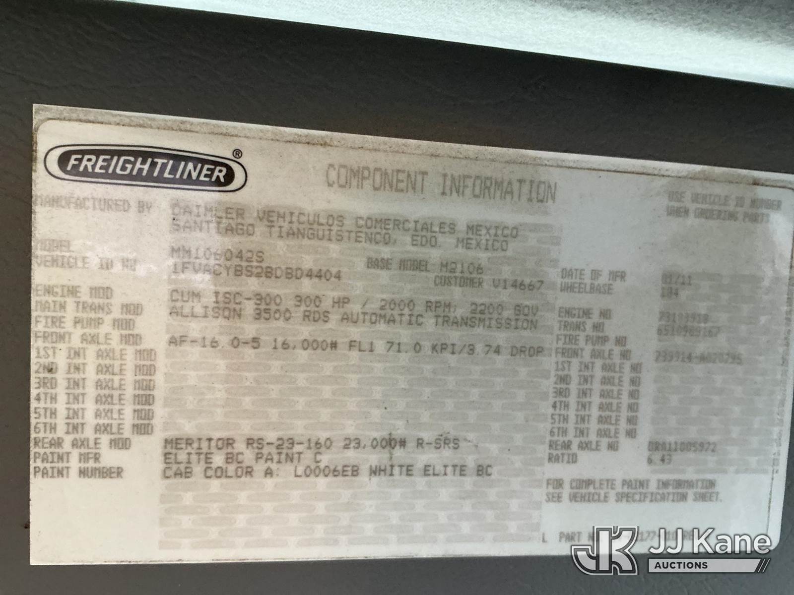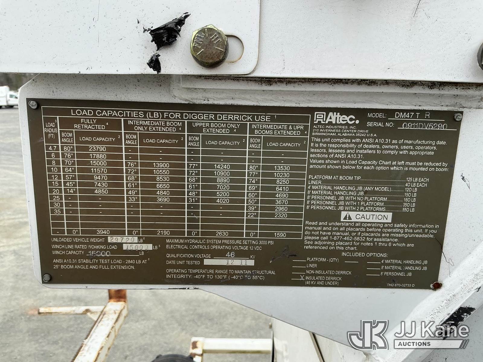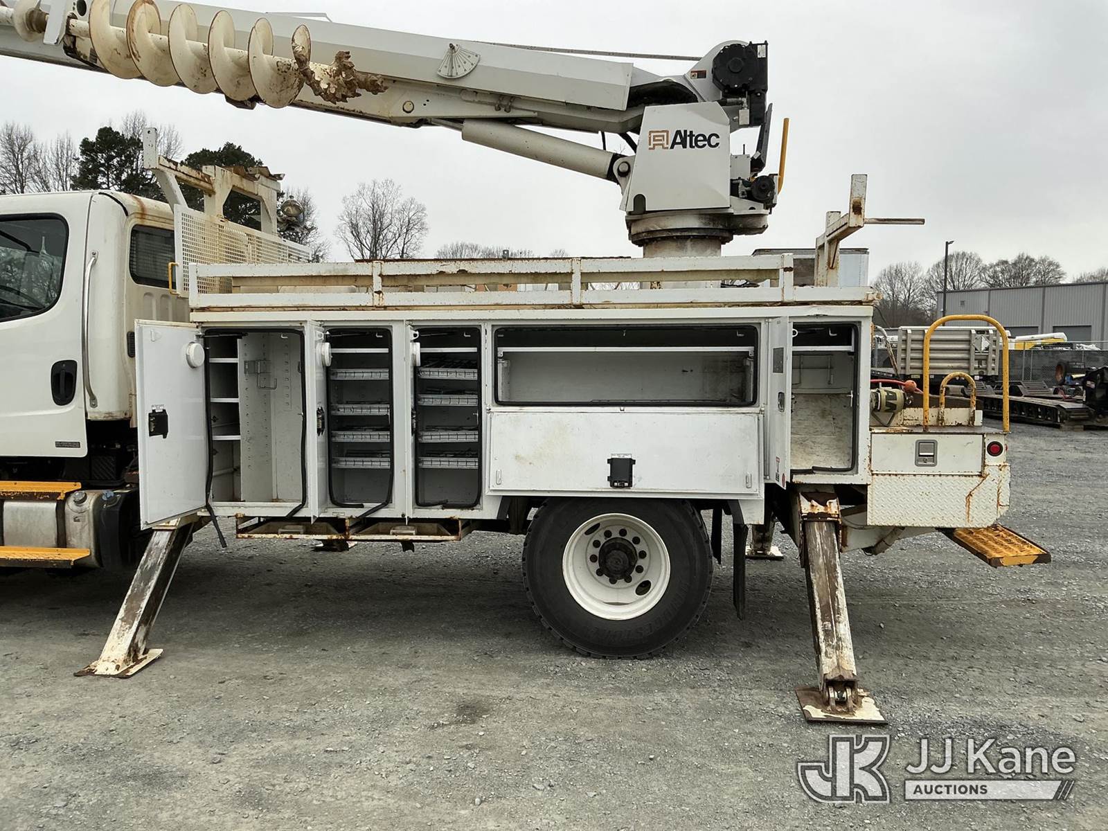 Altec DM47-TR, 23,790 Lb Digger Derrick s/n 0911DV5290, with 47 ft sheave height, 3 section hyd boom, 2 spd digger, heel winch, pole guides, remote, riding console & 4 hyd outriggers, rear mounted on 2011 Freightliner M2 106 Utility Truck, Cummins ISC 8.3L diesel, Auto, A/C, with front winch , (58,069 miles) (Runs, Moves & Upper Operates) (Jump To Start, Check Engine Light On) This is a Titled Item NOTE: This unit is being sold AS IS/WHERE IS via Timed Auction and is located in China Grove, NC. Inspection & preview days for this unit are the 2 business days prior to the first day of items closing for this auction, item is located at 820 E NC Hwy 152 China Grove, NC 28023 and hours of operations are 8a-4p. For pre-sale questions, please contact Office Staff @ (704) 674-1113. (Manuals provided in cab) (Buyer is responsible for removal. Assistance by consignor or JJ Kane Auctions is not assured.)
