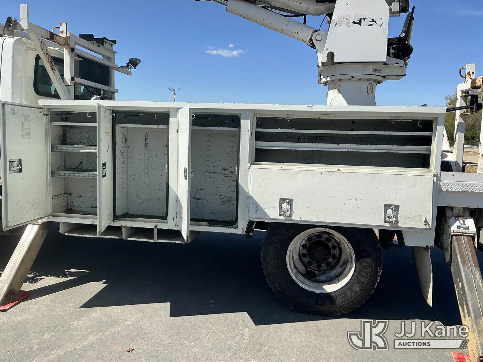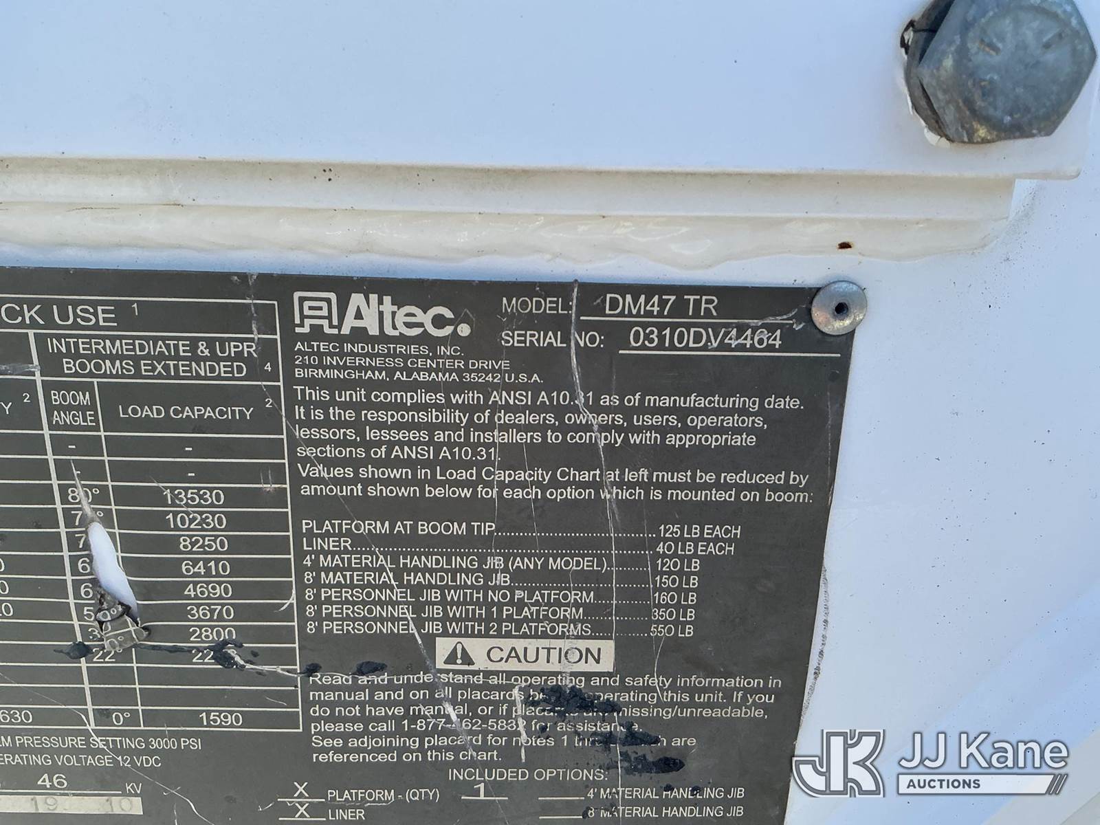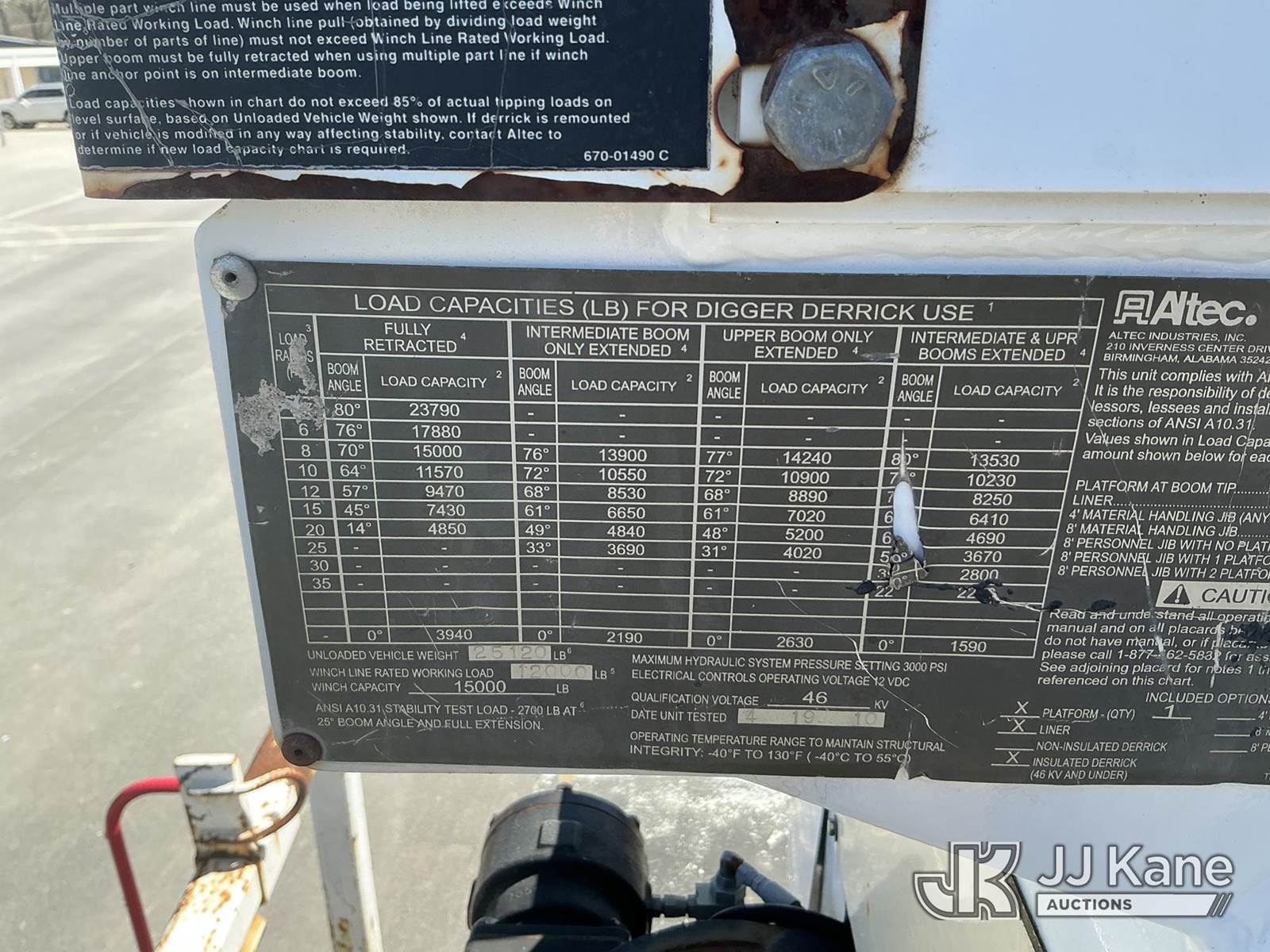 Altec DM47-TR, 23,790 Lb Digger Derrick s/n 0310DV4464, with 47 ft. sheave height, 3 section hydraulic boom, pole guides, heel winch, two speed auger, riding console & 4 hydraulic outriggers, rear mounted on 2011 International 4300 Utility Truck, MaxxForce 7.6L diesel, Auto, A/C, (165,097 miles) (Runs, Moves, Upper Operates) This is a Titled Item NOTE: This unit is being sold AS IS/WHERE IS via Timed Auction and is located in Fayetteville, NC. For more information & removal arrangements please contact Pete Klimek @ 843-323-6538. (Manuals provided in cab) (Buyer is responsible for removal. Assistance by consignor or JJ Kane Auctions is not assured.)