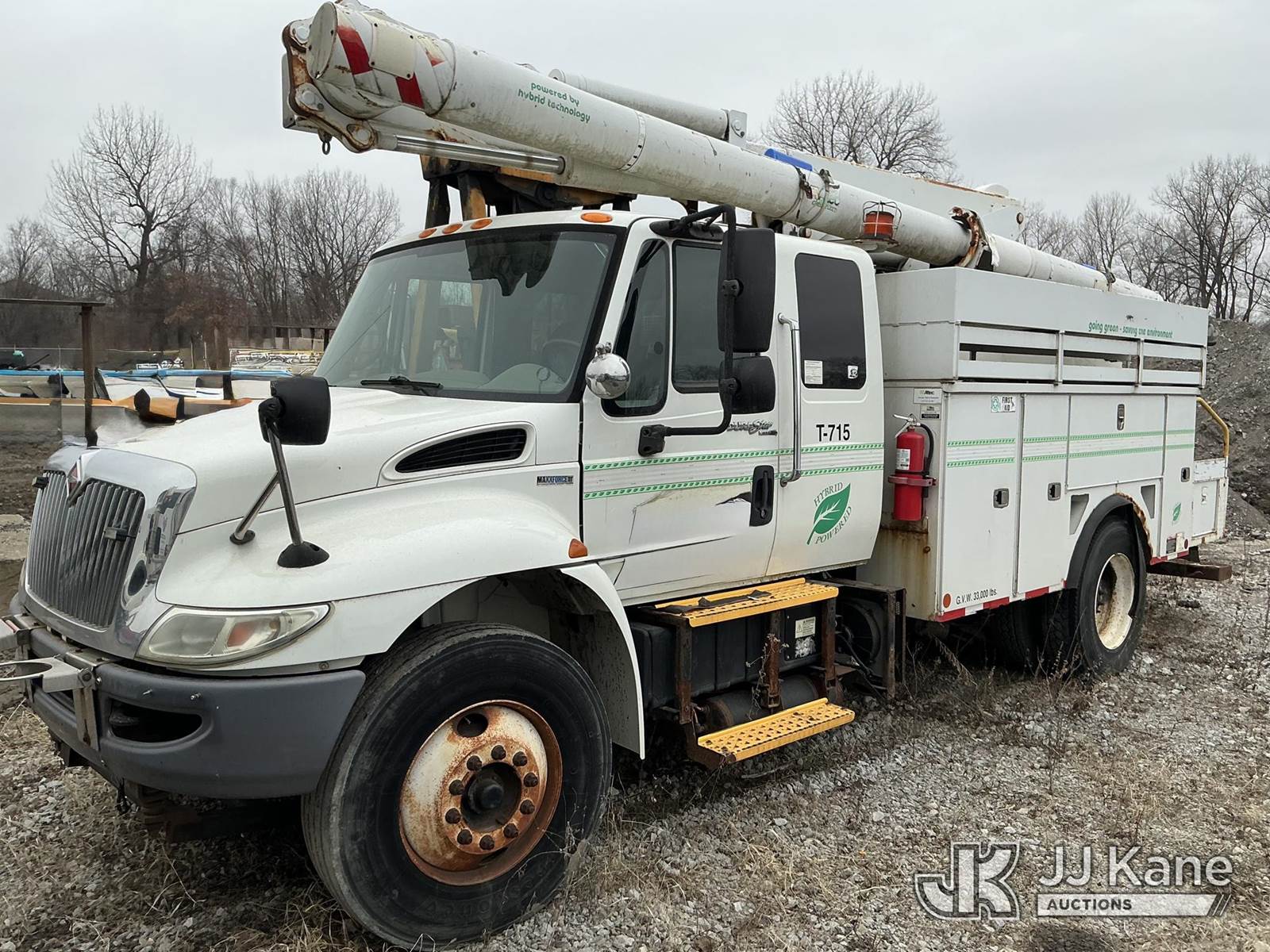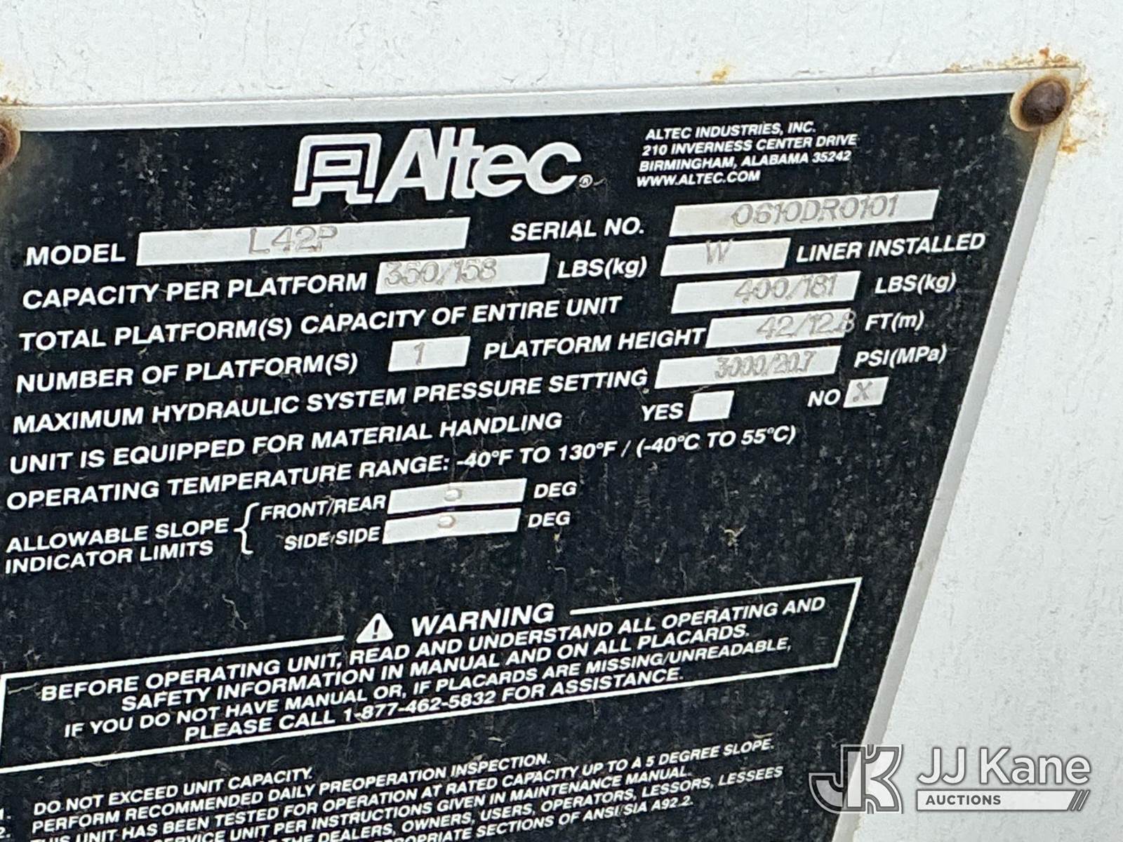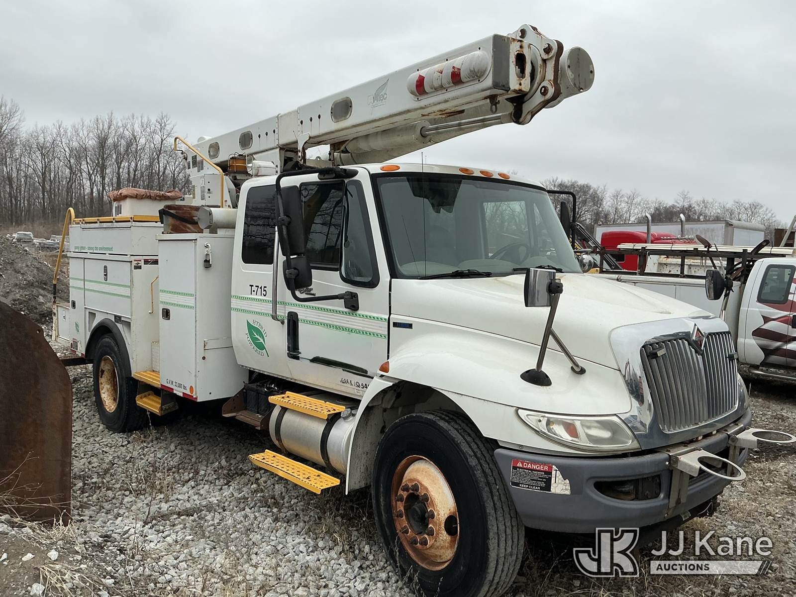 Altec L42P, 47 ft, Over-Center Bucket Truck s/n 0610DR0101, with single-man bucket & 2 hyd outriggers, rear mounted on 2011 International 4300 Extended-Cab Utility Truck, Maxxforce DT Diesel, 4X2, Auto, A/C, (100,218 miles) Hybrid Power System (Runs & Moves, Check Engine Light On) (Seller states this item has been removed from service: Upper Condition Unknown - Requires ANSI Inspection for repair/replacement requirements. The manufacturer has notified JJ Kane that this equipment is subject to an open recall. CSN 3090 Hydraulic Hose Replacement — Compliance A92.2 The equipment should not be operated until this is addressed. Buyer is responsible for reviewing the recall notice and contacting the manufacturer to schedule the recommended corrective actions. Associated costs may be covered by the manufacturer in some cases.) This is a Titled Item NOTE: This unit is being sold AS IS/WHERE IS via Timed Auction and is located in Schererville, IN. Inspection & preview days for this unit are by appointment only; please contact us at contact@jjkane.com or 84-Go-JJKane for more details. (Missing manuals, See Auction Company for Manufacturers Information to obtain manuals) (Buyer is responsible for removal. Assistance by consignor or JJ Kane Auctions is not assured.)
