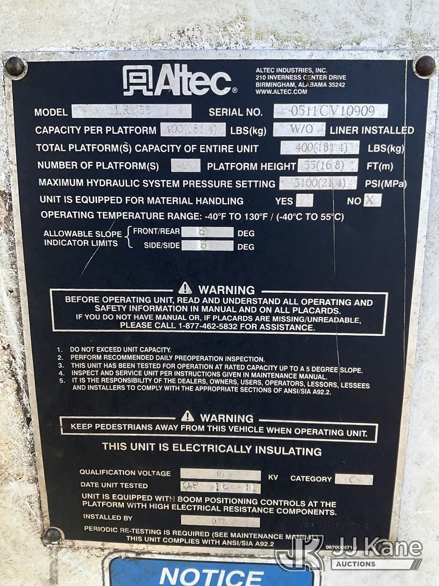 Altec LRV55, 60 ft, Over-Center Bucket Truck s/n 0511CV10909, with Single Man Bucket & 2 Outriggers , mounted behind cab on 2011 Freightliner M2 106 Chipper Dump Truck, 6.7L L6 diesel, 6-spd, 4X2, with 11ft Dump Body, (53,278 miles) (Runs, Moves & Upper Operates, Body & Rust Damage, No Fuel Cap) (Seller States: Drifting Upper Boom, Leveling Rods, Dog Bone Bushings, Needs Bucket Replaced) This is a Titled Item NOTE: This unit is being sold AS IS/WHERE IS via Timed Auction and is located in Bellport, NY. Inspection & preview days for this unit are by appointment only; please contact us at contact@jjkane.com or 84-Go-JJKane for more details. (Manuals provided in cab) (Buyer is responsible for removal. Assistance by consignor or JJ Kane Auctioneers is not assured.)
