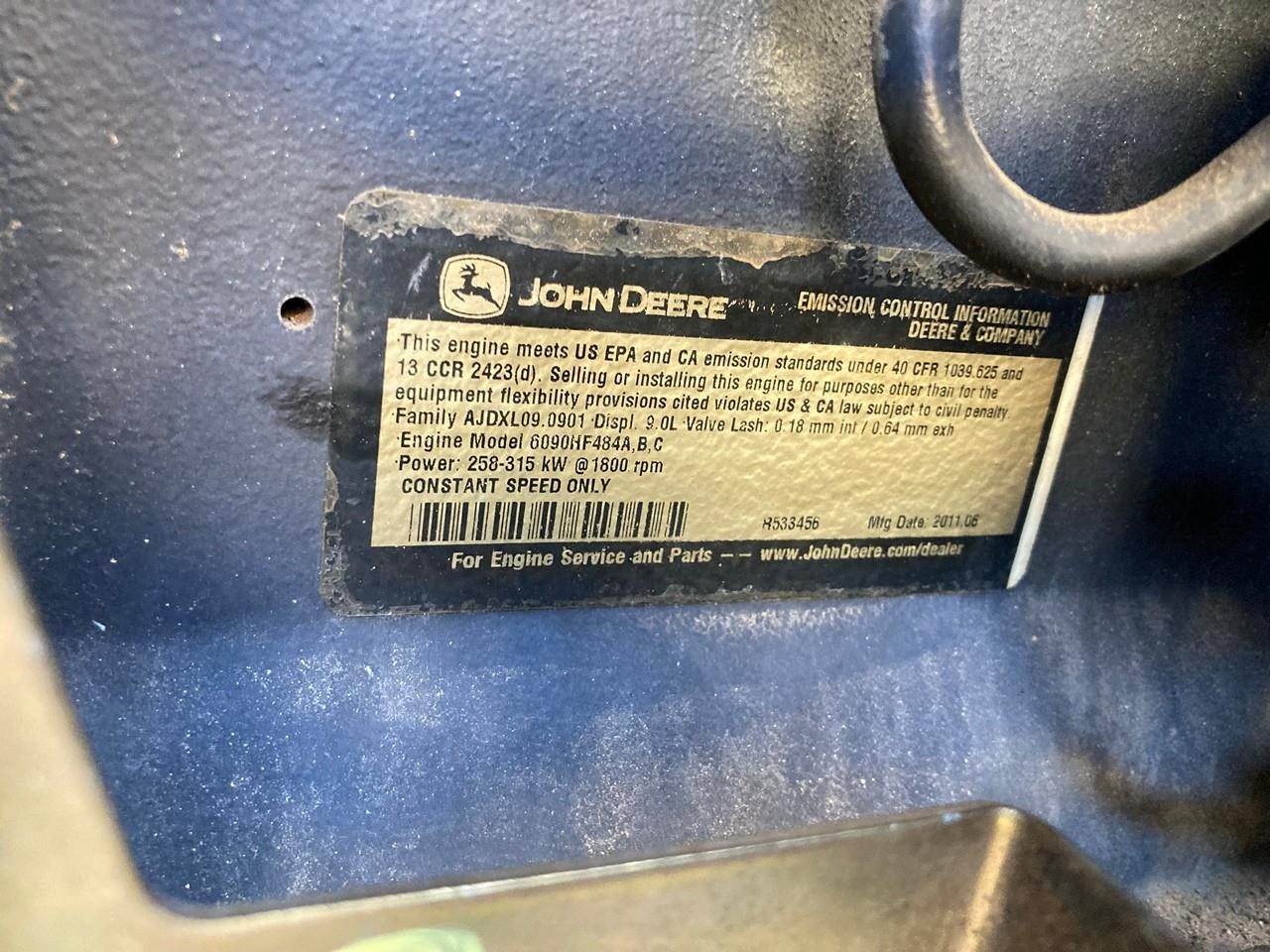 2011 JOHN DEERE 6090HF484 200KW DIESEL GENERATOR SET FOR SALE at ADELMAN’S TRUCK PARTS in CANTON, OHIO. 3 PHASE, 200 KW, 250 KVA, 277/480 VOLTS, 301 AMPS, 60 HZ, 1800 RPM, 9.0 LITERS, STANDBY UNIT, CONSTANT SPEED GOVERNOR, 345-422HP @ 1800 RPM, TIER 3 EMISSIONS, AJDXL09.0901 FAMILY #, with DDI. CAC, TC, ECM, and SPL EMISSIONS CONTROL SYSTEMS, and 55+ LBS OIL PRESSURE.