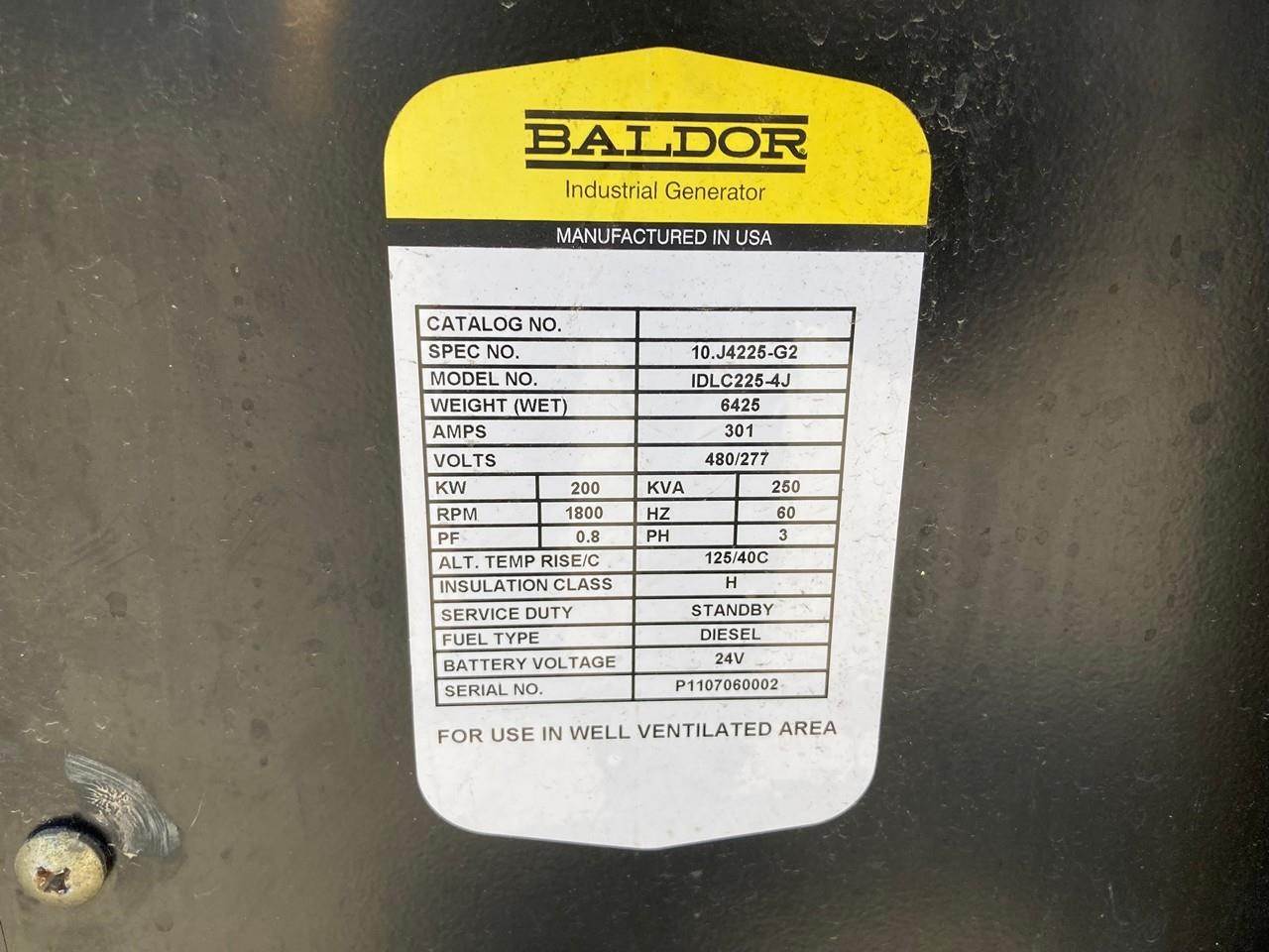 2011 Baldor IDLC225-4J Diesel Generator