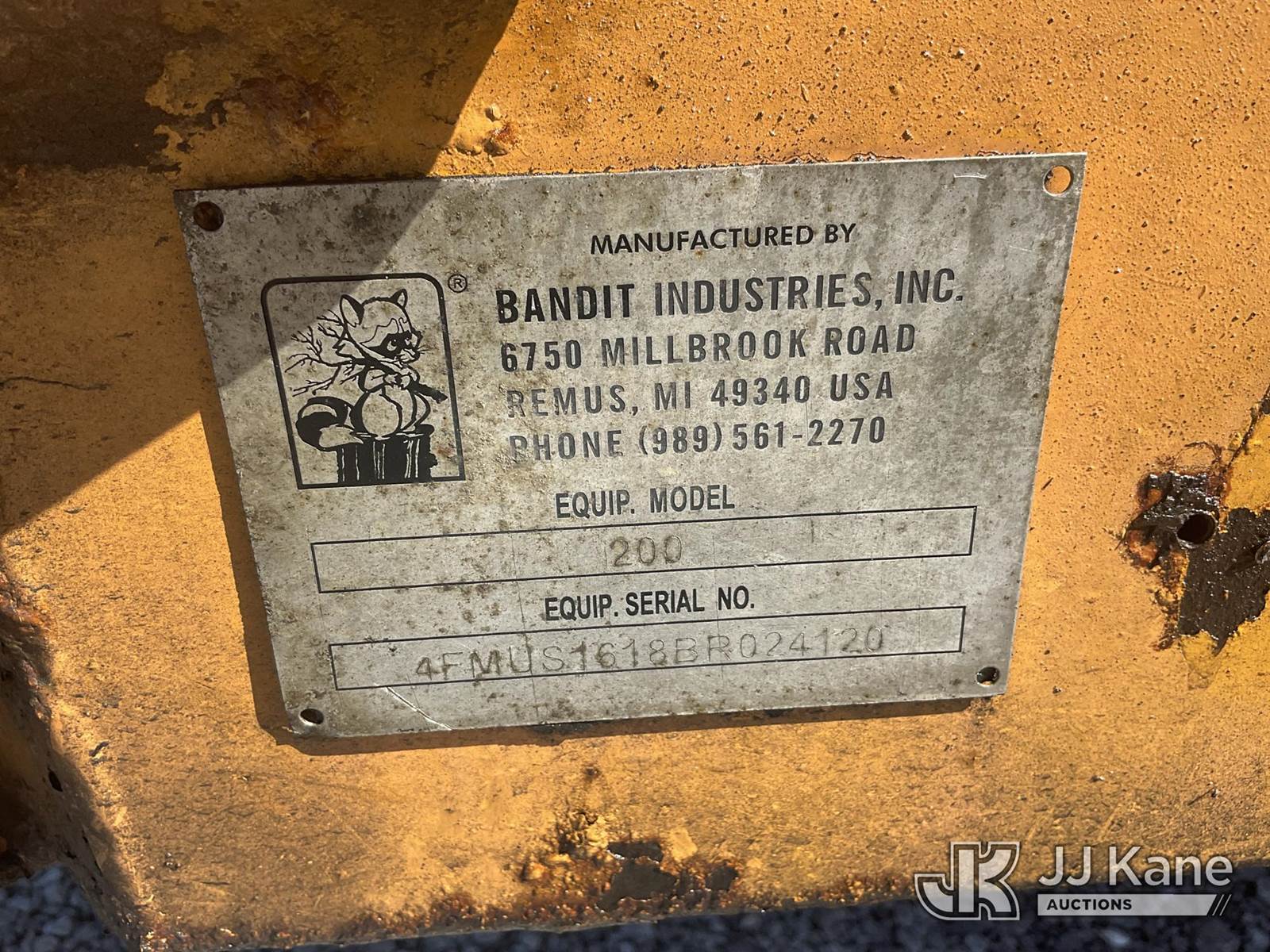 2011 Bandit Industries 200 Chipper (12in Disc), s/n 4FMUS1618BR024120, John Deere diesel, trailer mtd. (CERT OF ORIGIN ONLY) (Not Running, Condition Unknown, Rust & Body Damage, Parts Missing) NOTE: This unit is being sold AS IS/WHERE IS via Timed Auction and is located in Verona, KY. Inspection & preview days for this unit are the 2 business days prior to the first day of items closing for this auction, item is located at 2841 Verona-Mudlick Rd Ste B Verona, KY 41092 and hours of operations are 8a-4p. For pre-sale questions, please contact Office Staff @ (502) 612-5080. Auctioneer Michael Whitebread / License # 256617. (Buyer is responsible for removal. Assistance by consignor or JJ Kane Auctions is not assured.)