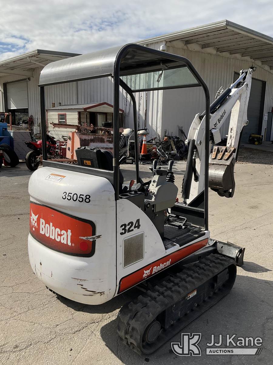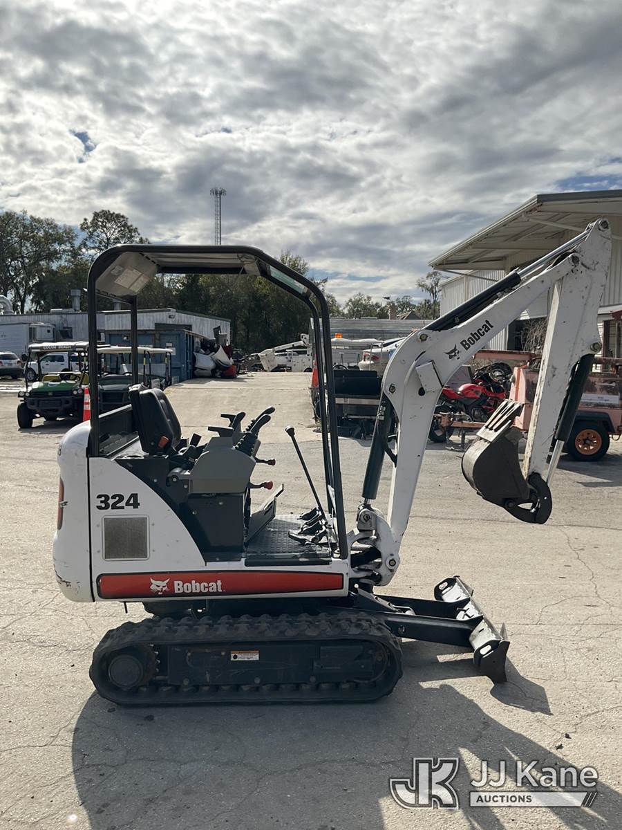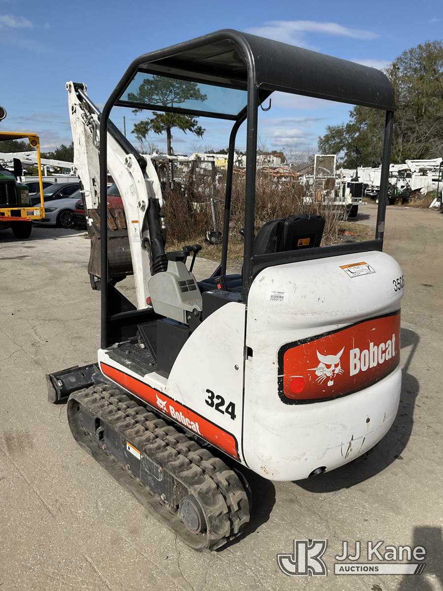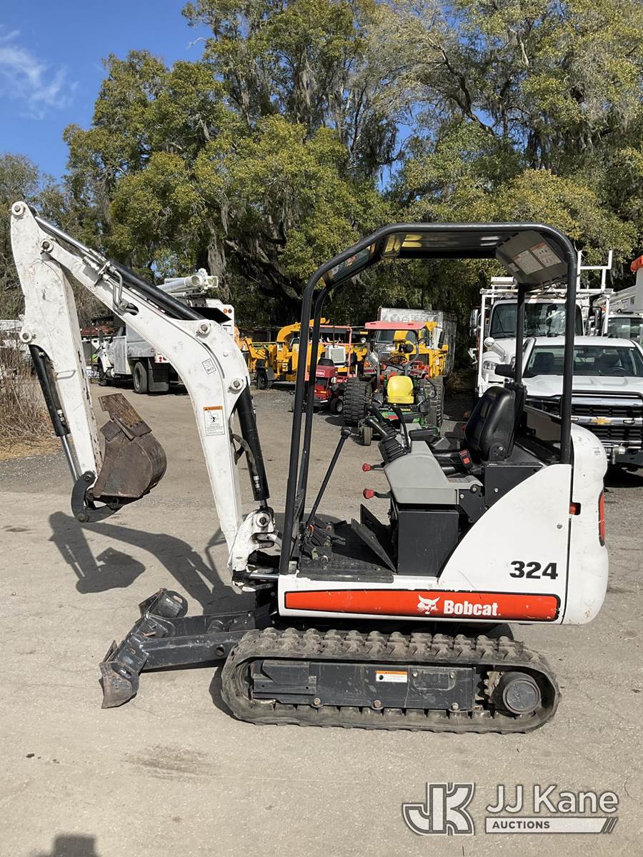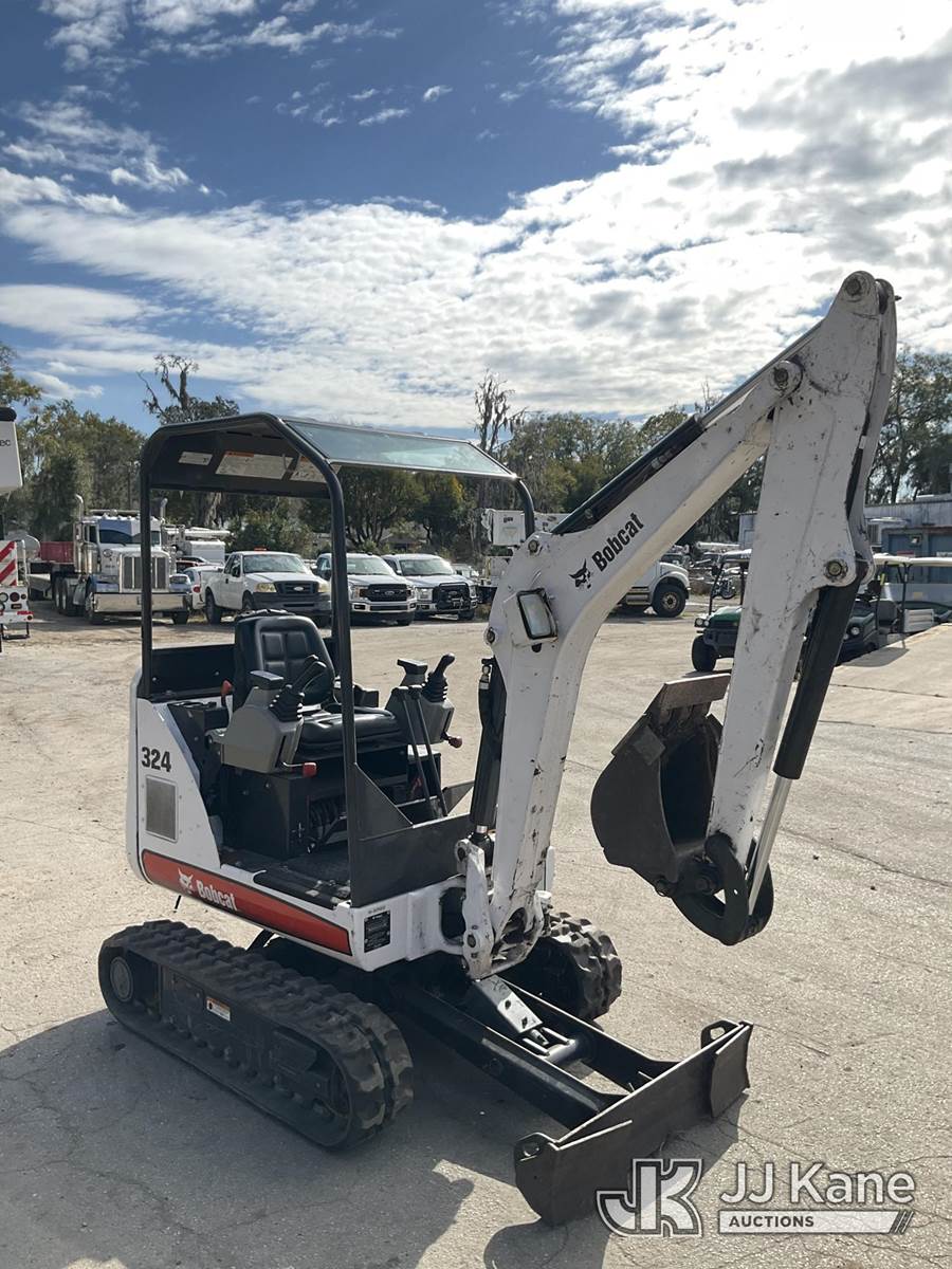2011 Bobcat 324 Mini Hydraulic Excavator, s/n AKY511262, Kubota diesel, Hydraulic Drive, with rubber tracks, backfill blade & ROPS, (Duke Unit) (Runs, Moves & Operates) (Reads 254 hours) NOTE: This unit is being sold AS IS/WHERE IS via Timed Auction and is located in Ocala, FL. Inspection & preview days for this unit are by appointment only; please contact us at contact@jjkane.com or 84-Go-JJKane for more details. For more information & removal arrangements please contact Mike Lessard @ (352) 629-6677. (Buyer is responsible for removal. Assistance by consignor or JJ Kane Auctions is not assured.)