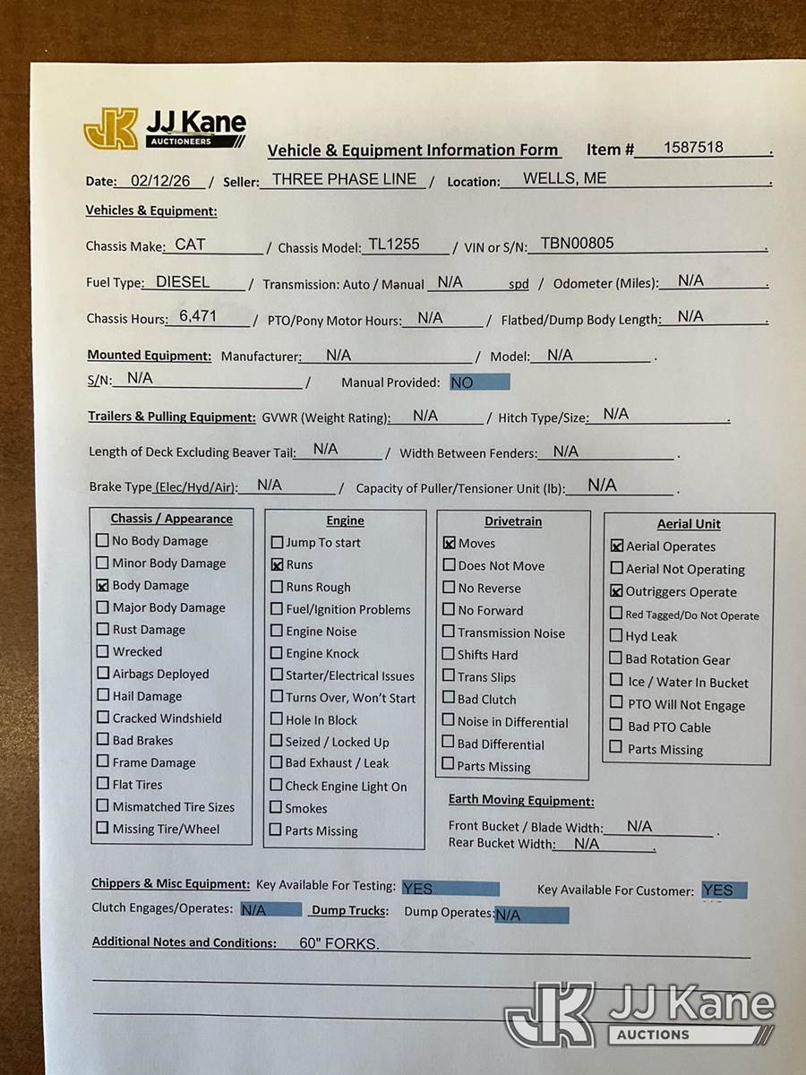 2011 Caterpillar 1255 Telehandler, s/n TBN00805, Cat C4.4 Acert diesel, powershift, with 12,000 lb. lift capacity, 60 in. forks & EROPS, (Runs, Moves & Operates) (Reads 6,471 hours) NOTE: This unit is being sold AS IS/WHERE IS via Timed Auction and is located in Wells, ME. Inspection & preview days for this unit are by appointment only; please contact us at contact@jjkane.com or 84-Go-JJKane for more details. (Buyer is responsible for removal. Assistance by consignor or JJ Kane Auctions is not assured.)