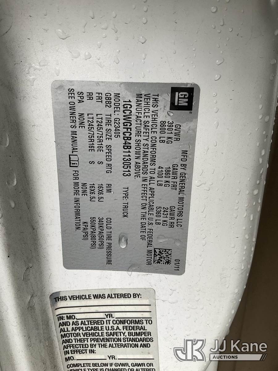 2011 Chevrolet Express 2500 Cargo Van, 6.0L V8 OHV 16V 6-Speed Automatic, RWD, CNG Only, A/C, with ladder rack, (124,088 miles) (Runs & Moves) (Engine Light On, Needs New Battery, CNG Tank Expires 2026) (Bidding Restricted to Licensed Vehicle Dealers Only), This is a Titled Item NOTE: This unit is being sold AS IS/WHERE IS via Timed Auction and is located in Jurupa Valley, CA. Inspection & preview days for this unit are the 2 business days prior to the first day of items closing for this auction, item is located at 4510 Muth Way Jurupa Valley, CA 92509 and hours of operations are 8a-4p. For pre-sale questions, please contact please contact Office Staff @ (310) 353-7140. Dealer License Number 45696. (Buyer is responsible for removal. Assistance by consignor or JJ Kane Auctioneers is not assured.)