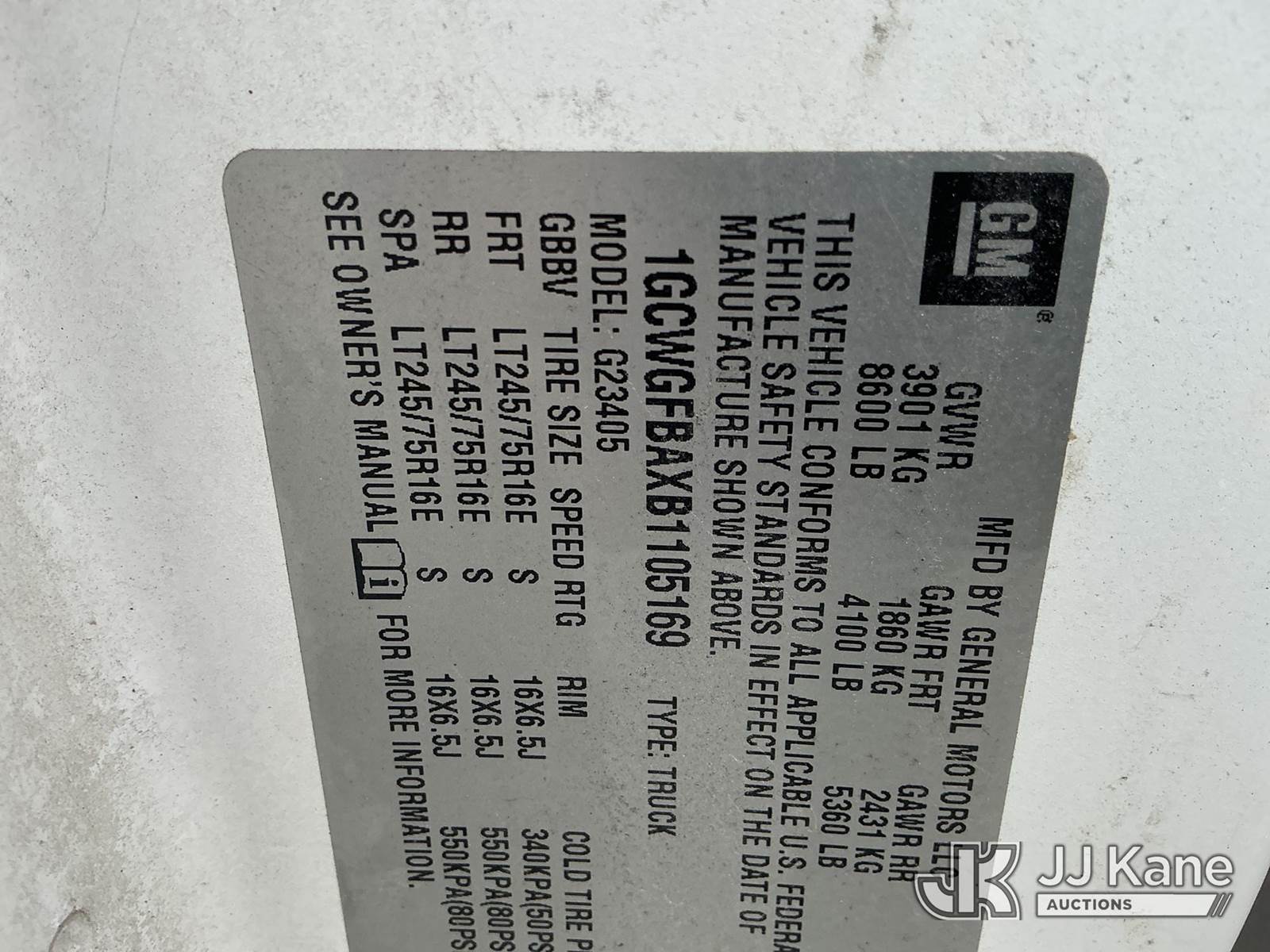 2011 Chevrolet Express 2500 Cargo Van, 4.8L V8 OHV 16V FFV RWD, Gas, Auto, A/C, with Inverter , (148,642 miles) (Runs & Moves) (Rust/Paint Damage) (Reads 6,509 hours) This is a Titled Item NOTE: This unit is being sold AS IS/WHERE IS via Timed Auction and is located in Fort Wayne, IN. Inspection & preview days for this unit are the 2 business days prior to the first day of items closing for this auction, item is located at 3020 Commercial Rd Fort Wayne, IN 46809 and hours of operations are 8a-4p. For pre-sale questions, please contact Eric Mcintosh @ (260) 205-2483 (Buyer is responsible for removal. Assistance by consignor or JJ Kane Auctions is not assured.)