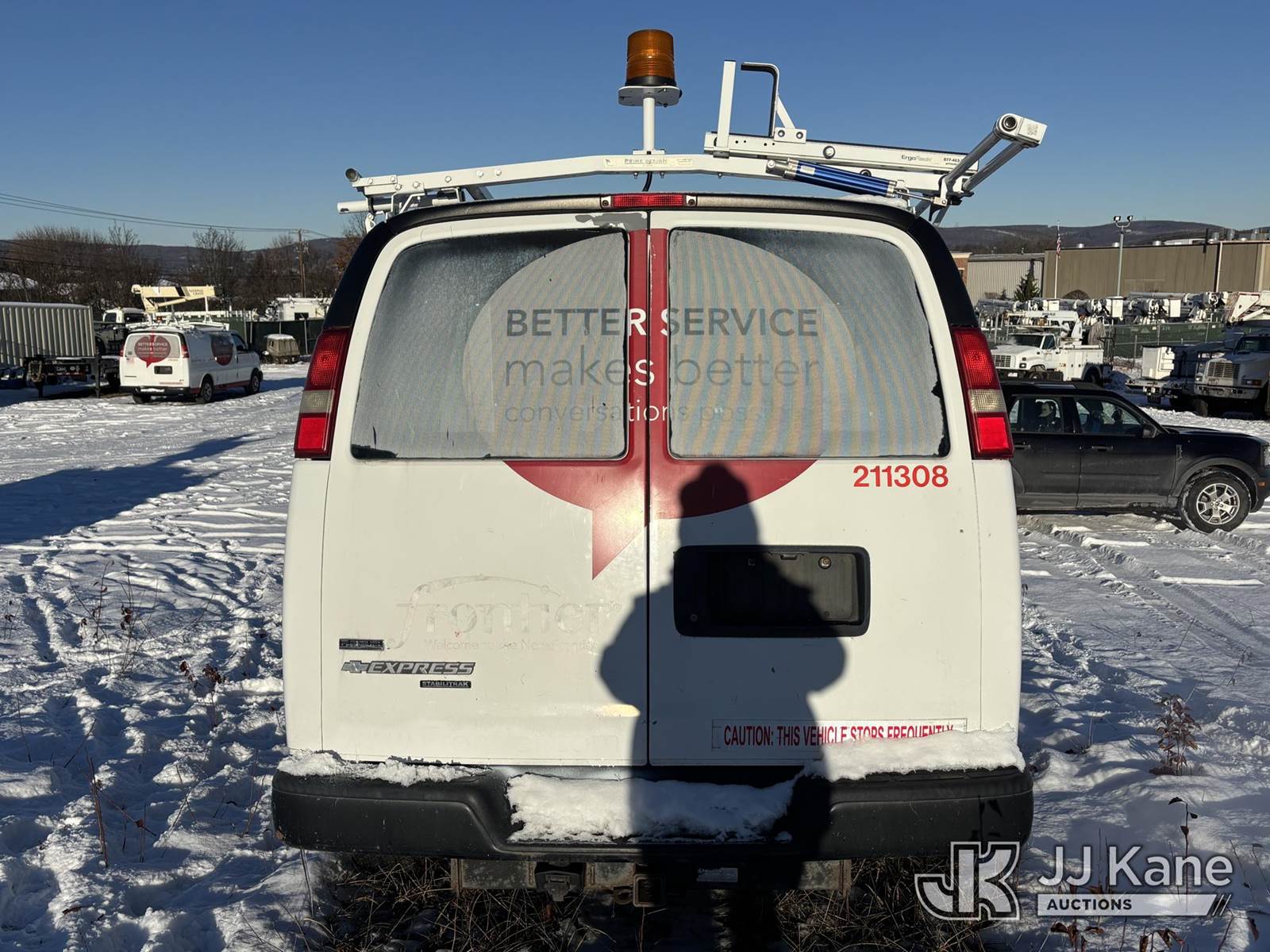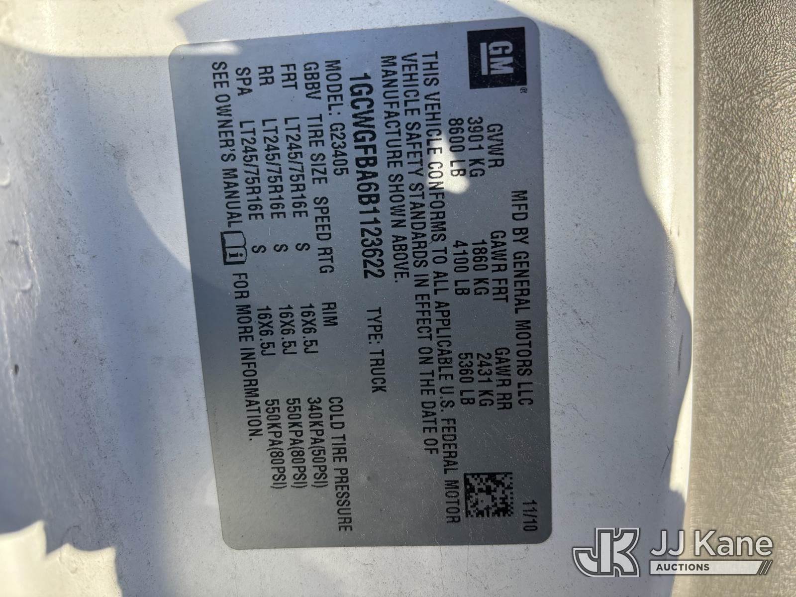 2011 Chevrolet Express G2500 Cargo Van, 8-cyl gas, Auto, A/C, with Inverter & Ladder Rack, (100,393 miles) (Runs & Moves) (Check Engine & TPS Light On Dash, Damaged Cargo Doors, Holes In Body, Body & Rust Damage) (Reads 6,116 hours) This is a Titled Item NOTE: This unit is being sold AS IS/WHERE IS via Timed Auction and is located in Plains, PA. For pre-sale questions, please contact Mary Darlington @ 570-899-4930 or Mary.Darlington@JJKane.com. JJ Kane Plains, PA yard is open for inspection on the Friday and Monday before the sale date from 9:00 am to 3:00 pm. REMOVAL: All items must be removed by 10 calendar days after the sale, Monday - Friday (Excluding Holidays). (Buyer is responsible for removal. Assistance by consignor or JJ Kane Auctions is not assured.)