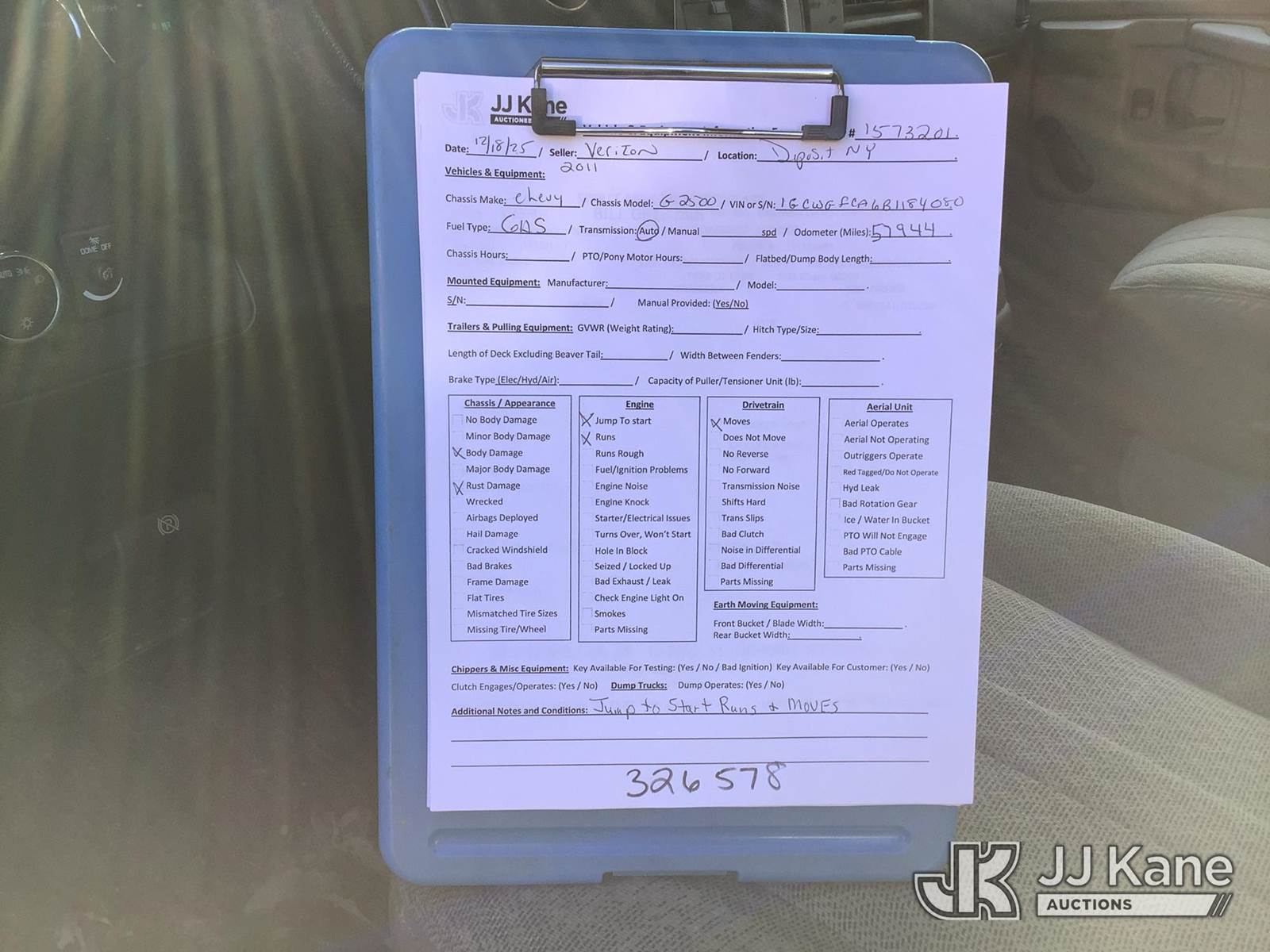 2011 Chevrolet Express G2500 Cargo Van, 8-cyl gas, Auto, A/C, (57,944 miles) (Jump to Start, Runs & Moves, ABS Light On, Body & Rust Damage) (Removal is by Appointment Only, Buyer MUST make a appointment prior to picking up, Buyer/Transporter Must have PAID IN FULL RELEASE. No onsite assistance available, Please Come prepared.) This is a Titled Item NOTE: This unit is being sold AS IS/WHERE IS via Timed Auction and is located in Deposit, NY. Inspection & preview days for this unit are by appointment only; please contact us at contact@jjkane.com or 84-Go-JJKane for more details. (Buyer is responsible for removal. Assistance by consignor or JJ Kane Auctions is not assured.)