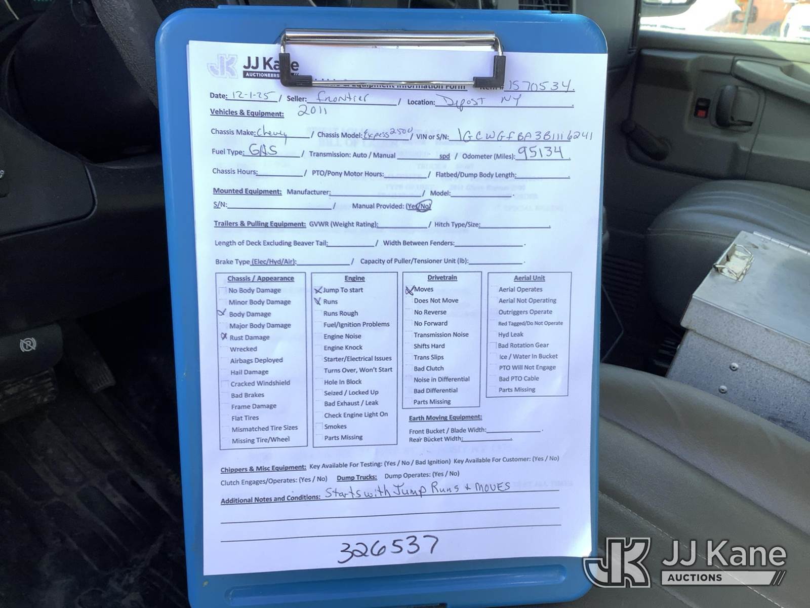 2011 Chevrolet Express G2500 Cargo Van, 8-cyl gas, Auto, A/C, (95,134 miles) (Runs & Moves) (Removal is by Appointment Only, Buyer MUST make a appointment prior to picking up, Buyer/Transporter Must have PAID IN FULL RELEASE. No onsite assistance available, Please Come prepared.) This is a Titled Item NOTE: This unit is being sold AS IS/WHERE IS via Timed Auction and is located in Deposit, NY. Inspection & preview days for this unit are by appointment only; please contact us at contact@jjkane.com or 84-Go-JJKane for more details. (Buyer is responsible for removal. Assistance by consignor or JJ Kane Auctions is not assured.)