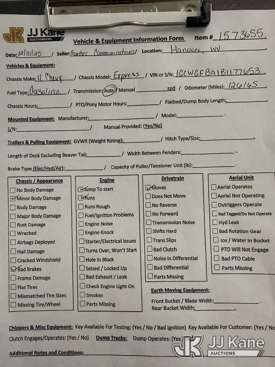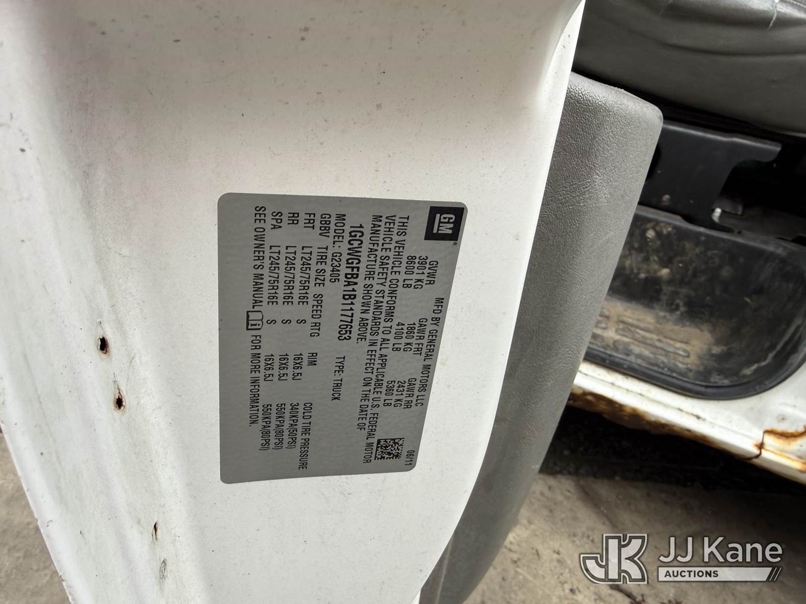 2011 Chevrolet Express G2500 Cargo Van, 4.8L V8 OHV 16V FFV gas, 6-Speed Automatic, RWD, A/C, (126,165 miles) (Runs & Moves) (Seller Red Tagged, Jump To Start, ABS Light On, Traction Control Light On, Bad Brakes, Body/Paint Damage) This is a Titled Item NOTE: This unit is being sold AS IS/WHERE IS via Timed Auction and is located in Hanover, WV. Inspection & preview days for this unit are by appointment only; please contact us at contact@jjkane.com or 84-Go-JJKane for more details. (Buyer is responsible for removal. Assistance by consignor or JJ Kane Auctions is not assured.)
