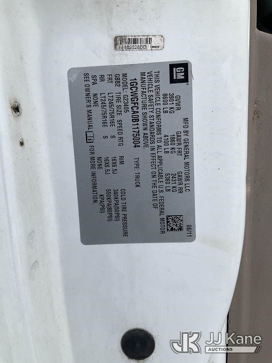 2011 Chevrolet Express G2500 Cargo Van, 8-cyl gas, Auto, A/C, (126,248 miles) (Jump To Start, Runs & Moves, Rust Damage ) This is a Titled Item NOTE: This unit is being sold AS IS/WHERE IS via Timed Auction and is located in Rome, NY. Inspection & preview days for this unit are the 2 business days prior to the first day of items closing for this auction, item is located at 5835 Success Dr Rome, NY 13440 and hours of operations are 8a-4p. For pre-sale questions, please contact Ryan Jackson @ (315) 749-3790 or Ryan.Jackson@jjkane.com. (Buyer is responsible for removal. Assistance by consignor or JJ Kane Auctions is not assured.)