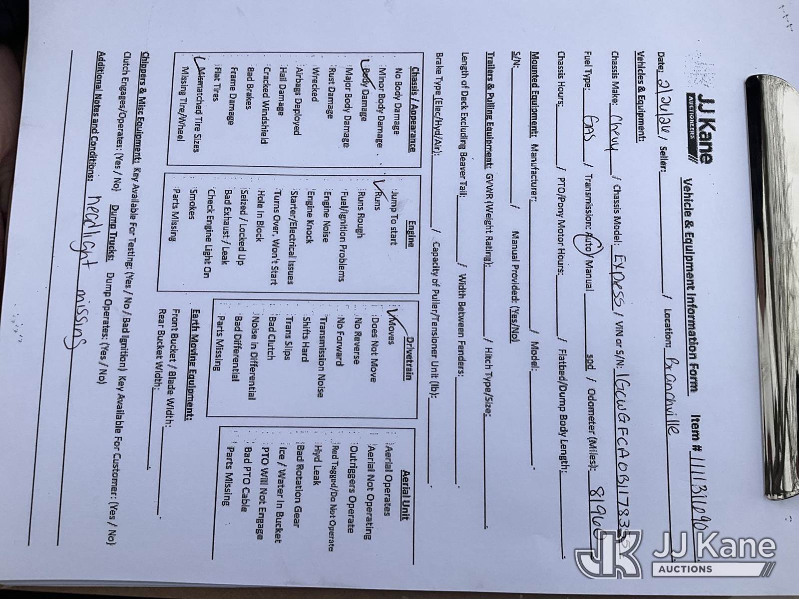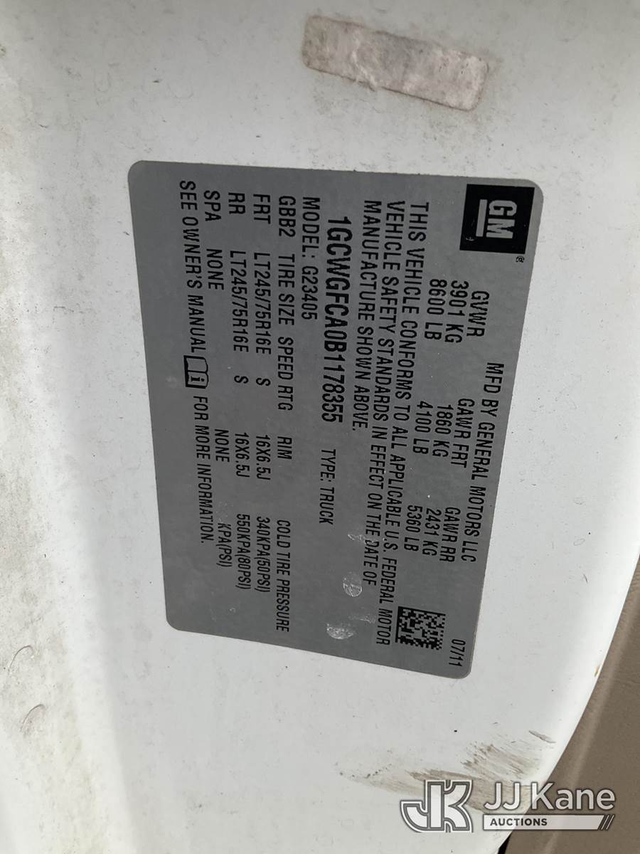 2011 Chevrolet Express G2500 Cargo Van, 8-cyl gas, Auto, A/C, (81,960 miles) (Runs & Moves, Missing Headlights) (Removal is by Appointment Only, Buyer MUST make a appointment prior to picking up, Buyer/Transporter Must have PAID IN FULL RELEASE. No onsite assistance available, Please Come prepared.) This is a Titled Item NOTE: This unit is being sold AS IS/WHERE IS via Timed Auction and is located in Branchville, NJ. Inspection & preview days for this unit are by appointment only; please contact us at contact@jjkane.com or 84-Go-JJKane for more details. For pre-sale questions, please contact the on-site office @ (973) 948-2026 or wtrbranchville@gmail.com. (Buyer is responsible for removal. Assistance by consignor or JJ Kane Auctions is not assured.)