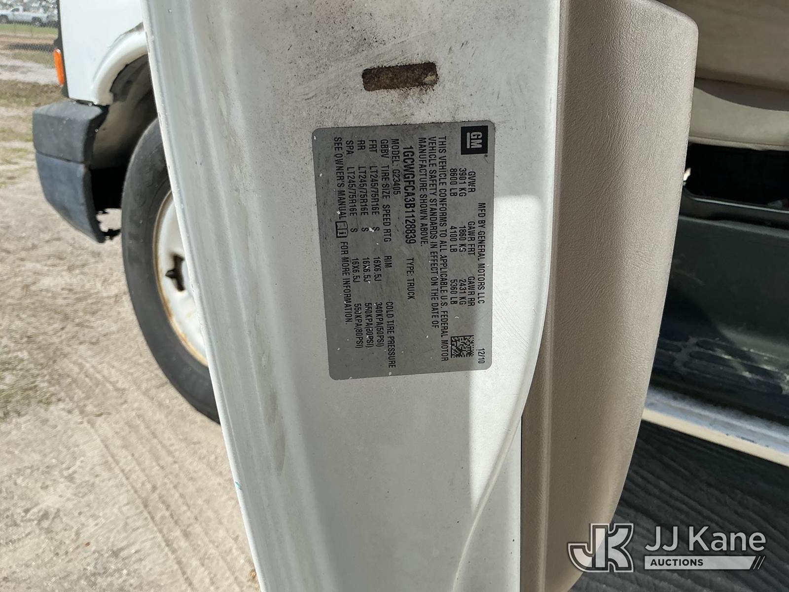 2011 Chevrolet Express G2500 Cargo Van, 4.8L V8 OHV 16V FFV gas, RWD, 6-Speed Automatic, A/C, (106,571 miles) (Runs & Moves) (Jump To Start, Won’t Stay Running, Paint Damage) (FL Residents Purchasing Titled Items – tax, title & registration fees will be collected at the maximum rate of $400.00 under 25,999 and $800.00 for Over 26,000 and $250.00 trailers – Proof of insurance is mandatory; Out of State Residents Purchasing Title Items – tax will be collected based upon your state rate.) This is a Titled Item NOTE: This unit is being sold AS IS/WHERE IS via Timed Auction and is located in Thonotosassa, FL. Inspection & preview days for this unit are the 2 business days prior to the first day of items closing for this auction, item is located at 11720 N US 301 Thonotosassa, Fl 33592 and hours of operations are 8a-4p. For pre-sale questions, please contact Office Staff @ (813) 986-2485. (Buyer is responsible for removal. Assistance by consignor or JJ Kane Auctions is not assured.)