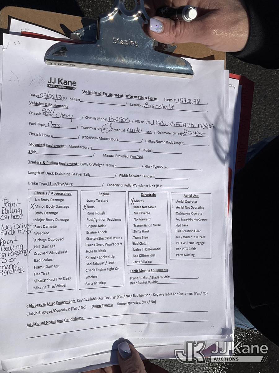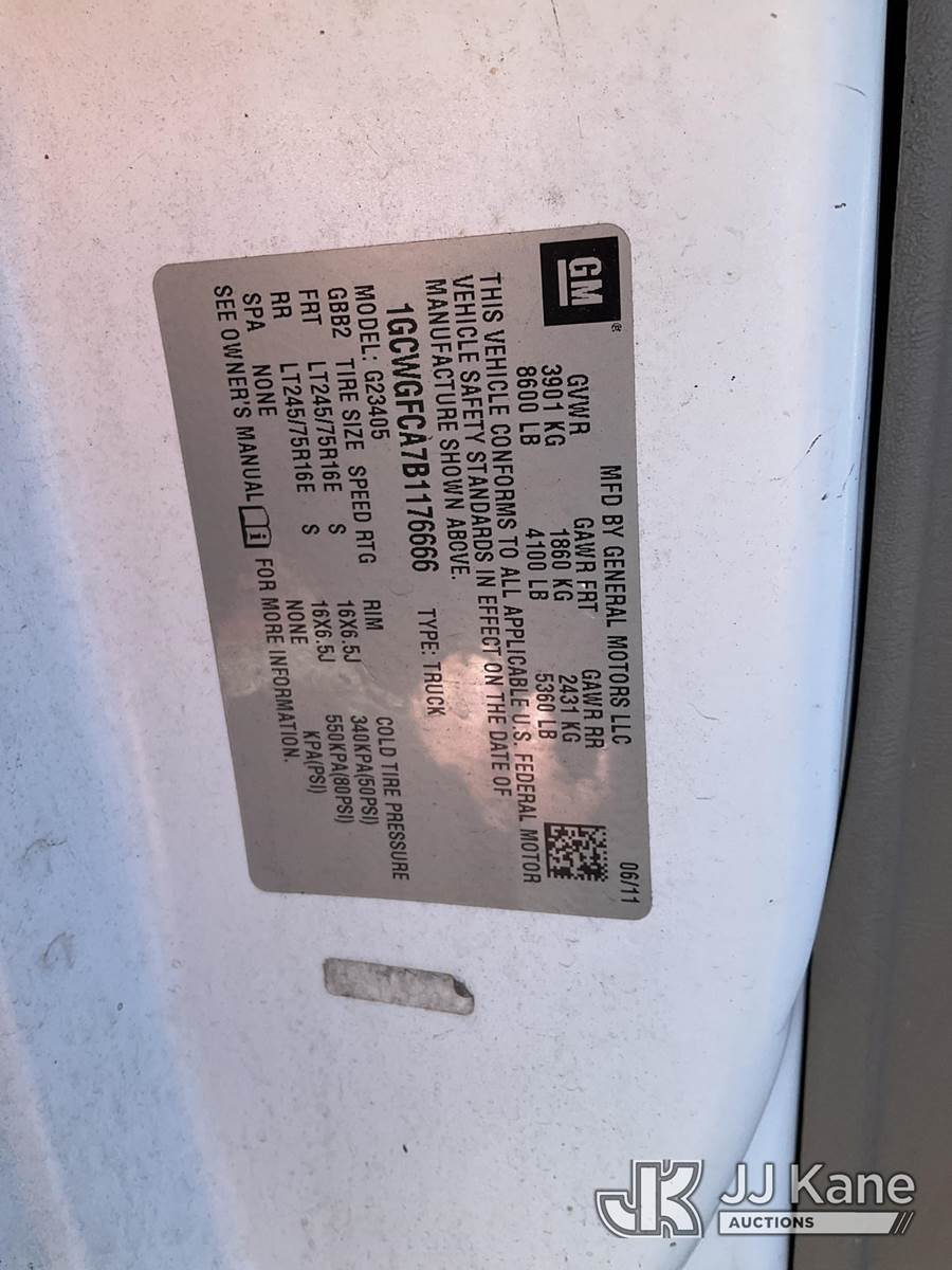 2011 Chevrolet Express G2500 Cargo Van, 8-cyl gas, Auto, A/C, (82,405 miles) (Runs & Moves) (Removal is by Appointment Only, Buyer MUST make a appointment prior to picking up, Buyer/Transporter Must have PAID IN FULL RELEASE. No onsite assistance available, Please Come prepared.) This is a Titled Item NOTE: This unit is being sold AS IS/WHERE IS via Timed Auction and is located in Branchville, NJ. Inspection & preview days for this unit are by appointment only; please contact us at contact@jjkane.com or 84-Go-JJKane for more details. For pre-sale questions, please contact the on-site office @ (973) 948-2026 or wtrbranchville@gmail.com. (Buyer is responsible for removal. Assistance by consignor or JJ Kane Auctions is not assured.)