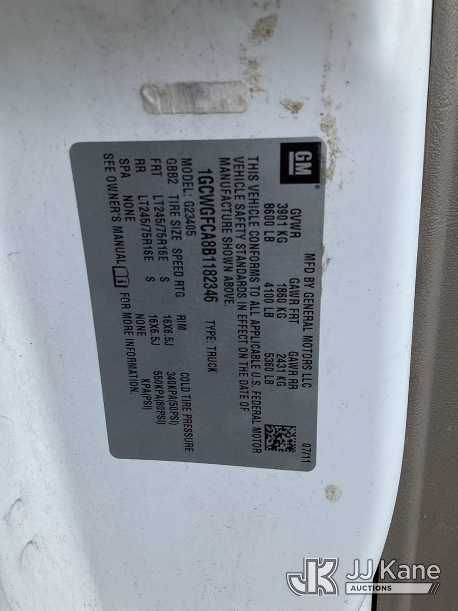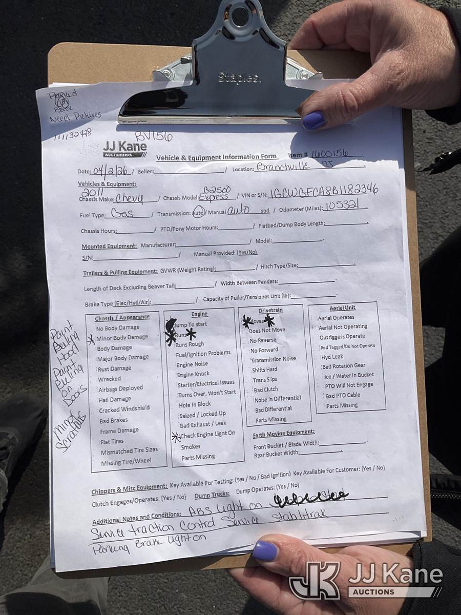 2011 Chevrolet Express G2500 Cargo Van, 8-cyl gas, Auto, A/C, (105,321 miles) (Runs & Moves, Engine Light On) (Removal is by Appointment Only, Buyer MUST make a appointment prior to picking up, Buyer/Transporter Must have PAID IN FULL RELEASE. No onsite assistance available, Please Come prepared.) This is a Titled Item NOTE: This unit is being sold AS IS/WHERE IS via Timed Auction and is located in Branchville, NJ. Inspection & preview days for this unit are by appointment only; please contact us at contact@jjkane.com or 84-Go-JJKane for more details. For pre-sale questions, please contact the on-site office @ (973) 948-2026 or wtrbranchville@gmail.com. (Buyer is responsible for removal. Assistance by consignor or JJ Kane Auctions is not assured.)