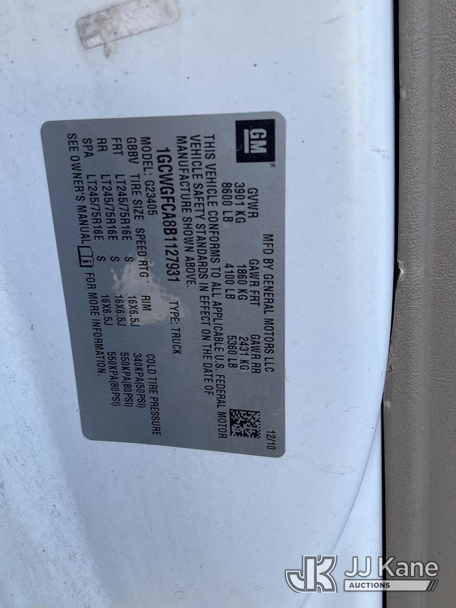 2011 Chevrolet G2500 Cargo Van, 8-cyl gas, Auto, A/C, (71,527 miles) (needs tow) This is a Titled Item NOTE: This unit is being sold AS IS/WHERE IS via Timed Auction and is located in Branchville, NJ. Inspection & preview days for this unit are by appointment only; please contact us at contact@jjkane.com or 84-Go-JJKane for more details. For pre-sale questions, please contact the on-site office @ (973) 948-2026 or wtrbranchville@gmail.com. (Buyer is responsible for removal. Assistance by consignor or JJ Kane Auctions is not assured.)