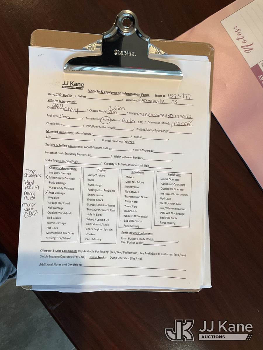 2011 Chevrolet G2500 Cargo Van, 8-cyl gas, Auto, A/C, (112,028 miles) (Runs & Moves) (Engine Light On, Jump To Start, Minor Body Damage, Rust Damage, Needs Tow) This is a Titled Item NOTE: This unit is being sold AS IS/WHERE IS via Timed Auction and is located in Branchville, NJ. Inspection & preview days for this unit are by appointment only; please contact us at contact@jjkane.com or 84-Go-JJKane for more details. For pre-sale questions, please contact the on-site office @ (973) 948-2026 or wtrbranchville@gmail.com. (Buyer is responsible for removal. Assistance by consignor or JJ Kane Auctions is not assured.)