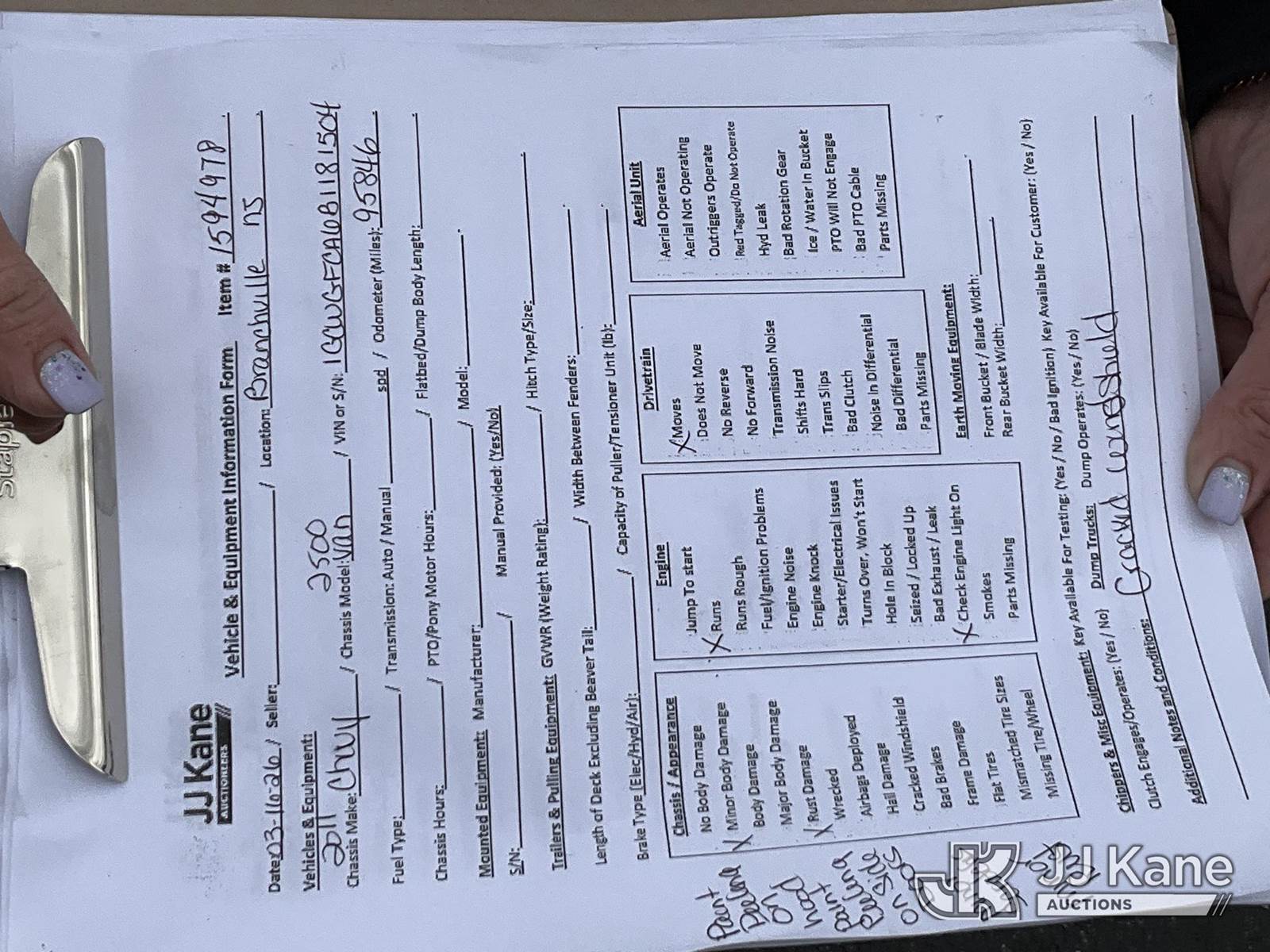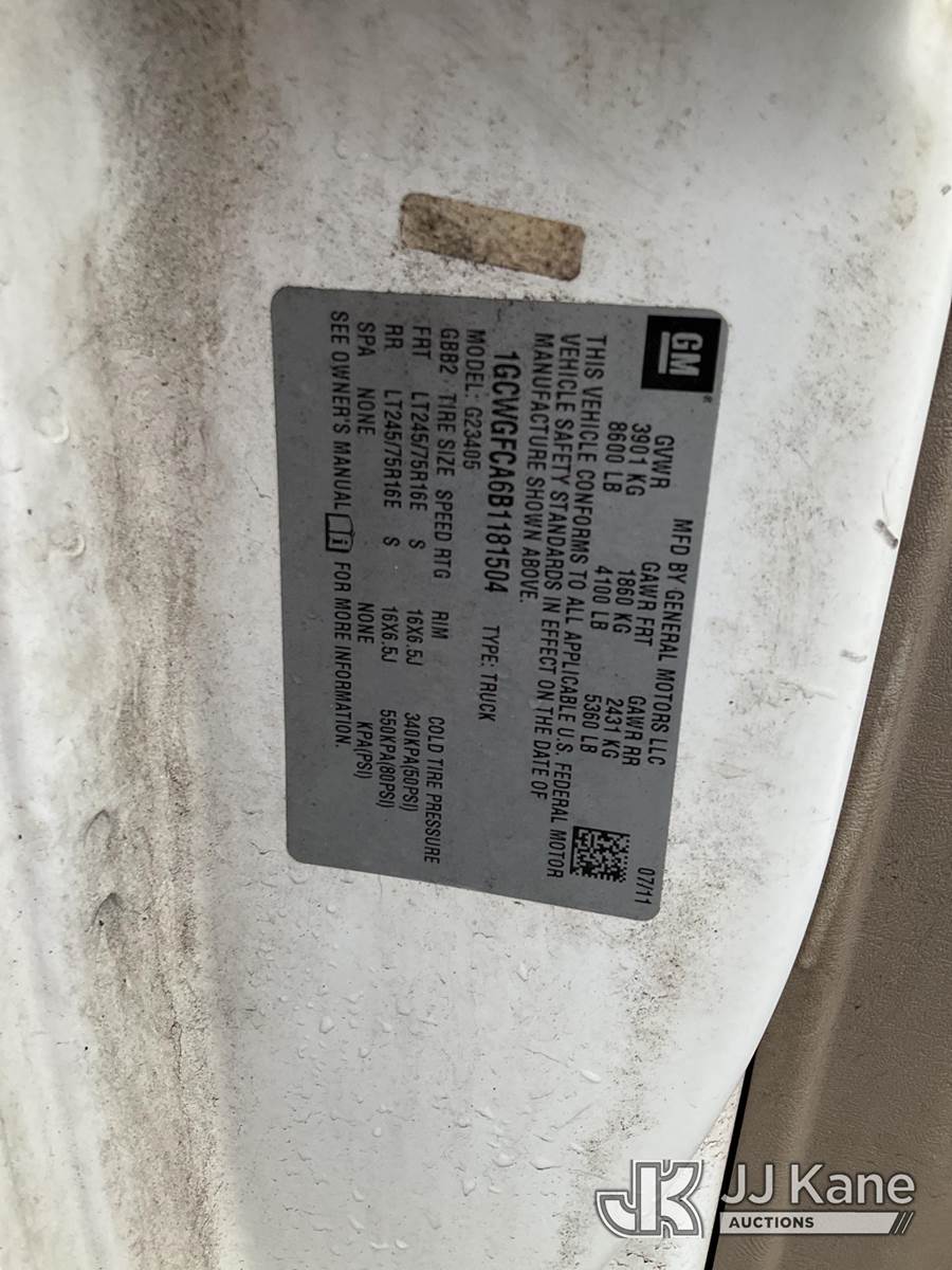 2011 Chevrolet G2500 Cargo Van, 8-cyl gas, Auto, A/C, (95,846 miles) (Runs & Moves) (Engine Light On, Minor Body Damage, Rust Damage, Cracked Windshield, Needs Tow) This is a Titled Item NOTE: This unit is being sold AS IS/WHERE IS via Timed Auction and is located in Branchville, NJ. Inspection & preview days for this unit are by appointment only; please contact us at contact@jjkane.com or 84-Go-JJKane for more details. For pre-sale questions, please contact the on-site office @ (973) 948-2026 or wtrbranchville@gmail.com. (Buyer is responsible for removal. Assistance by consignor or JJ Kane Auctions is not assured.)
