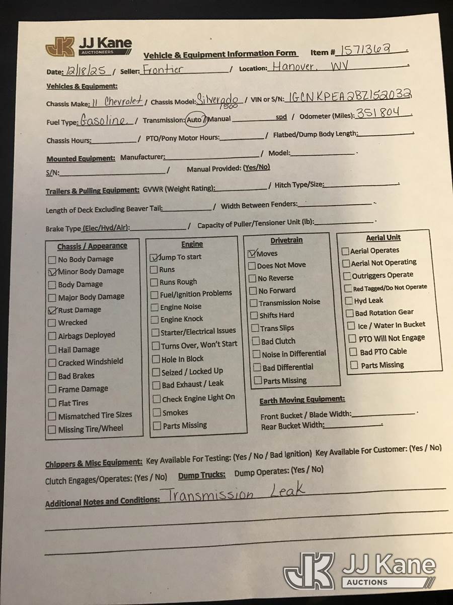 2011 Chevrolet Silverado 1500 4x4 Pickup Truck, 6-cyl gas, Auto, A/C, (351,804 miles) (Runs & Moves, Jump to Start, Body & Rust Damage, Transmission Oil Leak) This is a Titled Item NOTE: This unit is being sold AS IS/WHERE IS via Timed Auction and is located in Hanover, WV. Inspection & preview days for this unit are by appointment only; please contact us at contact@jjkane.com or 84-Go-JJKane for more details. (Buyer is responsible for removal. Assistance by consignor or JJ Kane Auctions is not assured.)